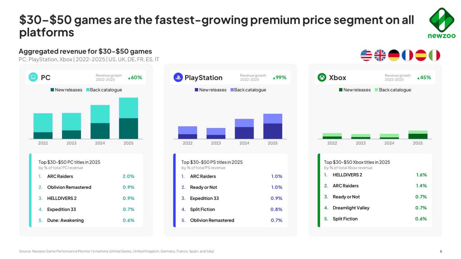 Newzoo’s 2026 PC and console gaming report highlights game sales across the 3 major platforms: PC, PlayStation, and Xbox. A big chunk of their recent revenue came from $30-$50 games, making them the fastest-growing segment.