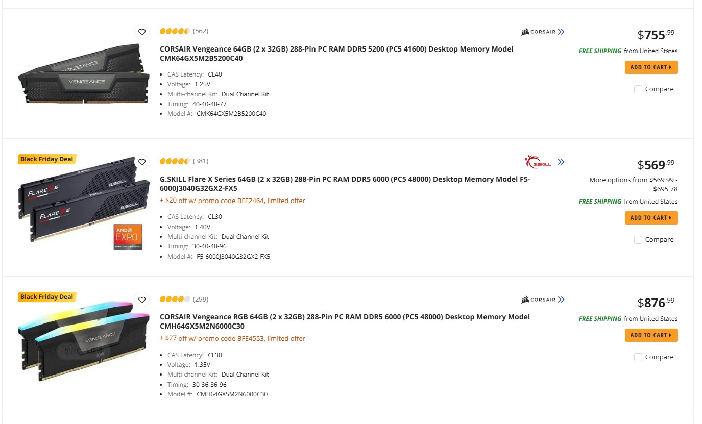 The pricing for DDR5 64 GB RAM kits is the same as for many other listings on Newegg and Amazon, and it is expected to get worse in the future. For example, the Corsair Vengeance 64 GB RAM Kit is being sold at a staggering $755 on Newegg.