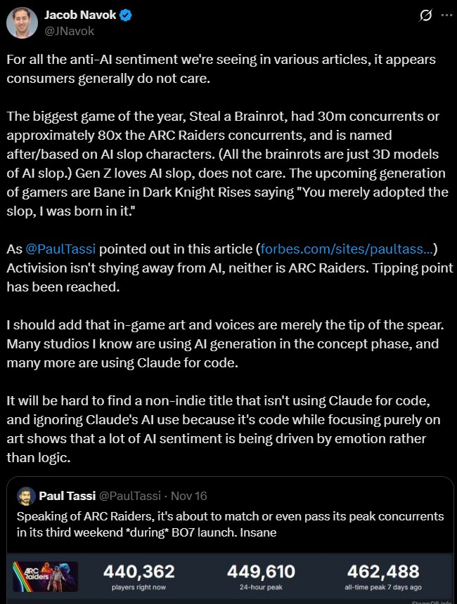 - He uses the example of multiple games like Steal a Brainrot and Arc Raiders to say most gamers are fine with AI.