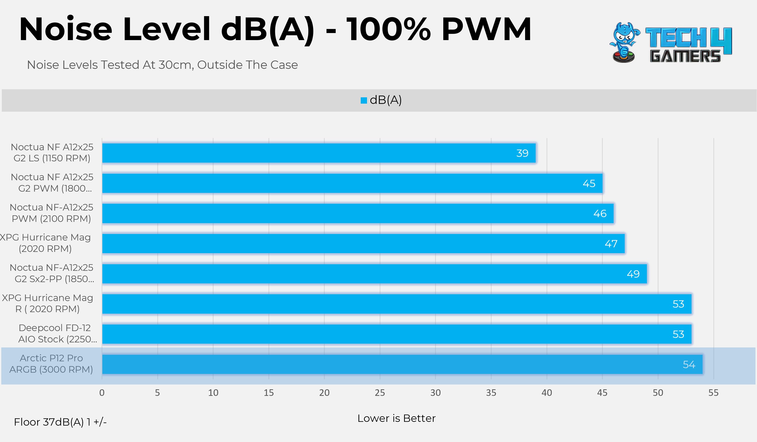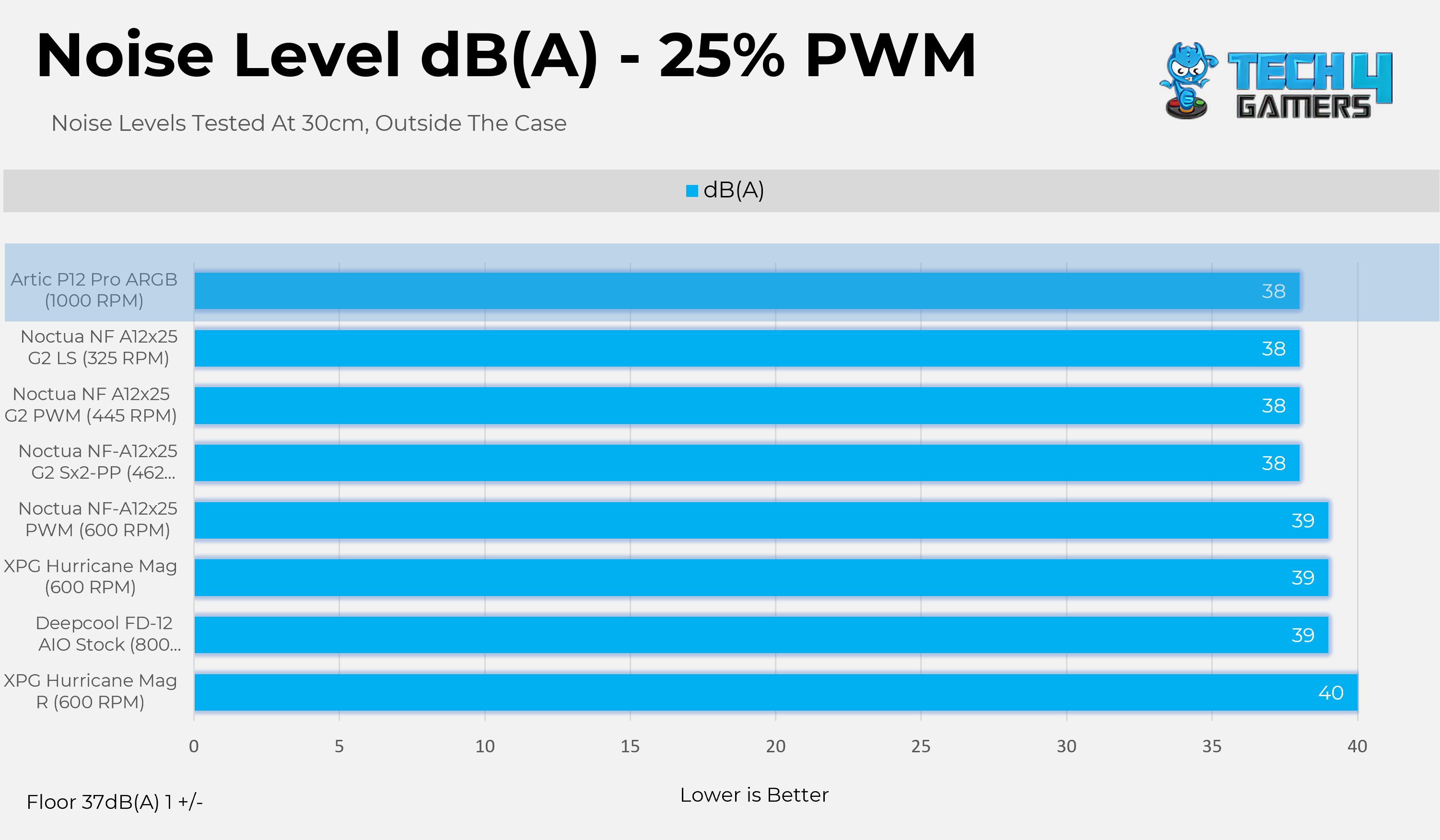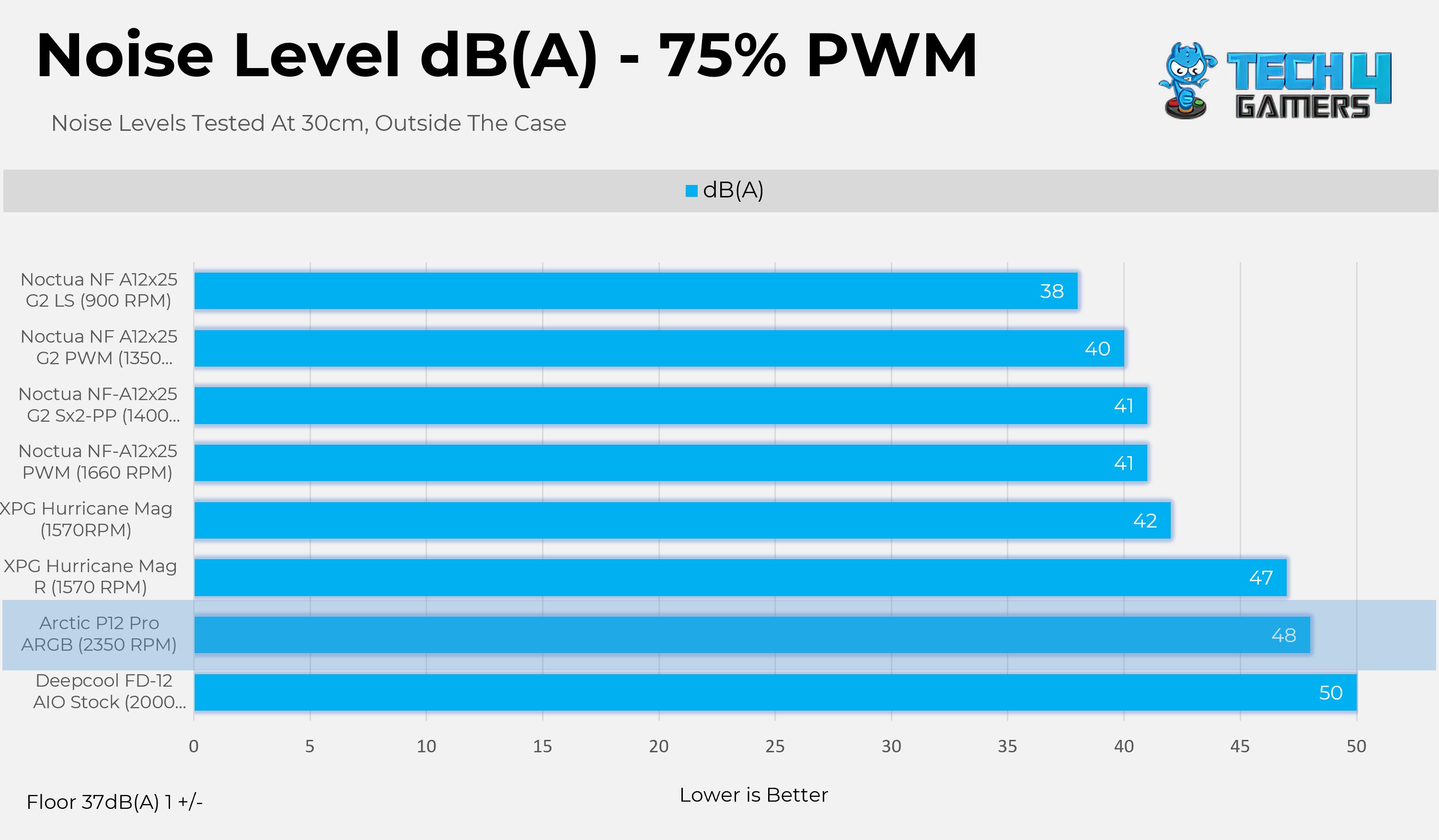 - We’ll test the fans’ noise performance at the four sets of PWM levels 25%, 50%, 75% and 100%. The fan noise is measured outside the case at a distance of 30cm.