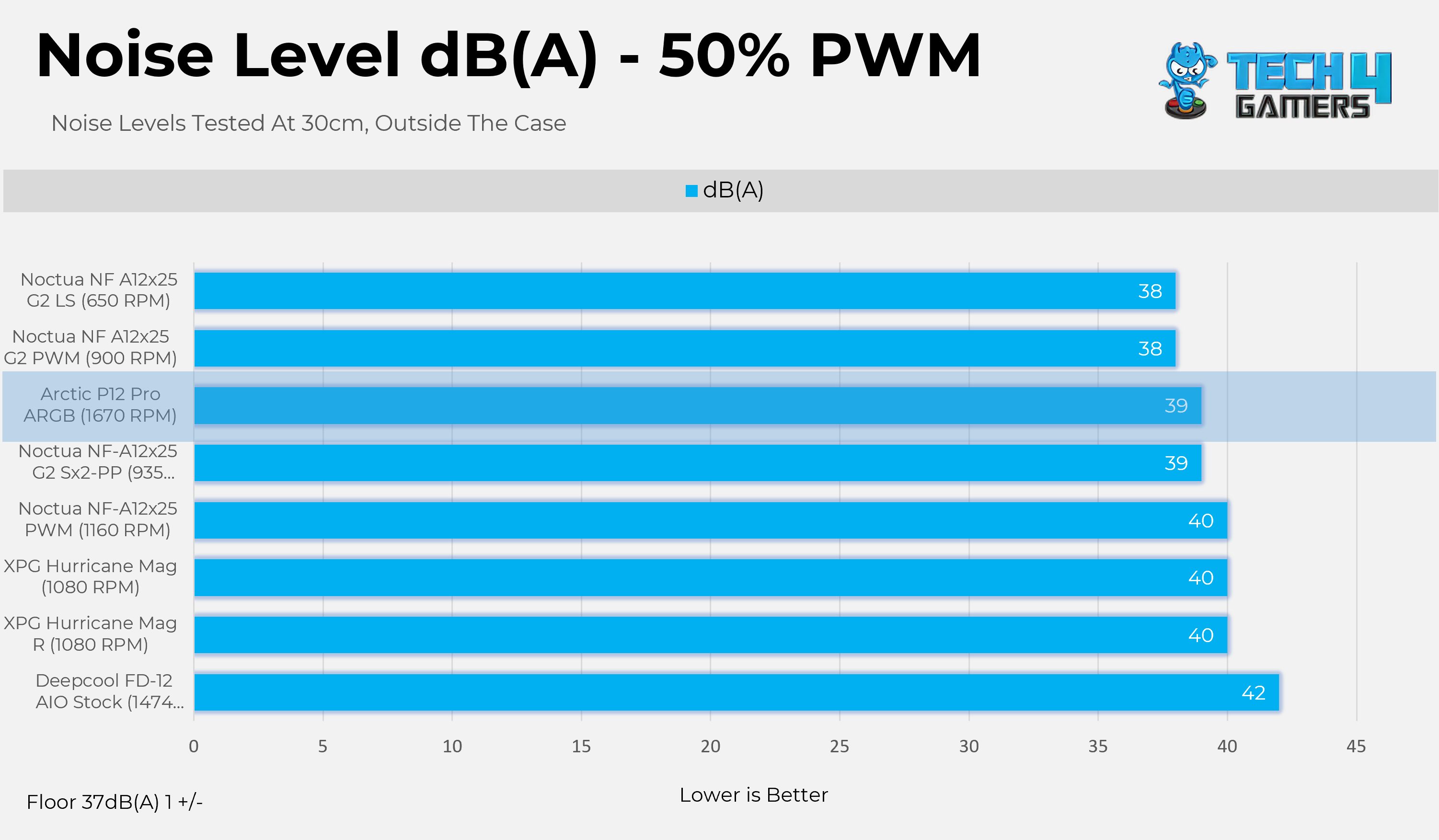 I have some mixed thoughts about the Noise performance. These fans are roaring at high RPM, but they’re extremely silent at certain PWM levels, such as 50%, where they spin at 1670 RPM. If we compare it to the Noctua NF-A12x25 G2 PWM, it’s around 78% ahead at almost identical noise levels in terms of rotation per minute (RPM). It seems Arctic has done some black magic here, where no other fan comes close to them, especially at this price.