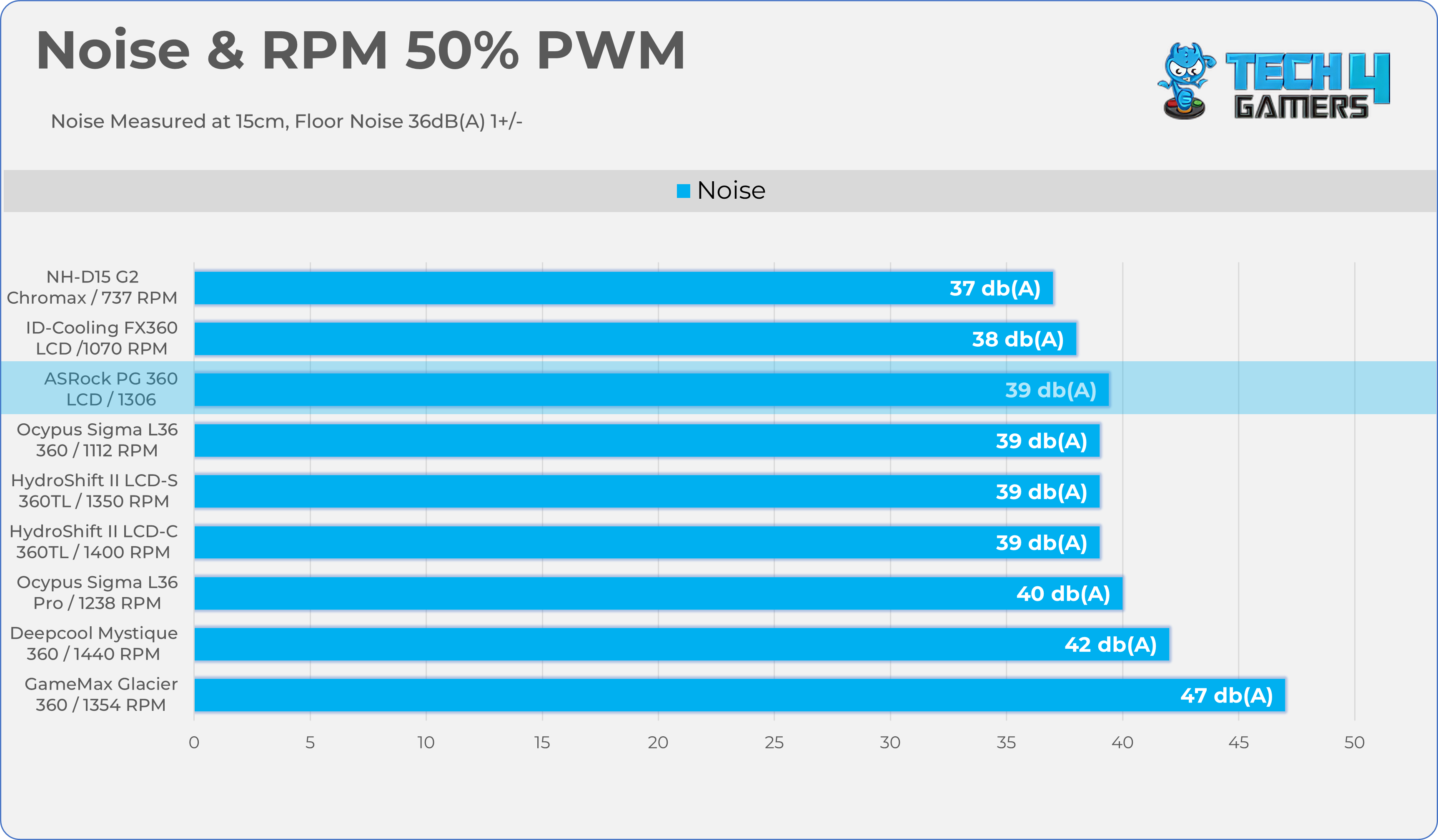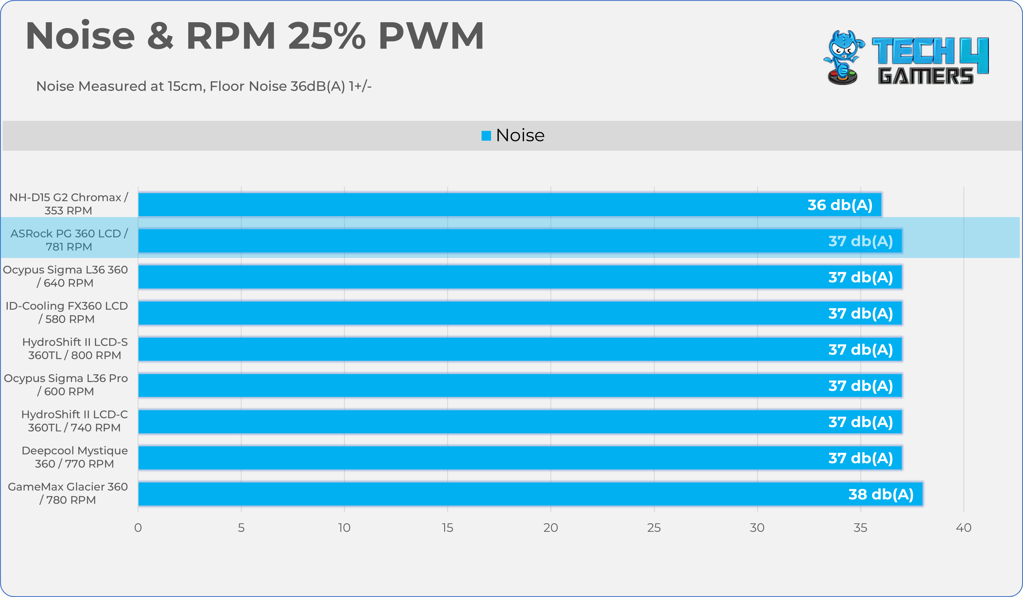 Here is the structured table illustrating fan noise levels at various PWM percentages. The Floor Noise Level is 36dB(A).