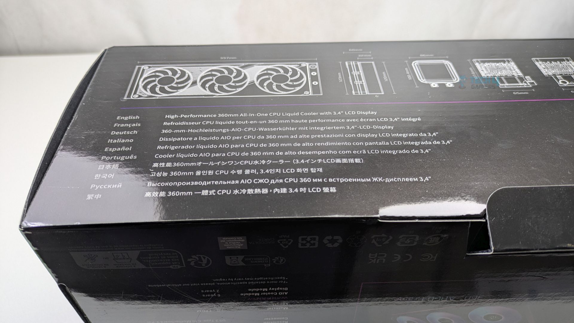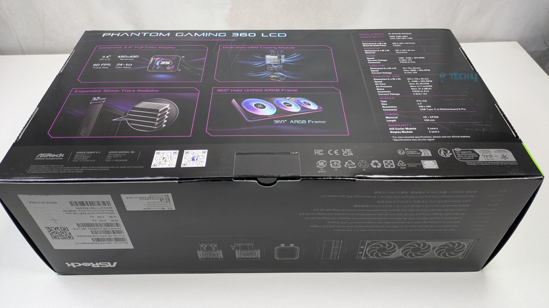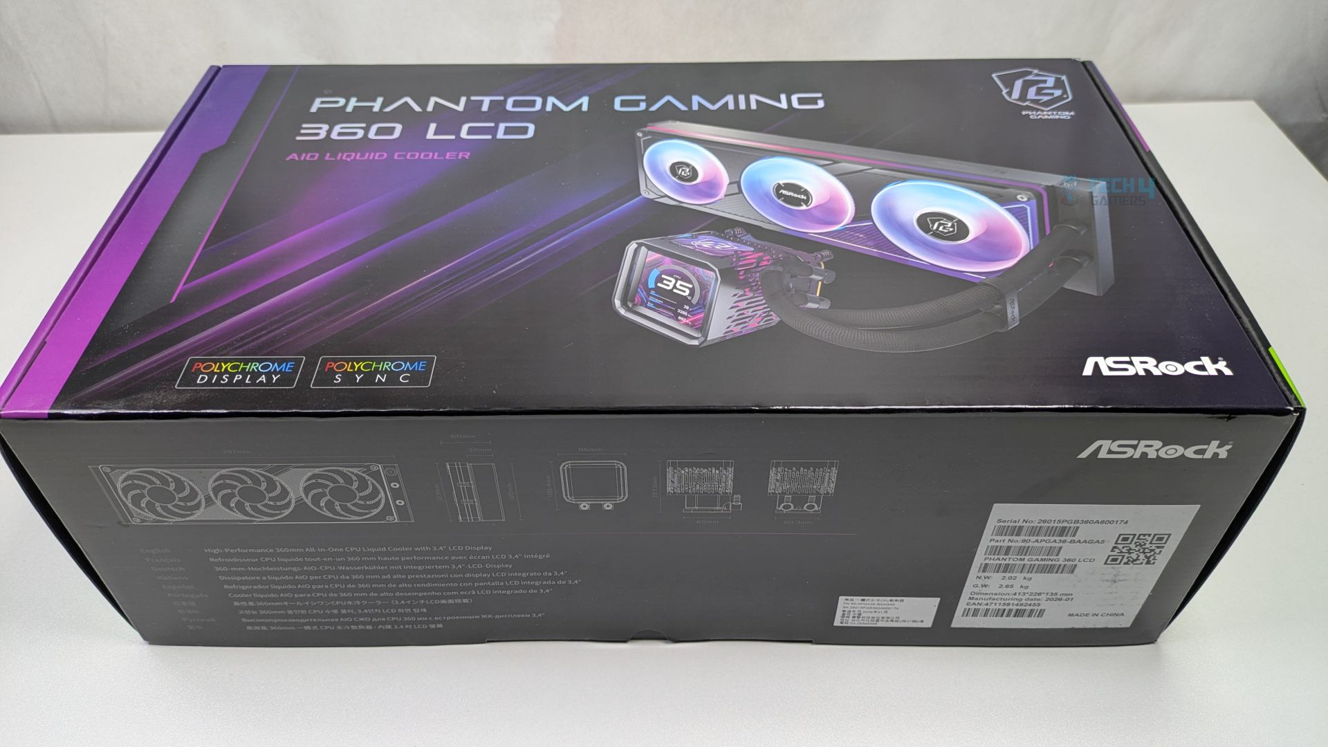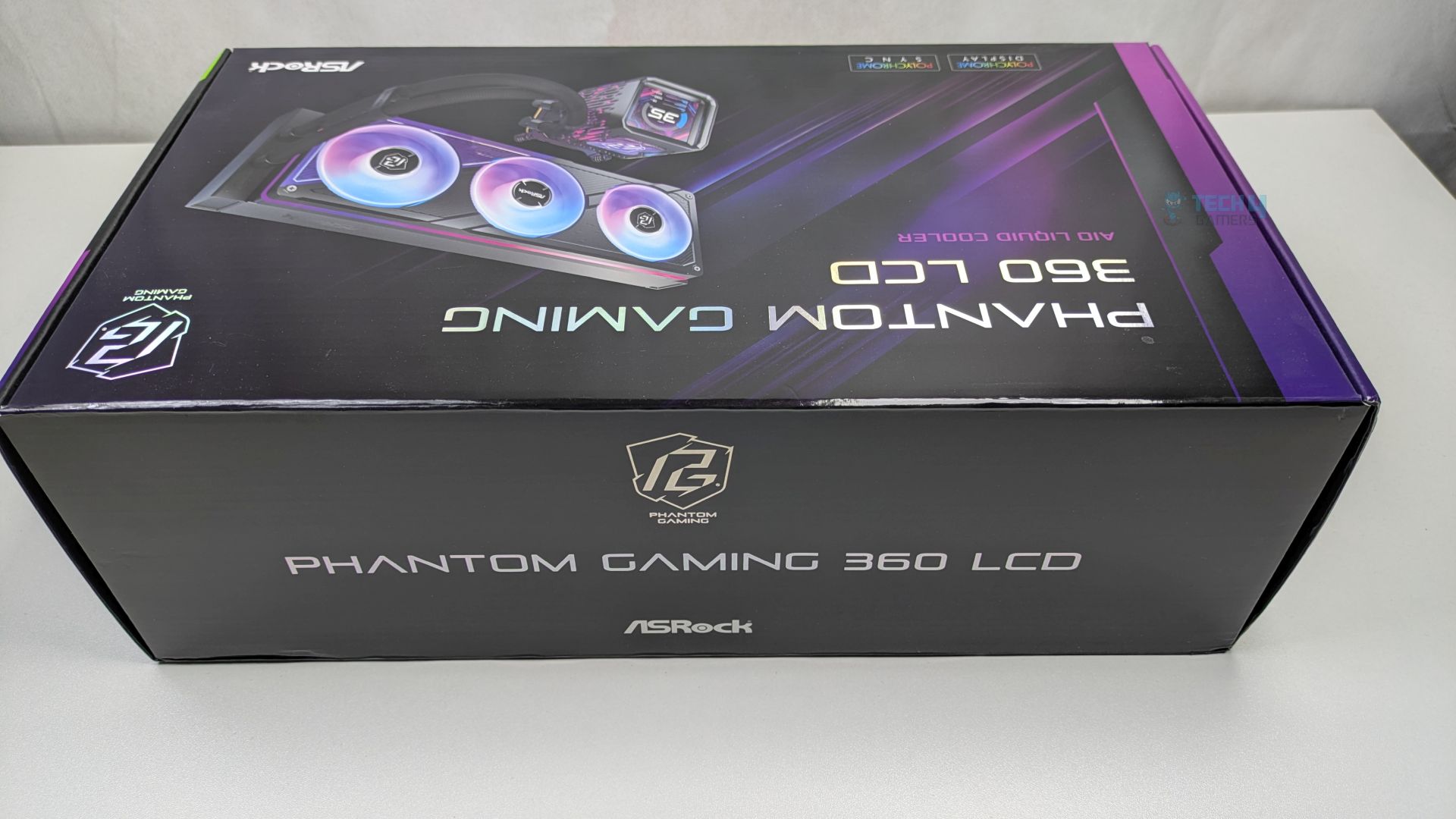 ASRock Phantom Gaming 360 LCD has opted for a premium packaging which leans heavily on the Phantom Gaming visual language. The box features a dark and sleek colour scheme. The front provides a clear render of the all-in-one liquid cooler, highlighting its main selling points: the daisy-chained ARGB fans and the customizable LCD screen. The ASRock badges, such as “Polychrome Sync and Display,” are clearly visible.