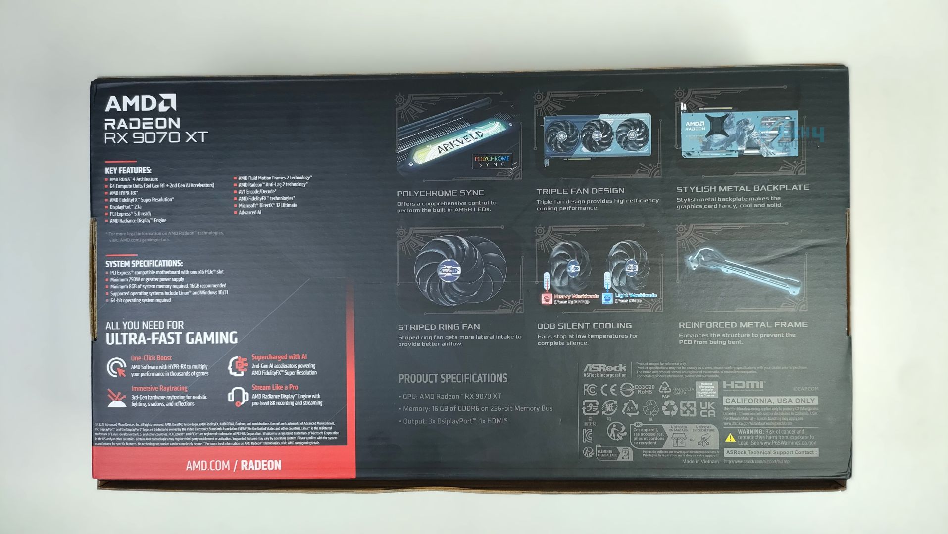 ASRock Radeon RX 9070XT Monster Hunter Wilds Edition arrives in a thick corrugated cardboard box with a Monster Hunter Wilds artwork striking at the front. The branding looks clean and visually appealing. The ASRock Logo, GPU Model, and the 16GB VRAM badges are clearly visible at the front, and we also get a free copy of the game and a redeemable card included in the packaging. On the back of the box, key features of the GPU architecture are highlighted, and ASRock Exclusive features are also demonstrated, including support for Polychrome RGB Sync, Triple Fan Design, Metal Backplate, Stripped Ring Fan with 0dB Silent Cooling, and a reinforced metal frame. The back of the box lists the card’s standard specifications; there is nothing fancy except the front box artwork.