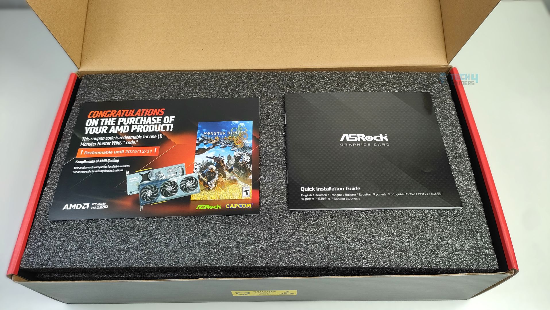 Inside, the GPU is secured with a thick, high-density foam. No additional accessories are included except the manual and the Coupon Card. Though I would like at least some extra Monster Hunter Wilds figurines, or at least some stickers.