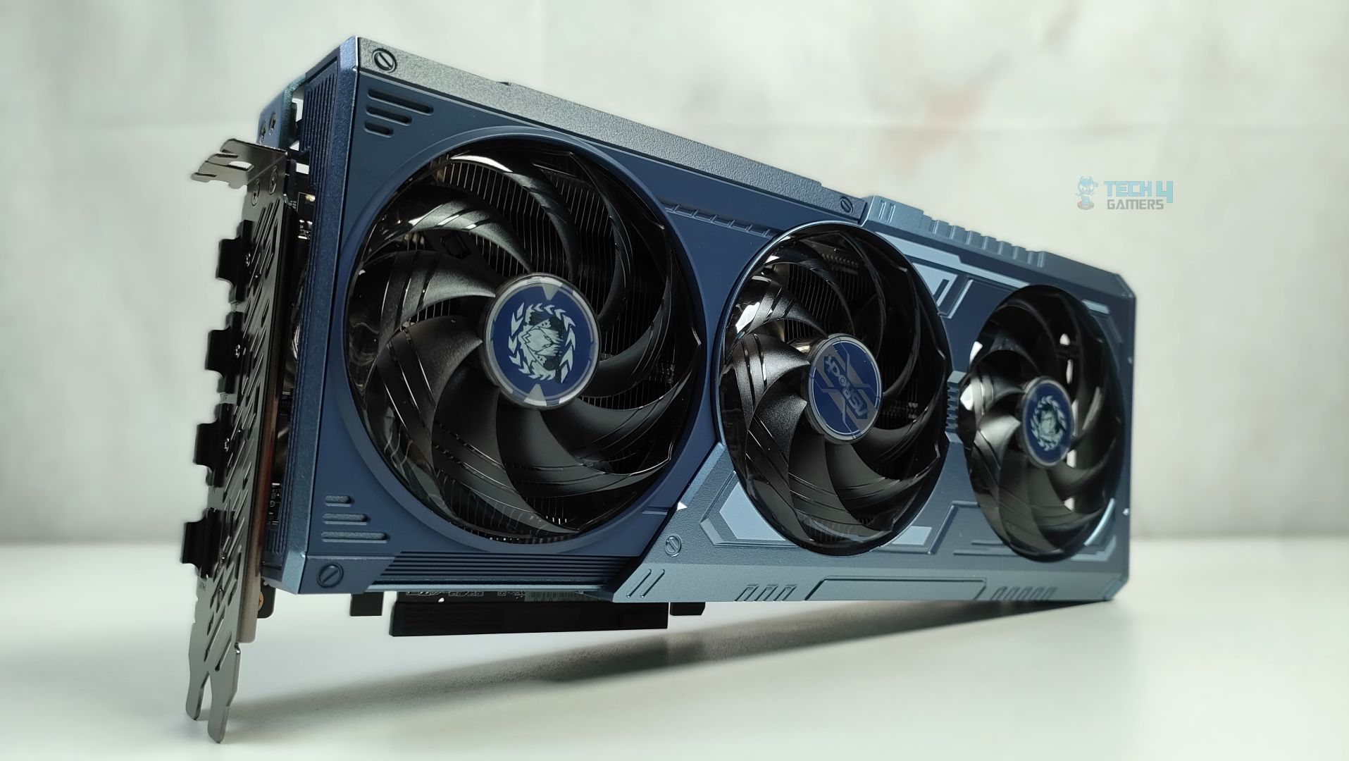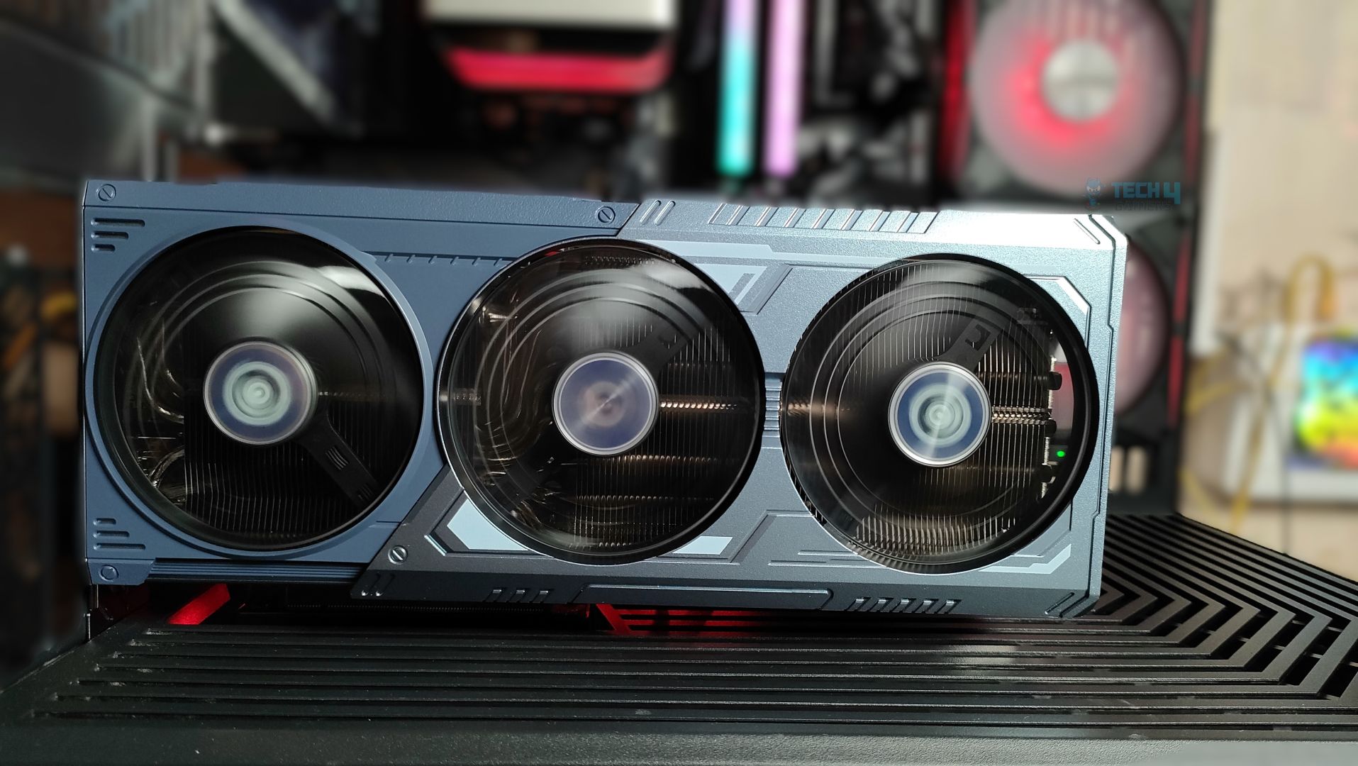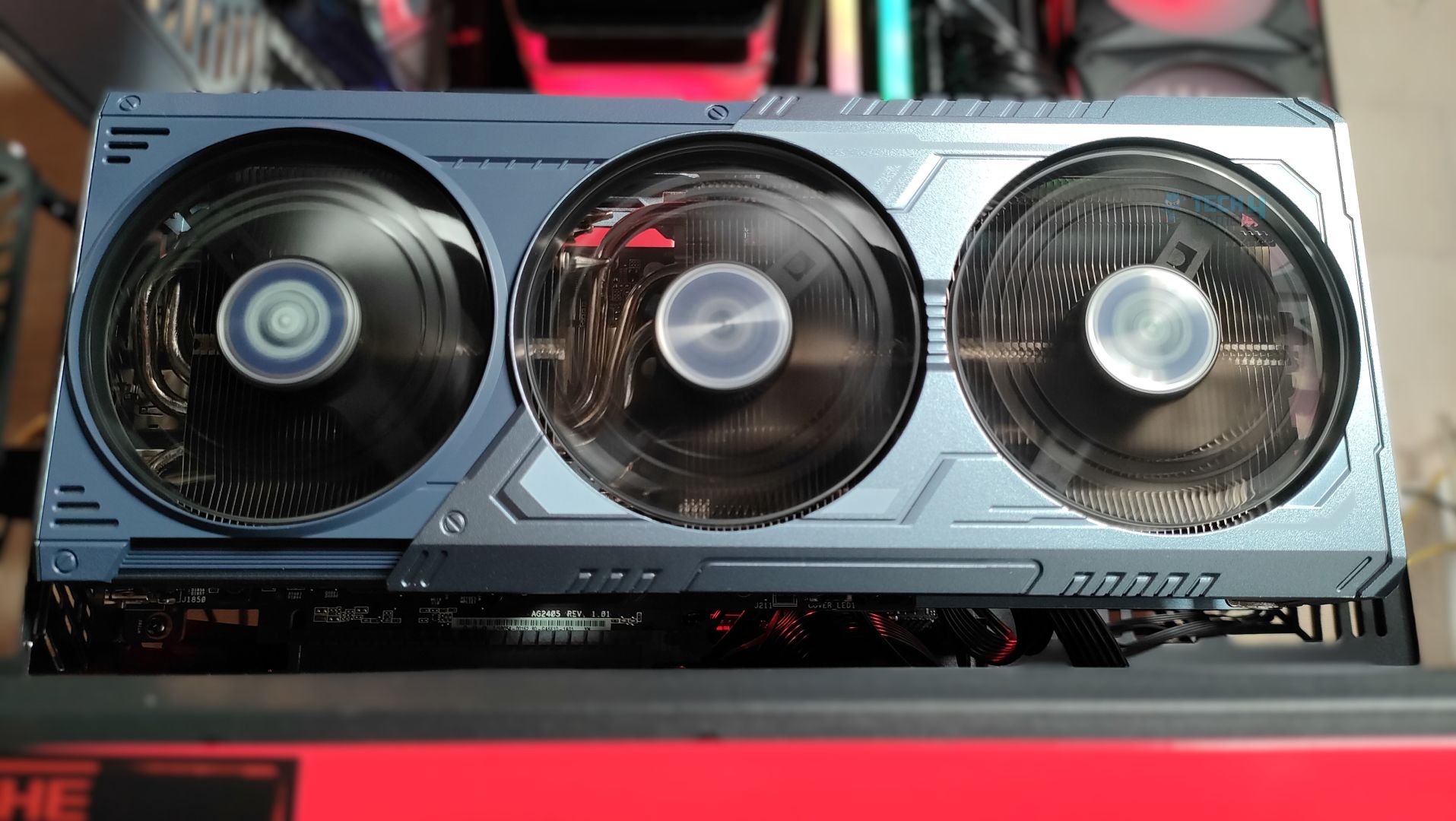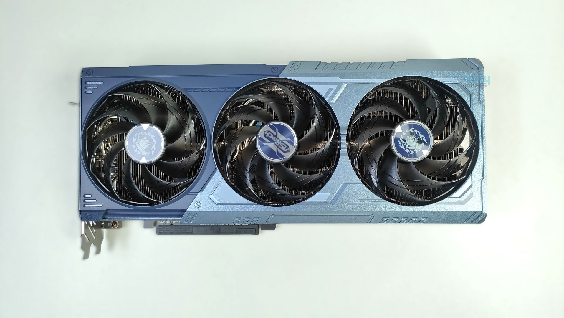 Taking a first look at the GPU now, starting from the front. This GPU features a three-ring striped fan design that supports stop-fan technology when the GPU is running at idle. The center fan rotates in the opposite direction, which could help reduce turbulence. The GPU uses a sophisticated Mystic Blue scheme at the front. The back plate is the show’s main highlight. It’s a full-length metal backplate showcasing the Arkveld’s high-quality network.