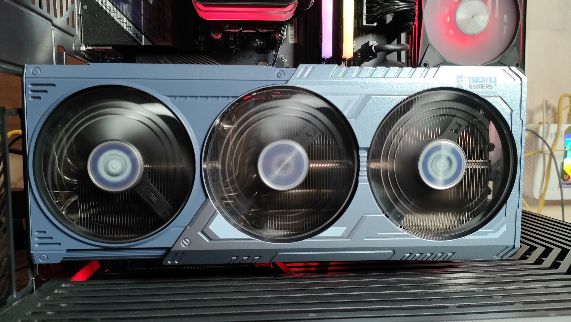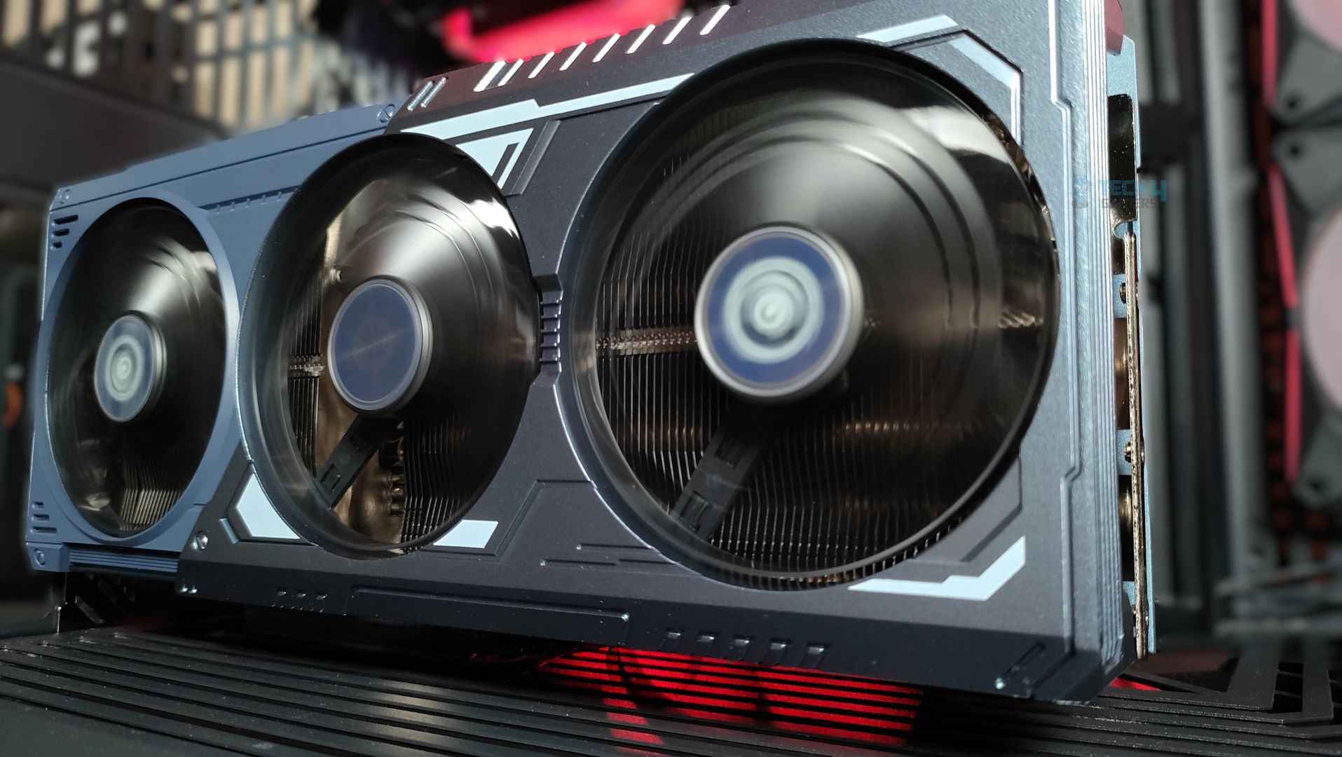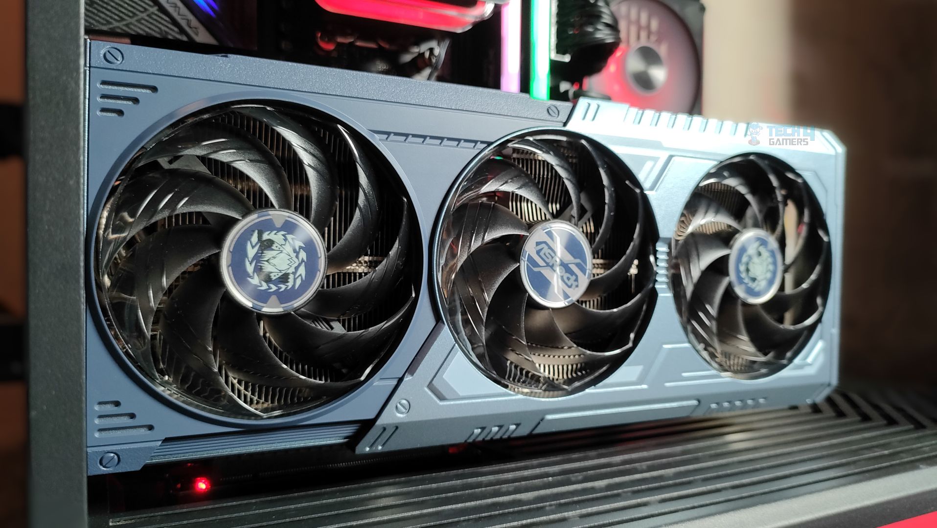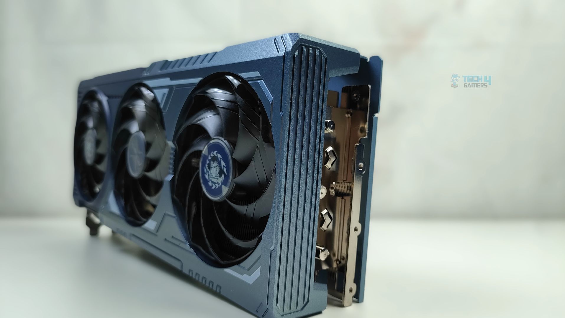 Taking a first look at the GPU now, starting from the front. This GPU features a three-ring striped fan design that supports stop-fan technology when the GPU is running at idle. The center fan rotates in the opposite direction, which could help reduce turbulence. The GPU uses a sophisticated Mystic Blue scheme at the front. The back plate is the show’s main highlight. It’s a full-length metal backplate showcasing the Arkveld’s high-quality network.