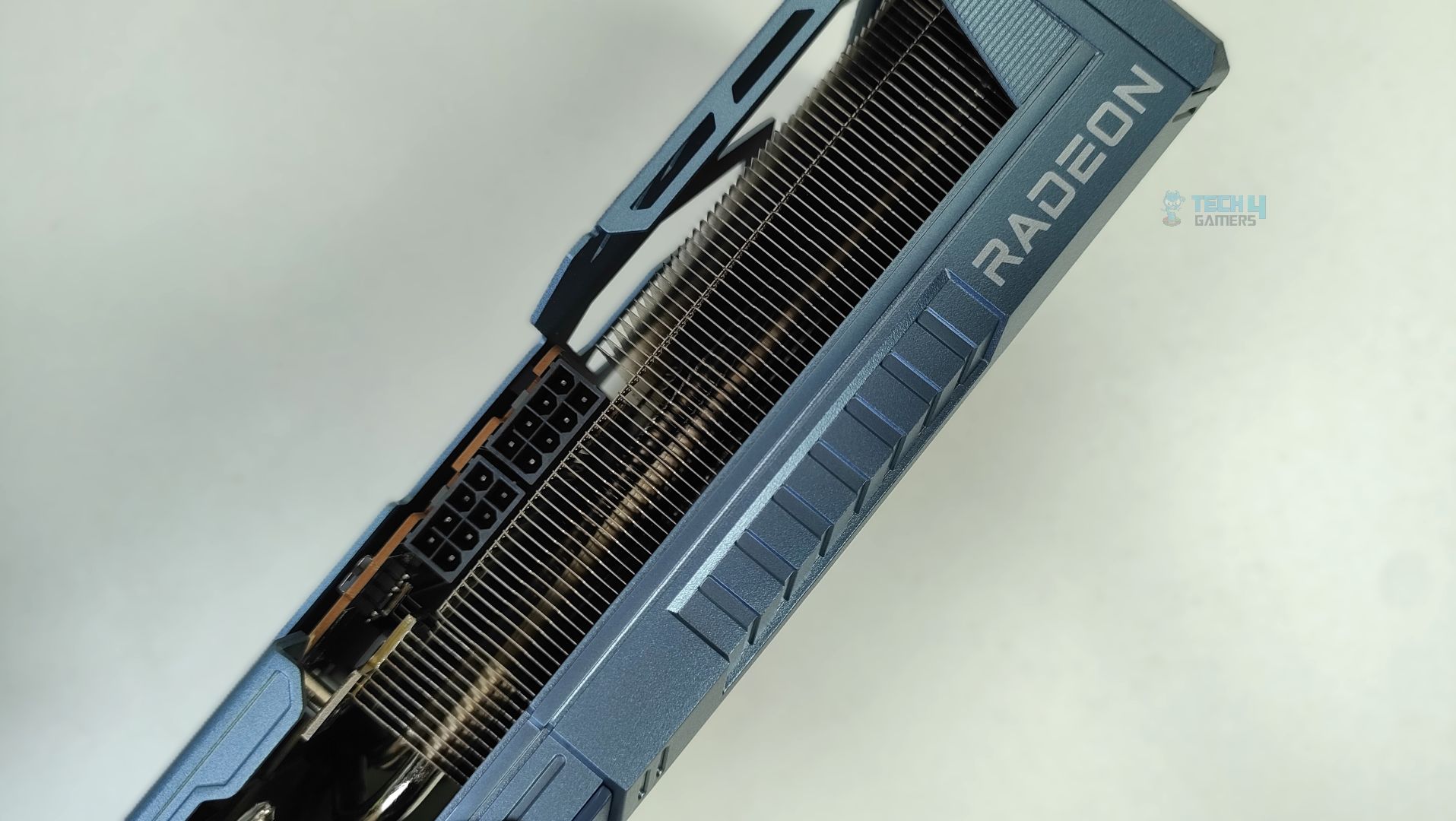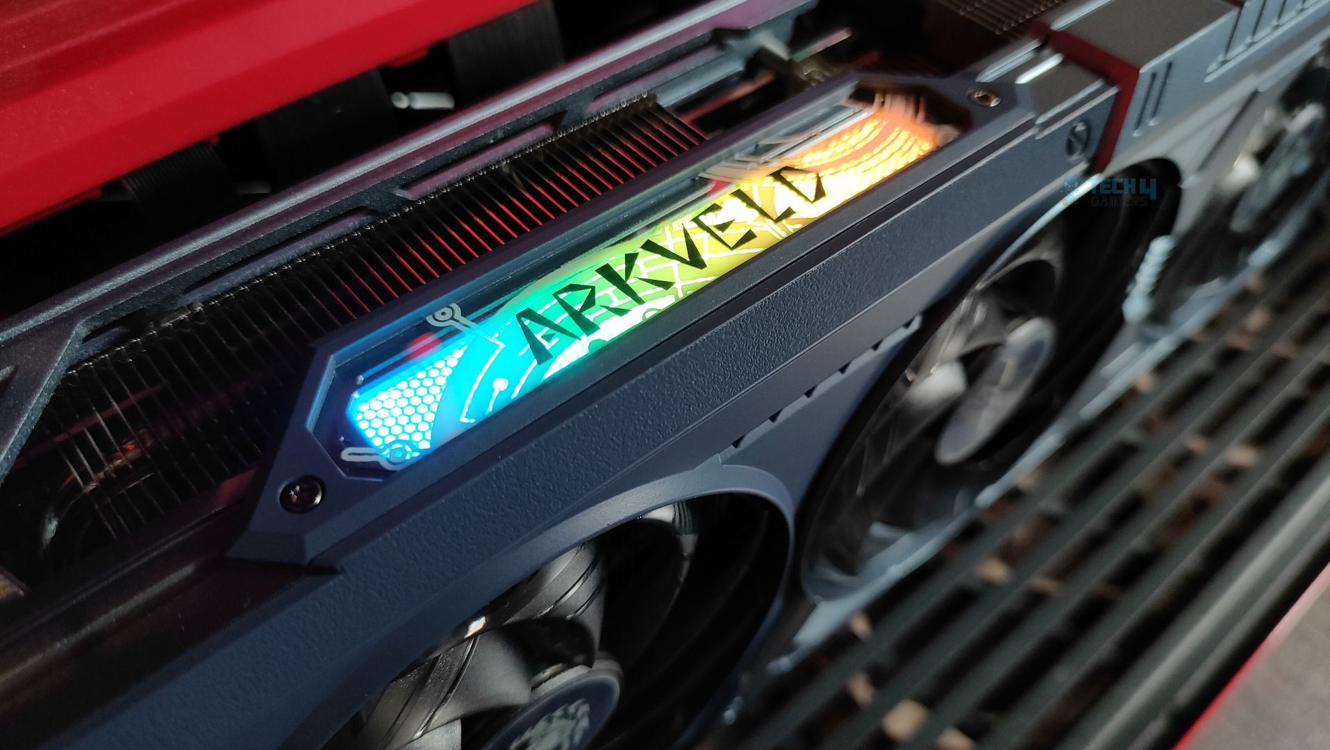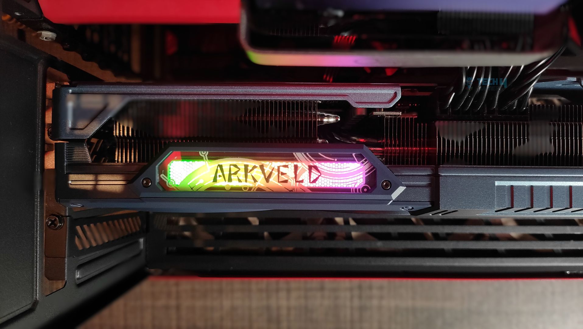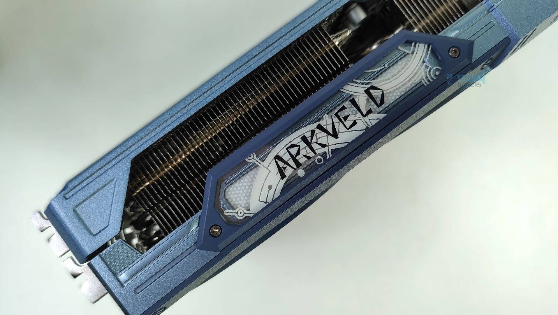 The side features a translucent acrylic Arkveld nameplate that glows with RGB effects. The design is very similar to the steel legends card. Moving forward, the GPU supports the 2×8-Pin GPU connectors. The Traditional Radeon Branding is also visible. The heatsink fins on the side profile are oriented vertically. The heatpipes are clearly visible from the sides as well.