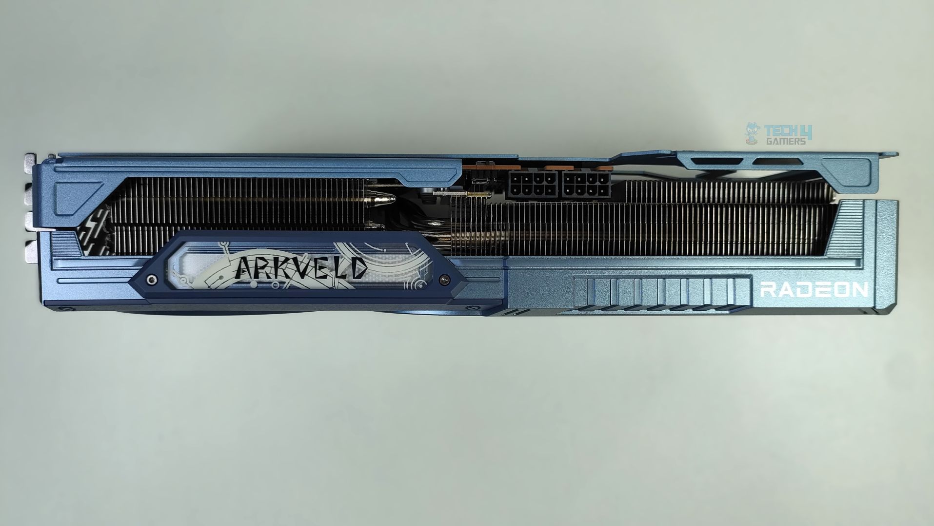 The side features a translucent acrylic Arkveld nameplate that glows with RGB effects. The design is very similar to the steel legends card. Moving forward, the GPU supports the 2×8-Pin GPU connectors. The Traditional Radeon Branding is also visible. The heatsink fins on the side profile are oriented vertically. The heatpipes are clearly visible from the sides as well.