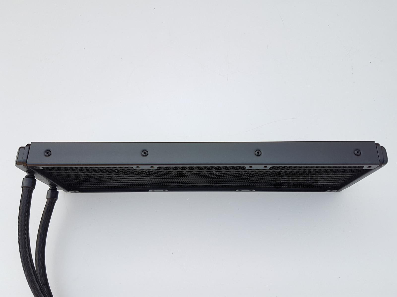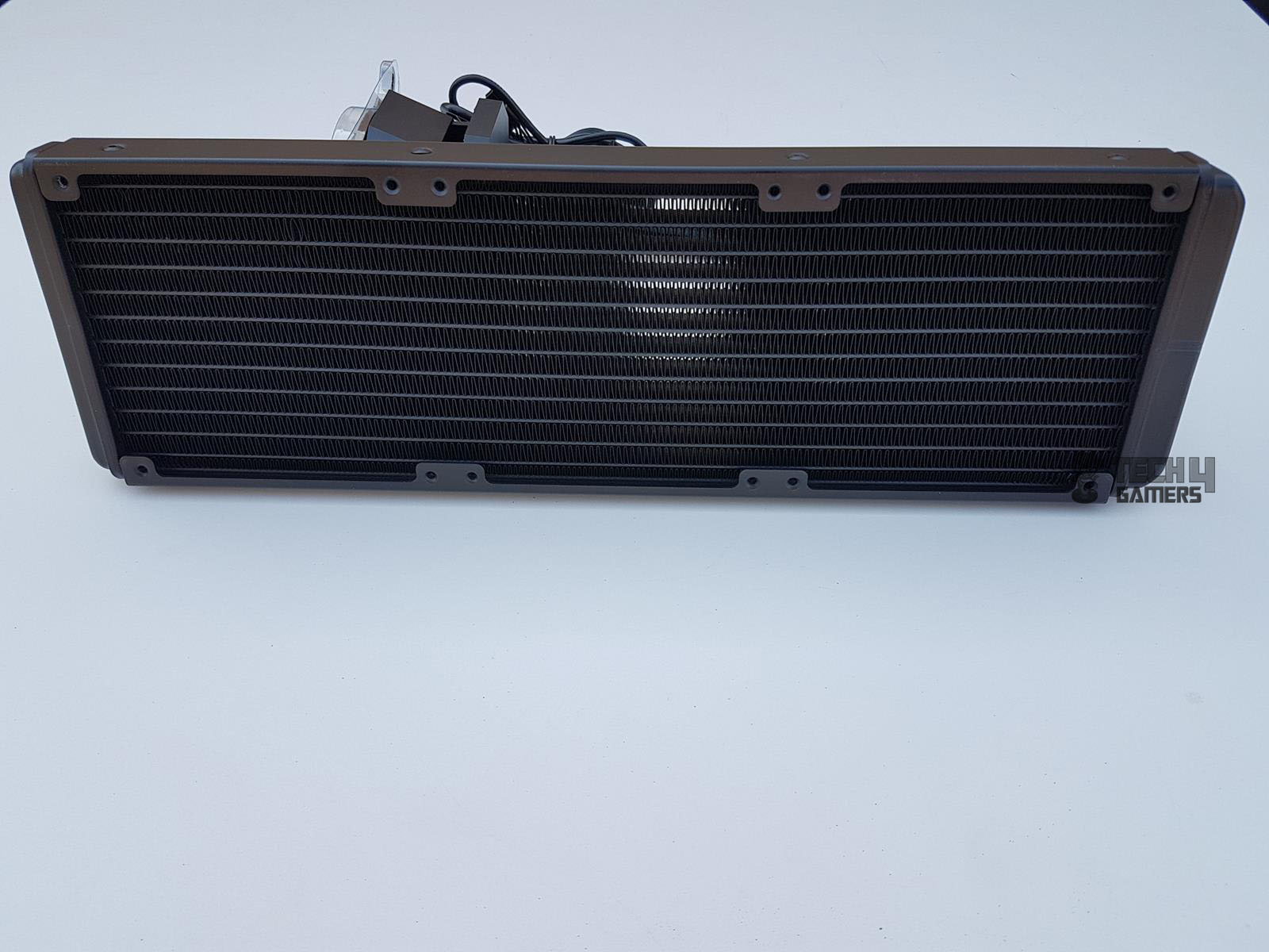 The aluminum radiator is lightweight, featuring 20 FPI (fins per inch) and angular edges. With 13 channels, it benefits from high airflow and air-pressure fans. The far chamber follows the common AIO cooler design, being relatively thinner. The radiator housing offers 105mm spacing between any two mounting holes. The fins area spans approximately 360mm in length and has a width of 121mm.