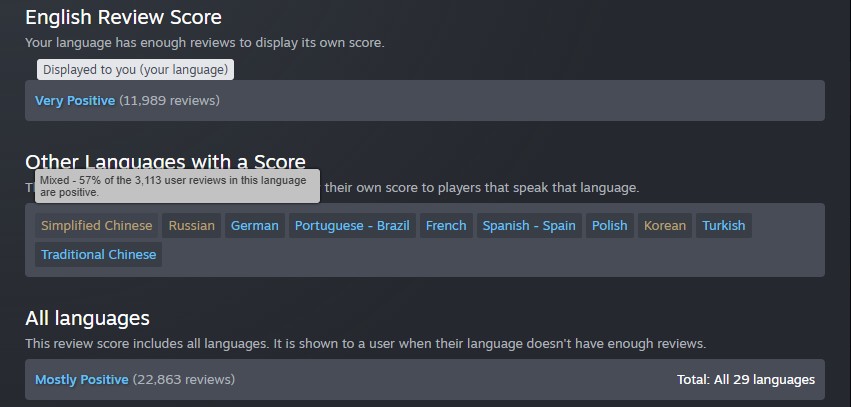 As seen on the Steam page, these players are upset with the unexpectedly bad localization experience. This has caused the individual Chinese and Russian regional scores to land at the ‘Mixed’ rating compared to other regions at the time of writing.