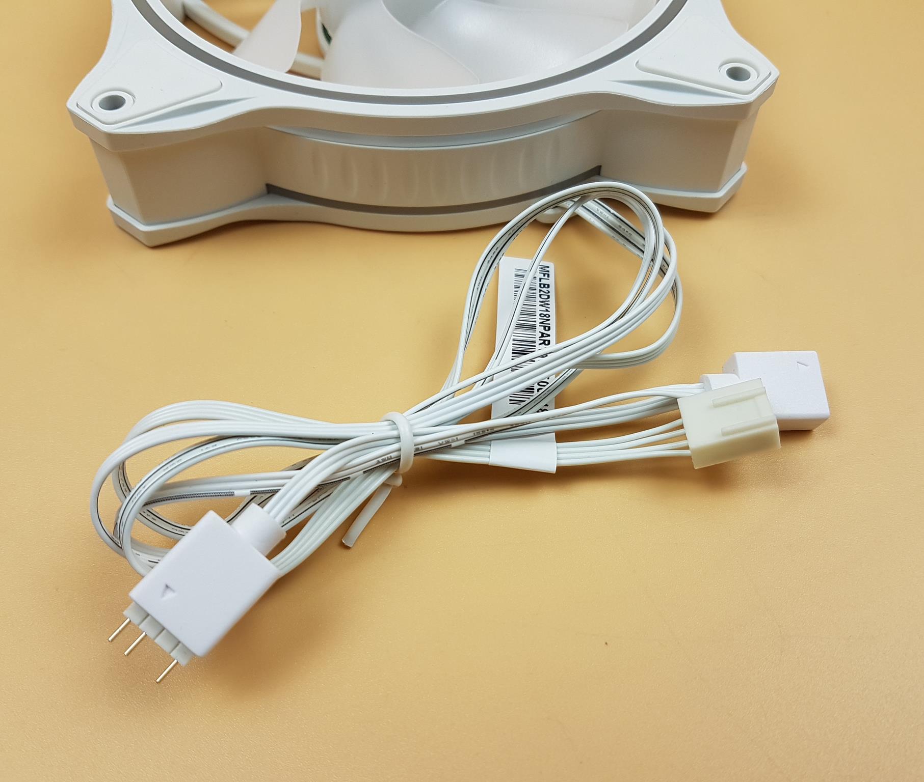 The fan comes with two white cables. A 4-pin PWM cable (450mm) powers the fan motor. The other is a 3-pin A-RGB cable (450+75mm) with matching white connectors.