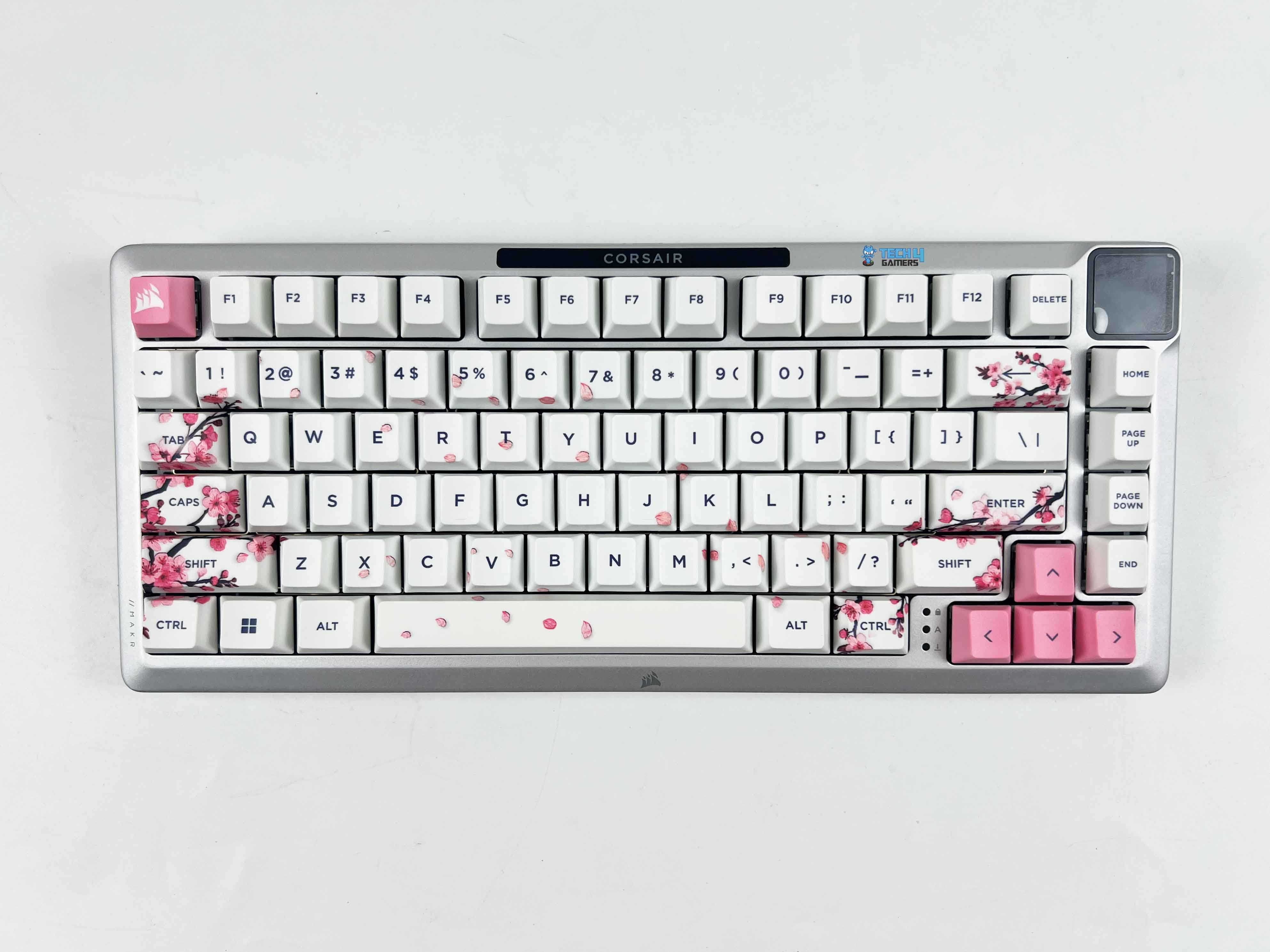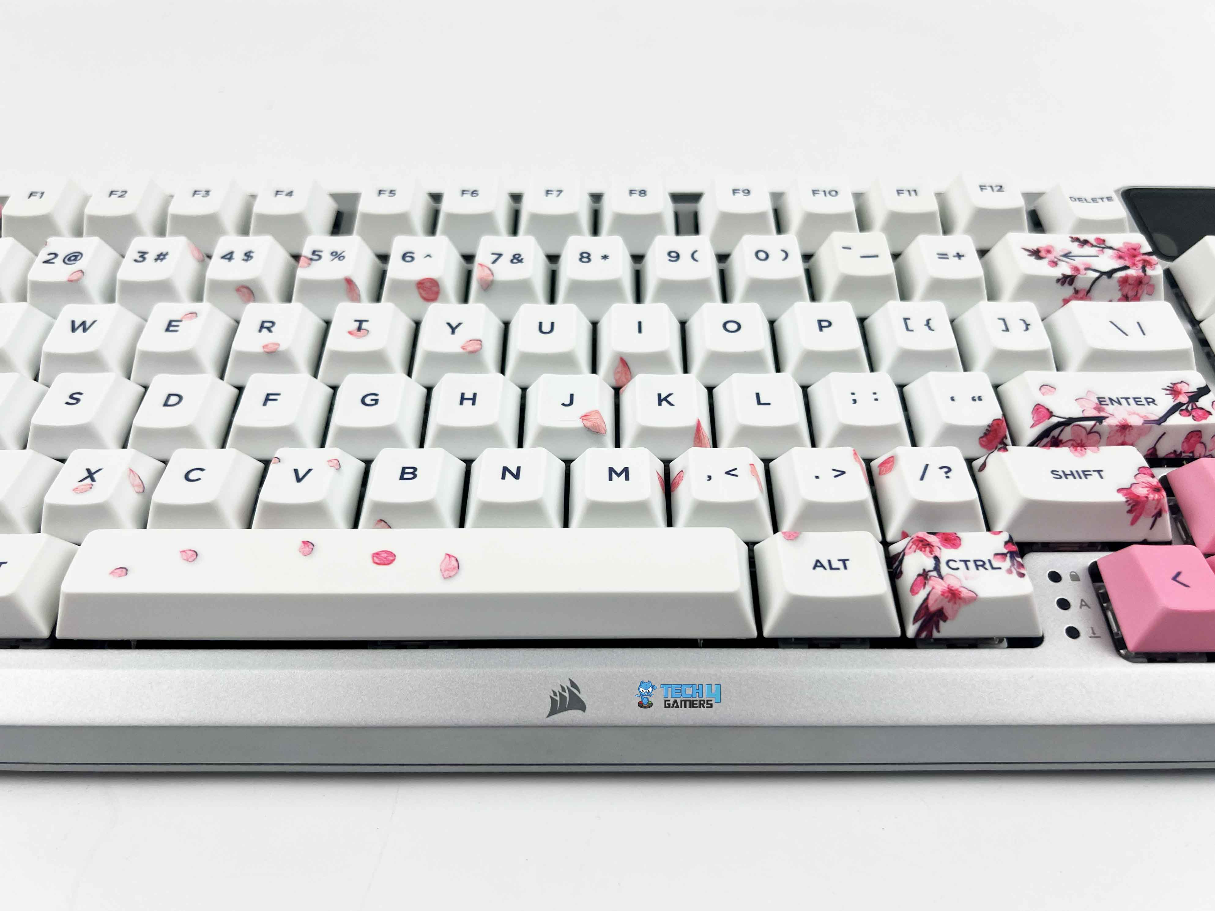 The ESC and arrow keys switch things up in pink, adding a little pop of color to those corners. Personally, I would’ve loved it if Corsair carried that pink further into the function row to balance things out even more, but as it stands, the subtle accents already look elegant. There are also these small cherry blossom leaf prints scattered across the modifier cluster and then mirrored again on the right side.