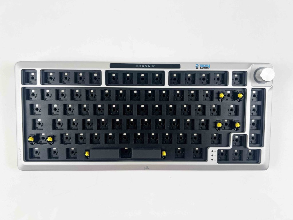 Corsair kept the branding pretty subtle as well. Up top, you get Corsair with a thin black line running across for a bit of contrast, and at the bottom, there’s the Corsair logo in black. Currently, I have the MAKR 75 in its barebones form, with no switches or keycaps installed. That actually makes it easier to see what’s inside, including the plate, the sockets, and the entire layout.