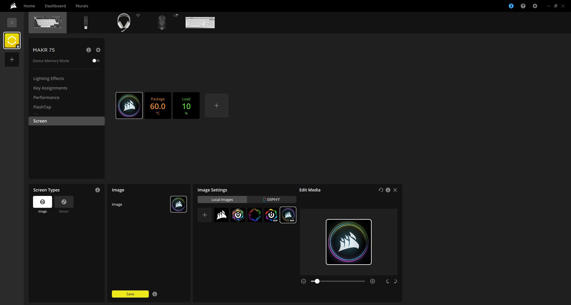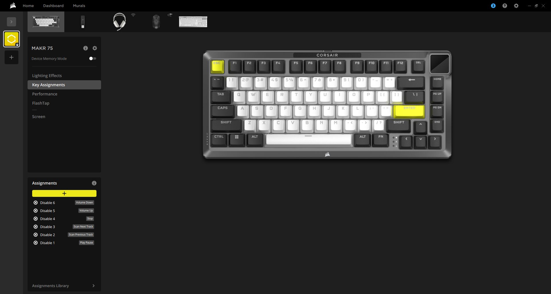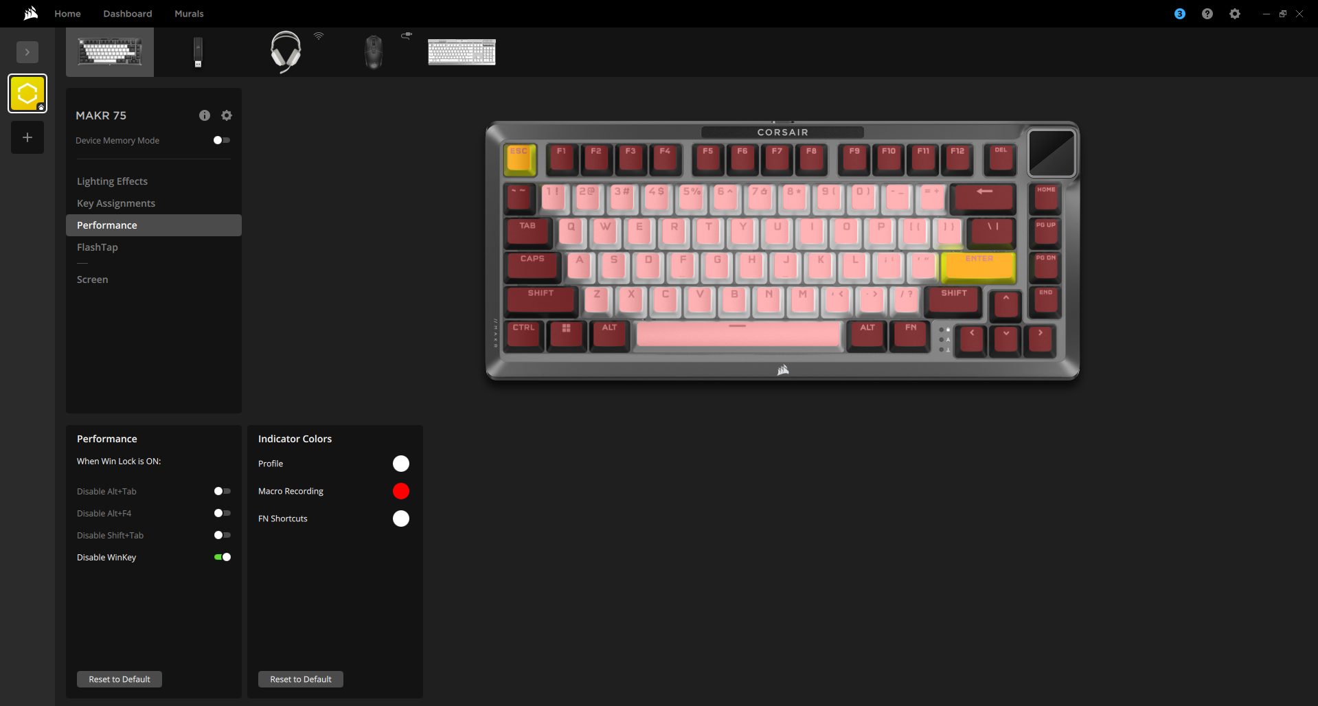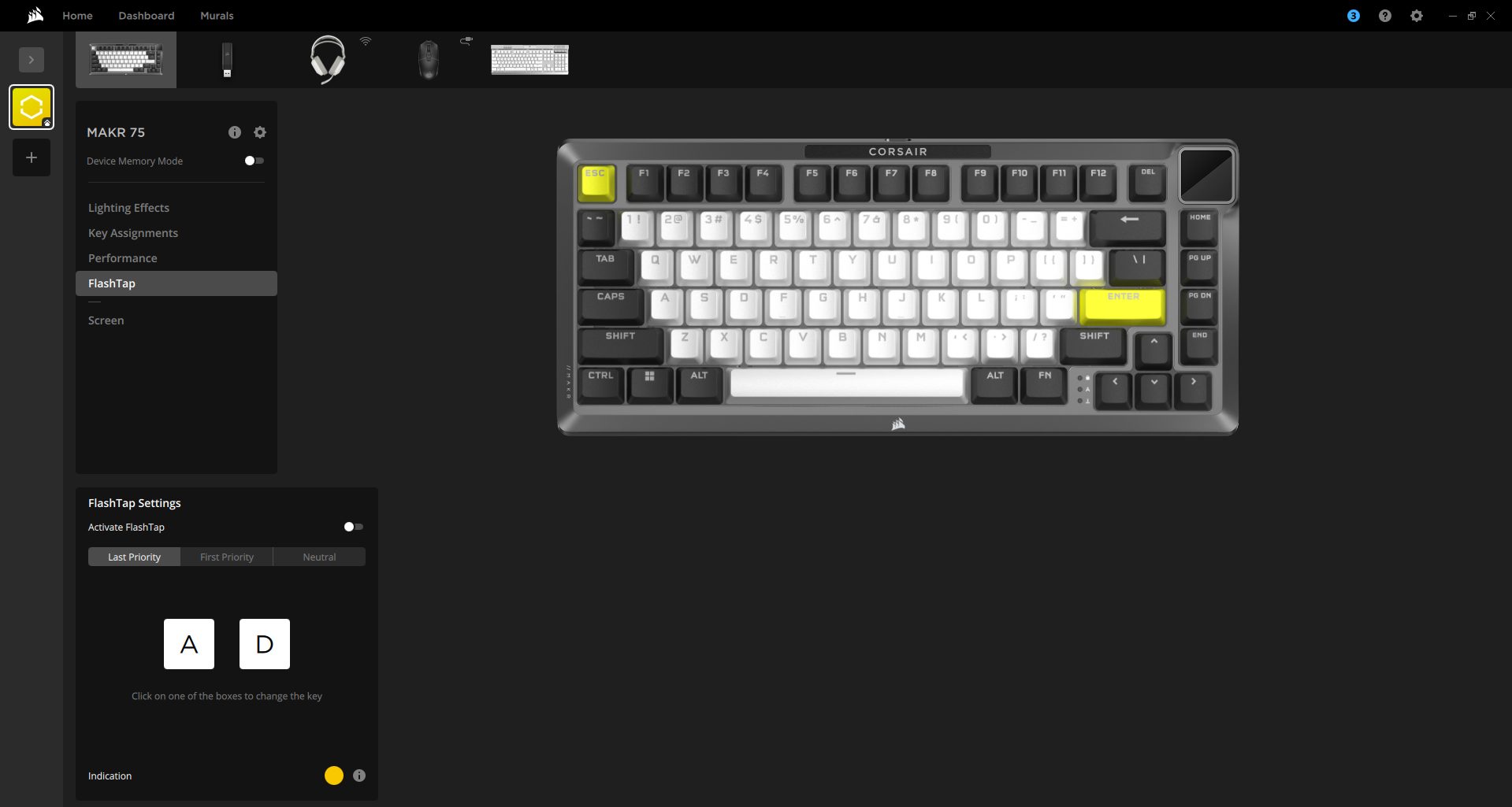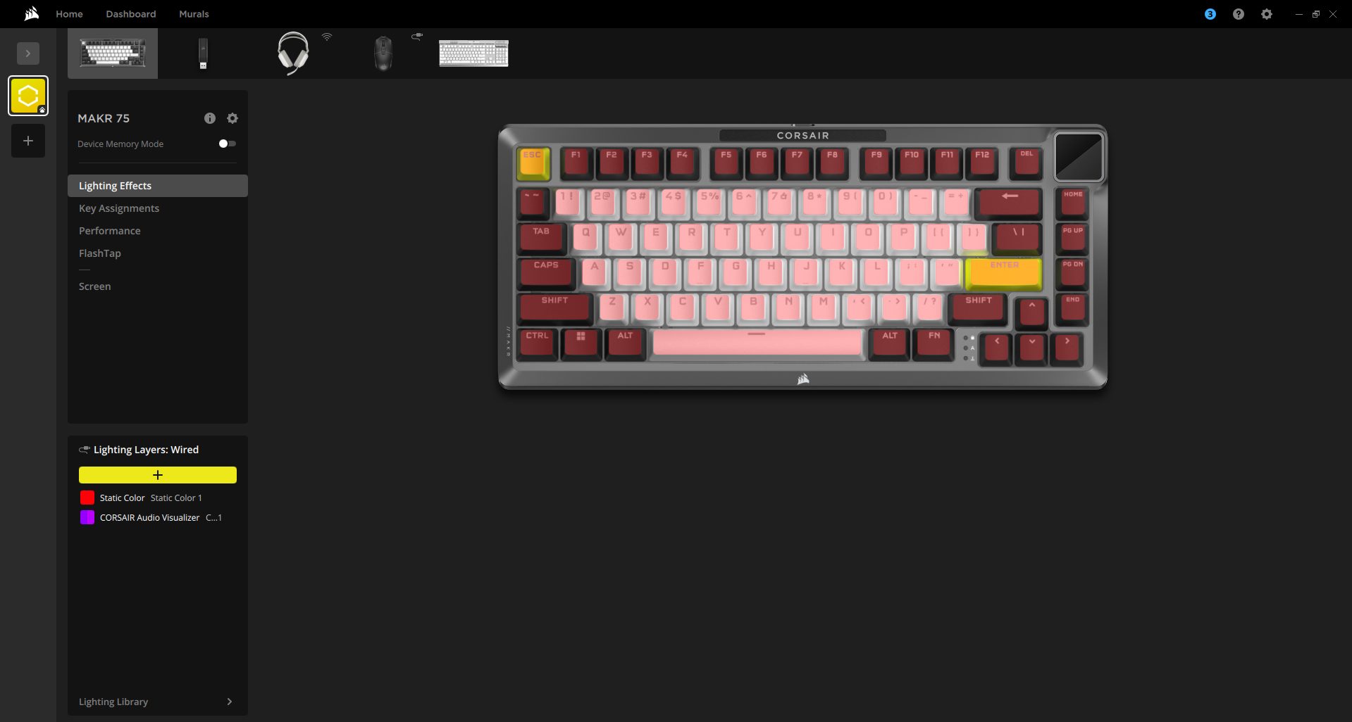 The MAKR 75 works seamlessly with Corsair iCUE and supports the Web Hub, a lightweight, web-based tool for customizing the keyboard without requiring additional software installation. When you open iCUE, you’ll see a tile for the MAKR 75. From here, you can customize lighting effects, key assignments, the rotary dial, performance settings, and Flashtap features.