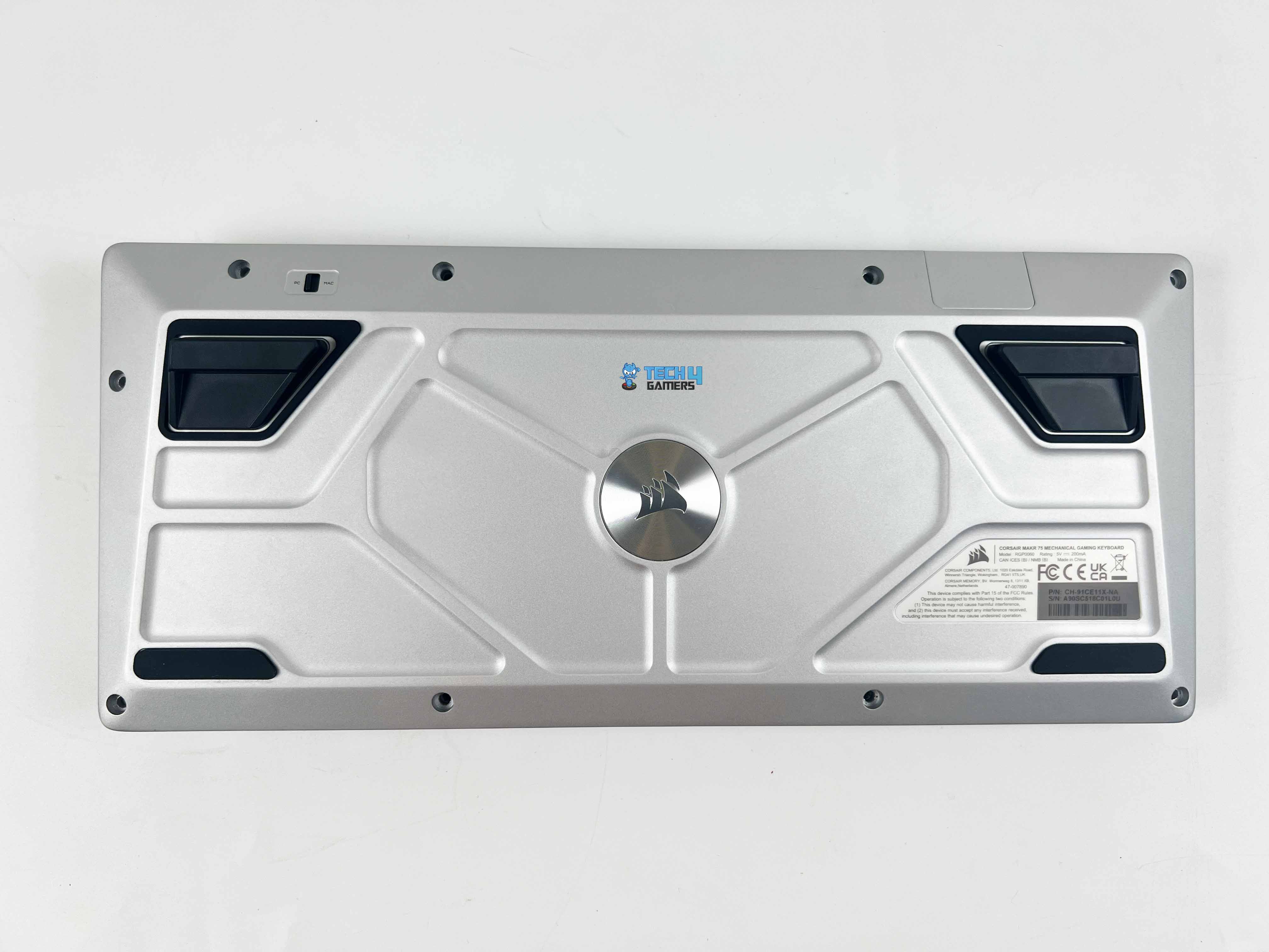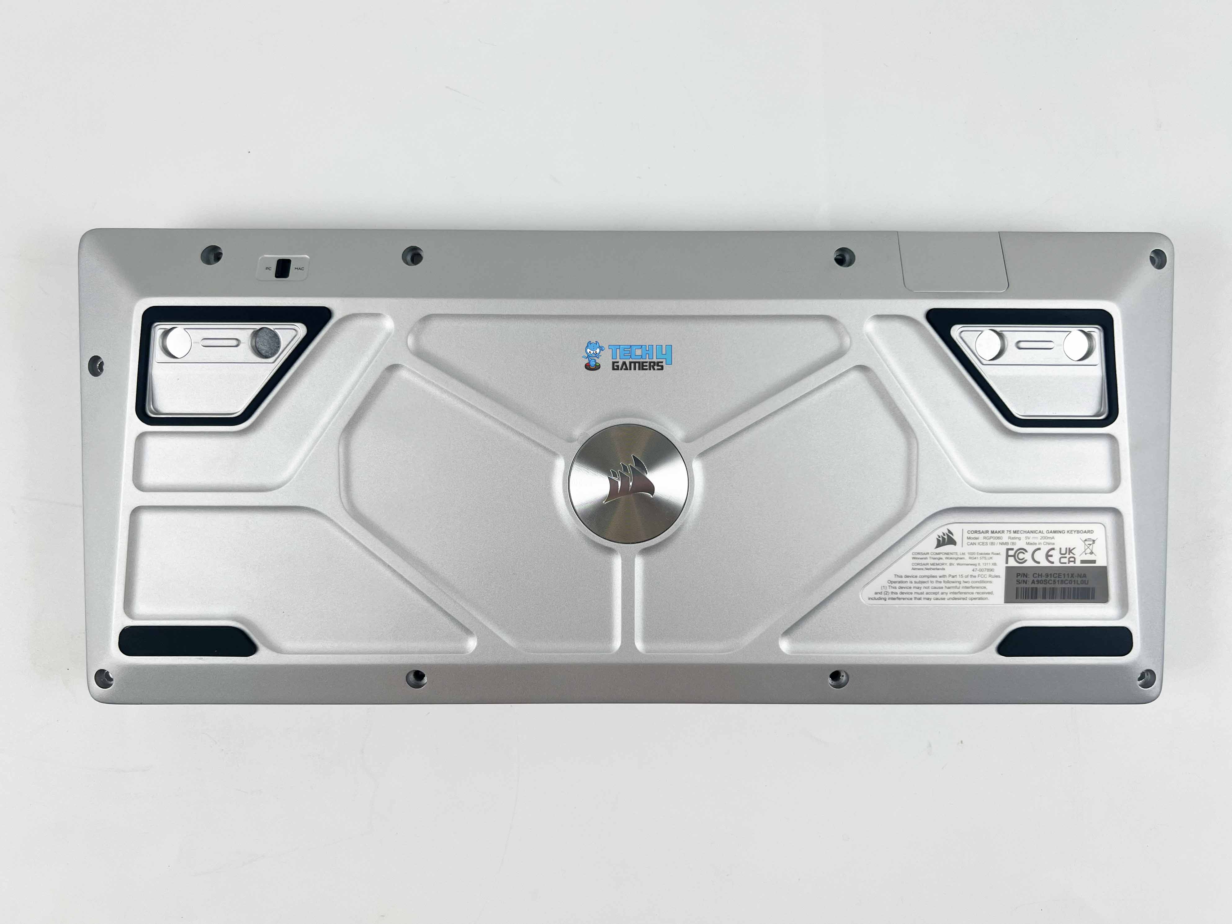 Instead of the usual plastic bottom you see on most keyboards, Corsair went with aluminum here, which gives the MAKR 75 a heavier, more solid feel. There’s also a small toggle located in the top-left corner that allows you to switch between PC and Mac modes. It features two long rubber strips along the bottom edge, along with two additional ones around the feet, ensuring it stays firmly in place on the desk.