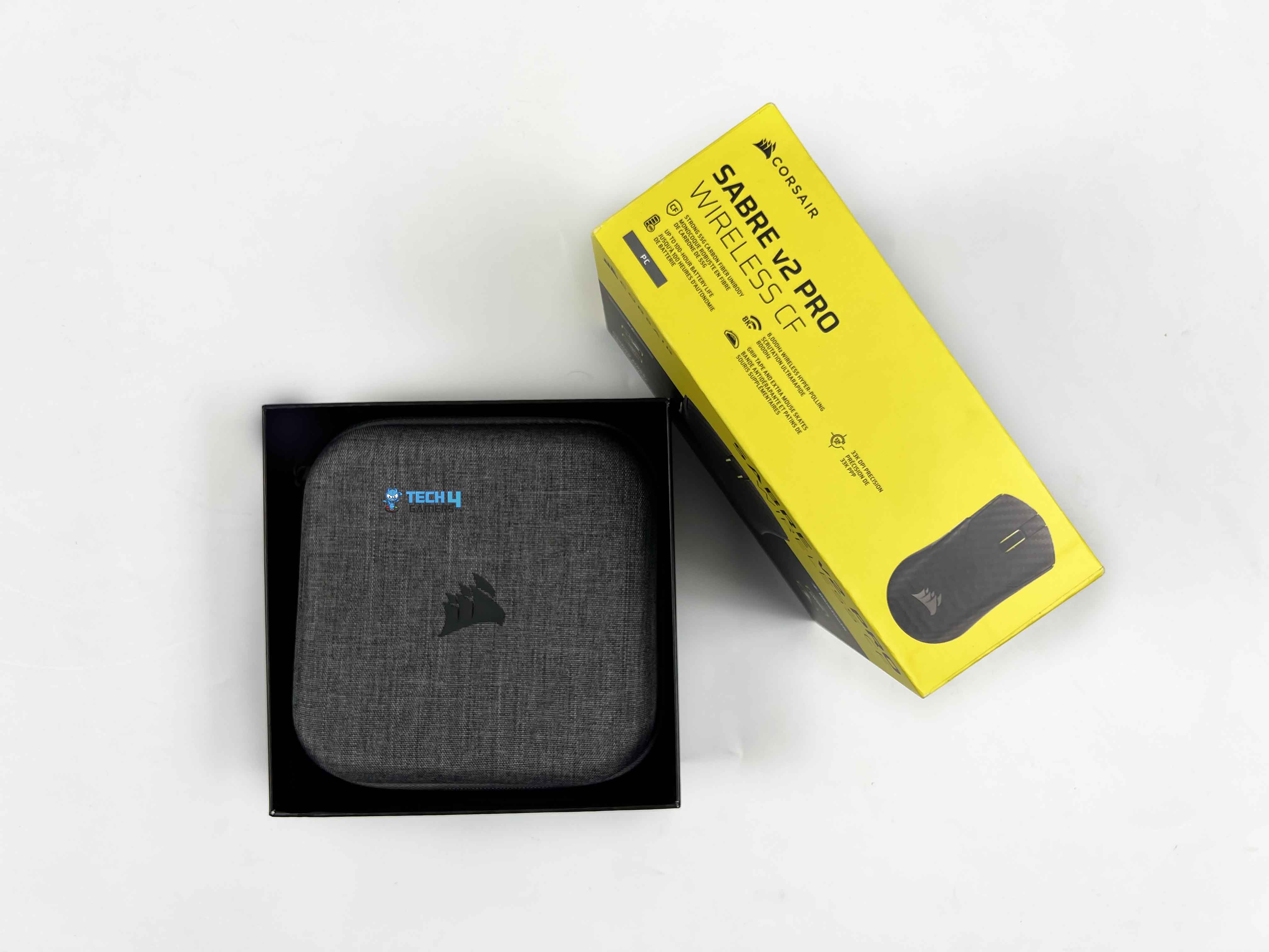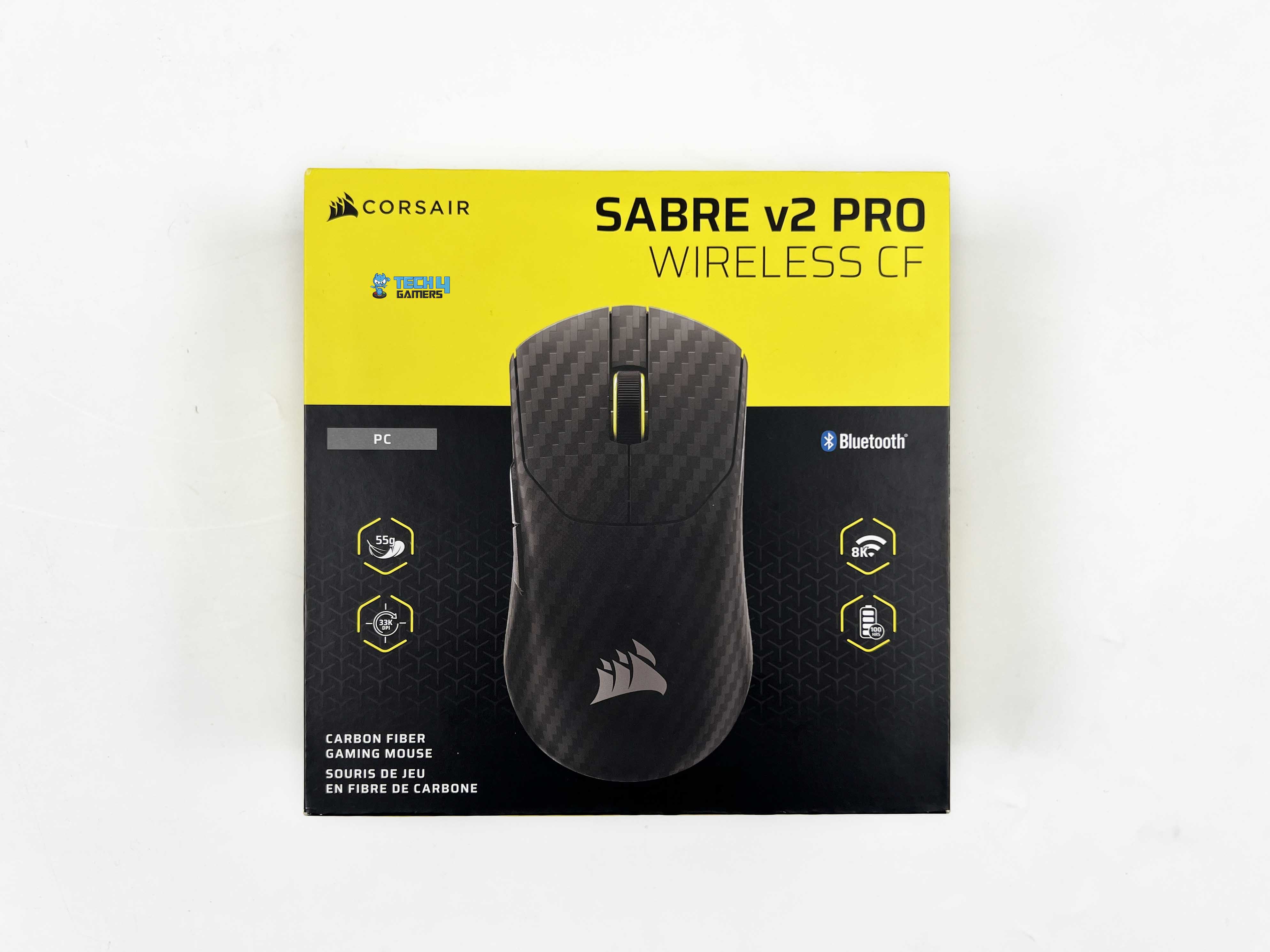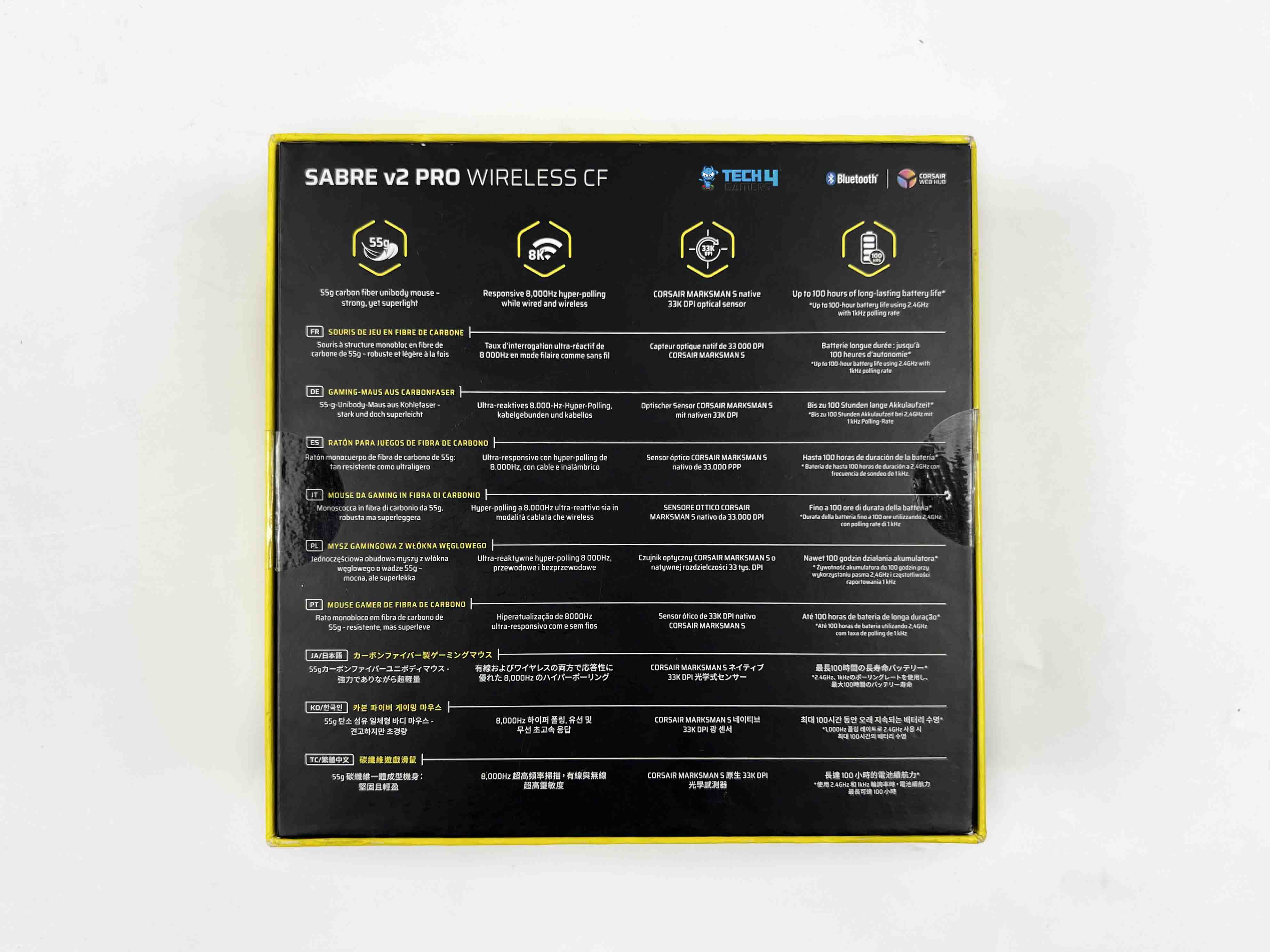 The Sabre v2 Pro Carbon Fiber comes in Corsair’s familiar yellow-and-black packaging. The front of the box shows an image of the mouse, with a few feature callouts around it.  The top and sides list additional features and show what’s included inside. There’s also a side profile image of the mouse. Flip the box over, and the back is packed with technical details printed in multiple languages.