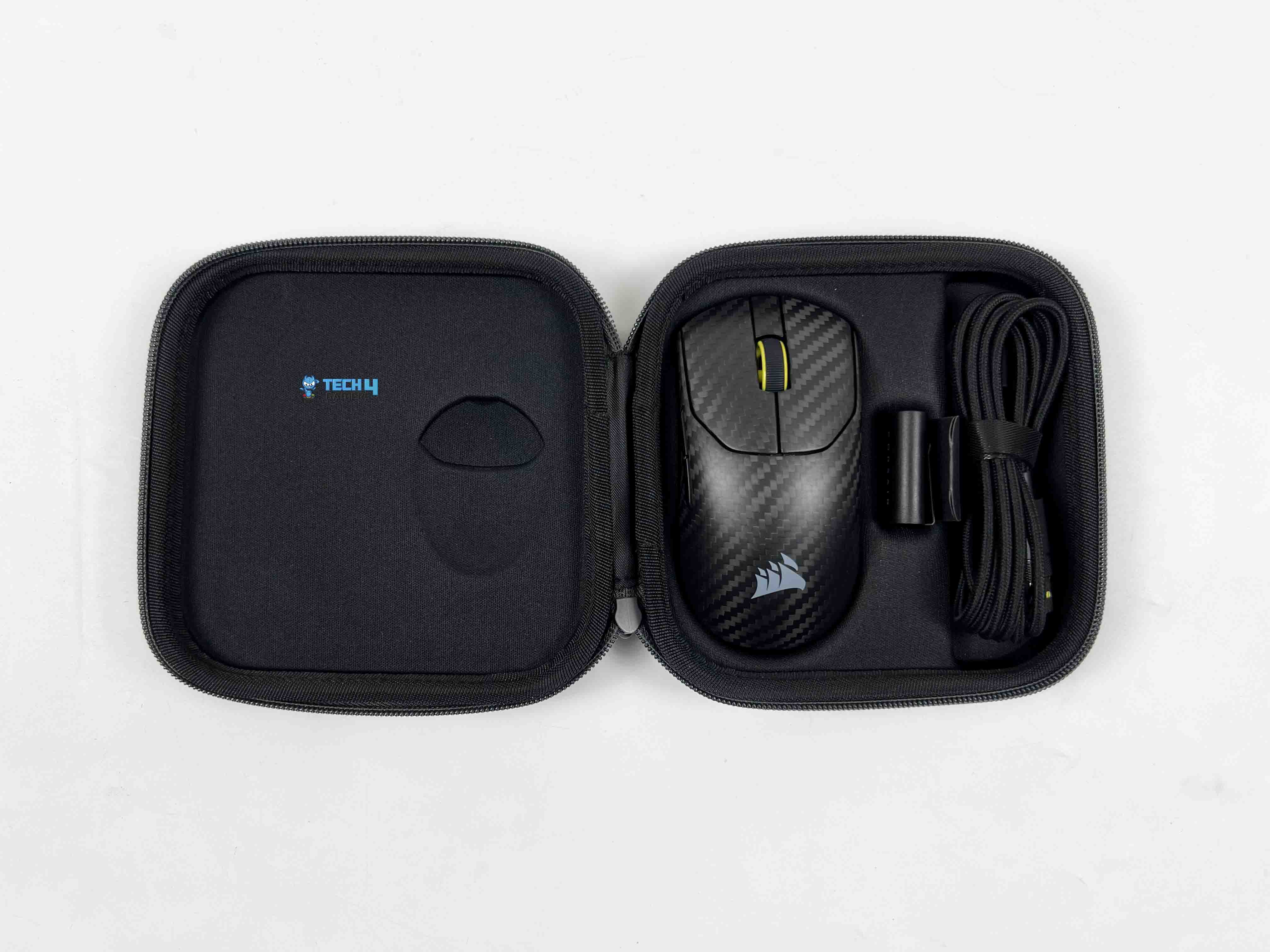 The thumb has a subtle place to rest on, while the opposite side stays flatter.  The carbon fiber weave is present, but it’s handled adequately. You can see the pattern when light hits the shell directly, especially under brighter desk lighting. Under softer or darker lighting, it almost disappears. The weave is consistent across the surface. There’s no RGB to speak of, and the Corsair logo is kept small in the middle.