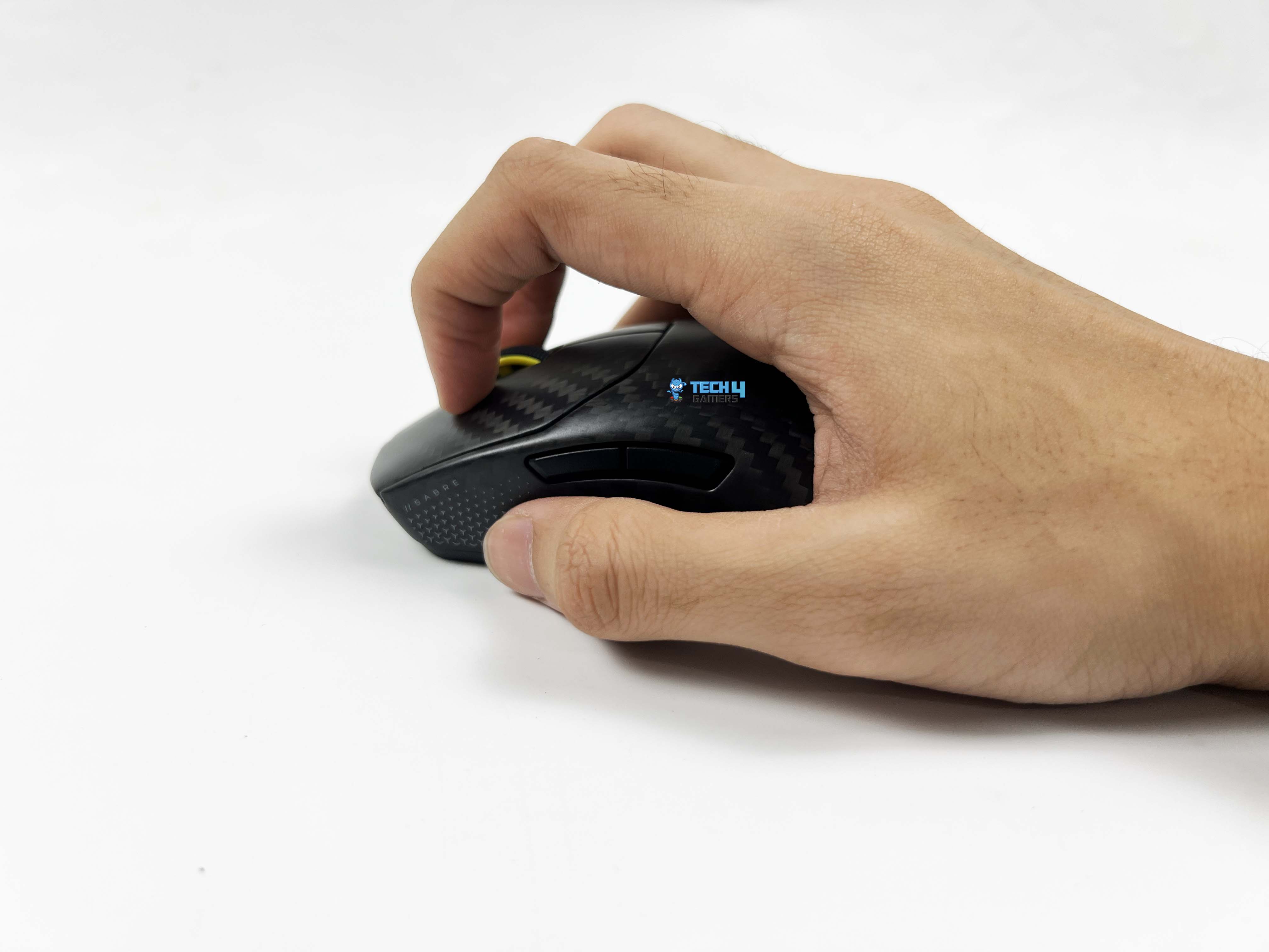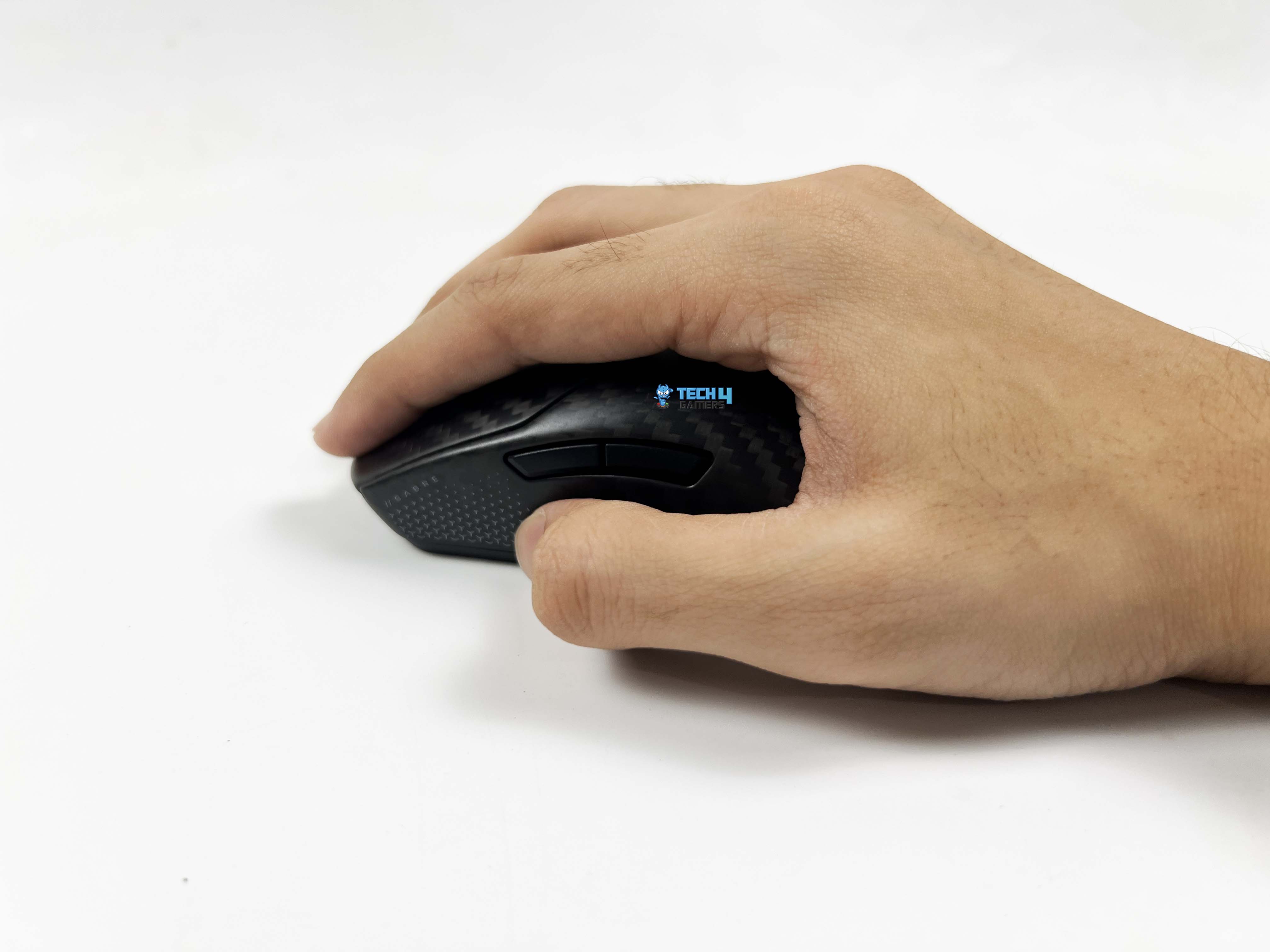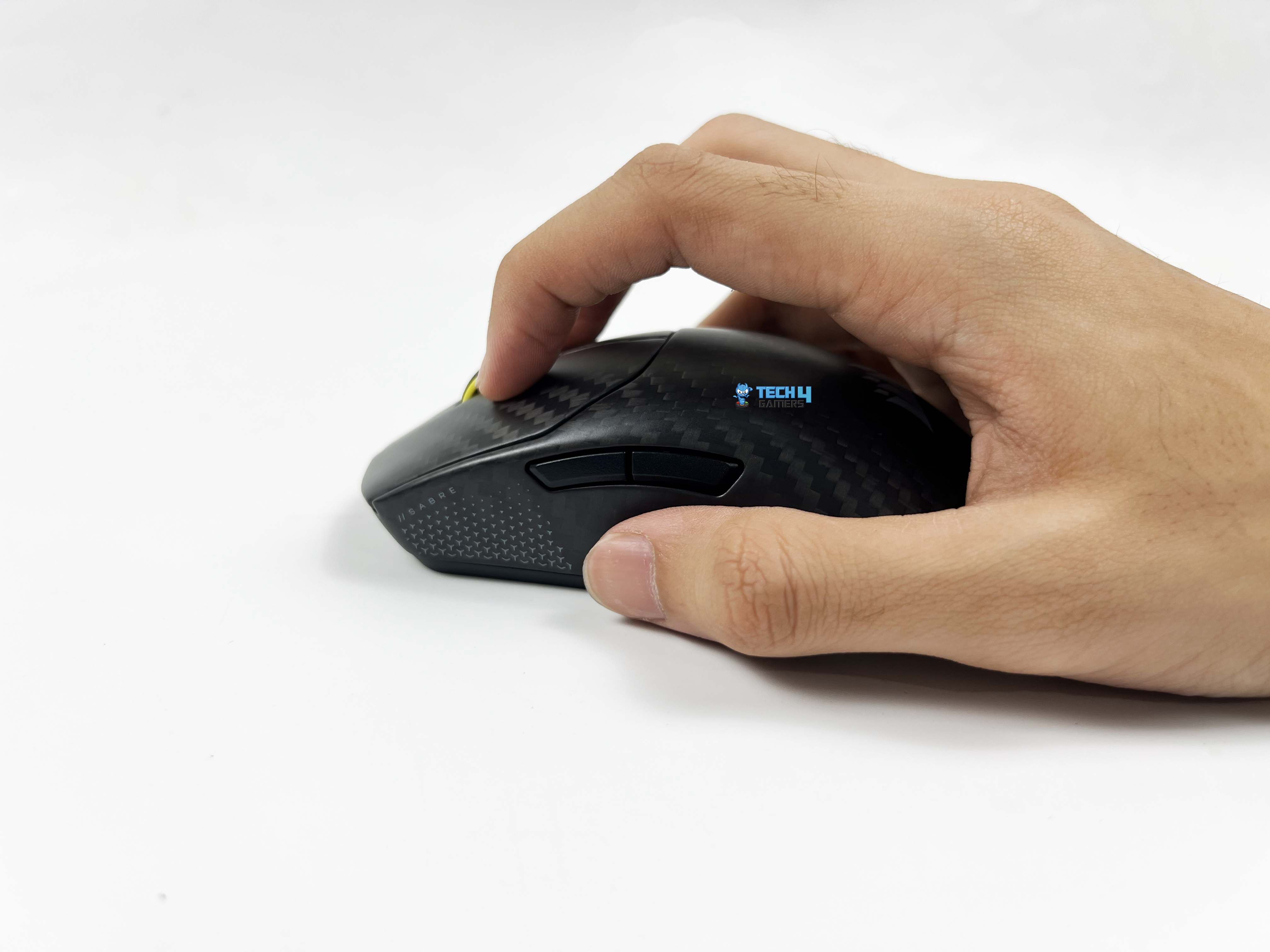 The Sabre v2 Pro Carbon Fiber is somewhat suitable for all grip styles. Palm-grip users will find that the gradual slope from the back to the front allows the hand to grip it firmly. The palm isn’t forced up or down. For claw-grip users, the higher main buttons provide a resting point for your fingers. There’s just enough space between the buttons and the body so your fingertips don’t feel cramped. The thumb groove on the left side is defined.