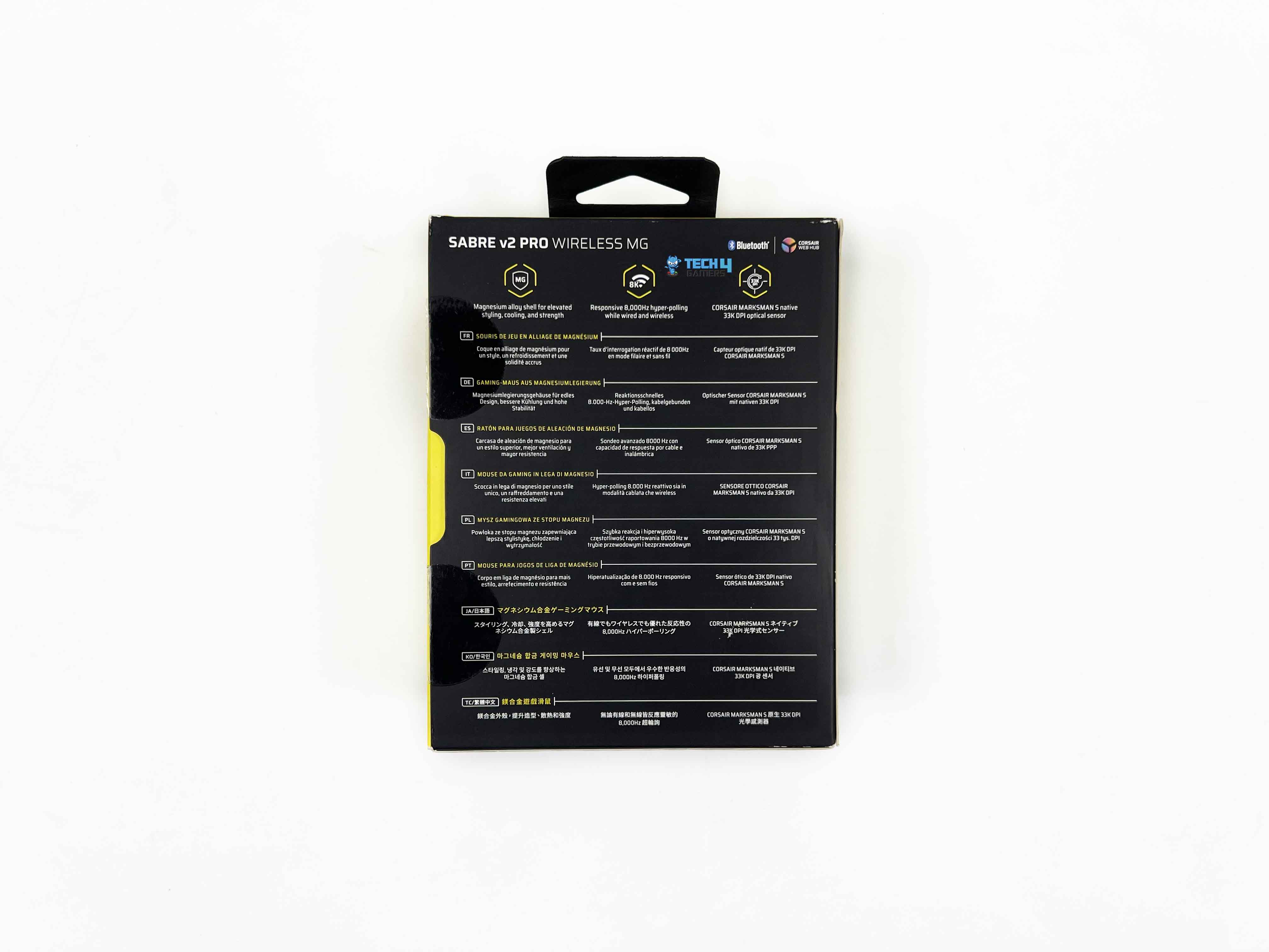 The box looks familiar if you’ve opened Corsair products before. On the front, there’s an image of the mouse, the full model name, and Corsair’s branding. You also get a few feature callouts. The sides add a bit more detail. You’ll find short feature descriptions there, along with a quick breakdown of what’s included inside. Around the back, that’s where the technical specs are printed in multiple languages.