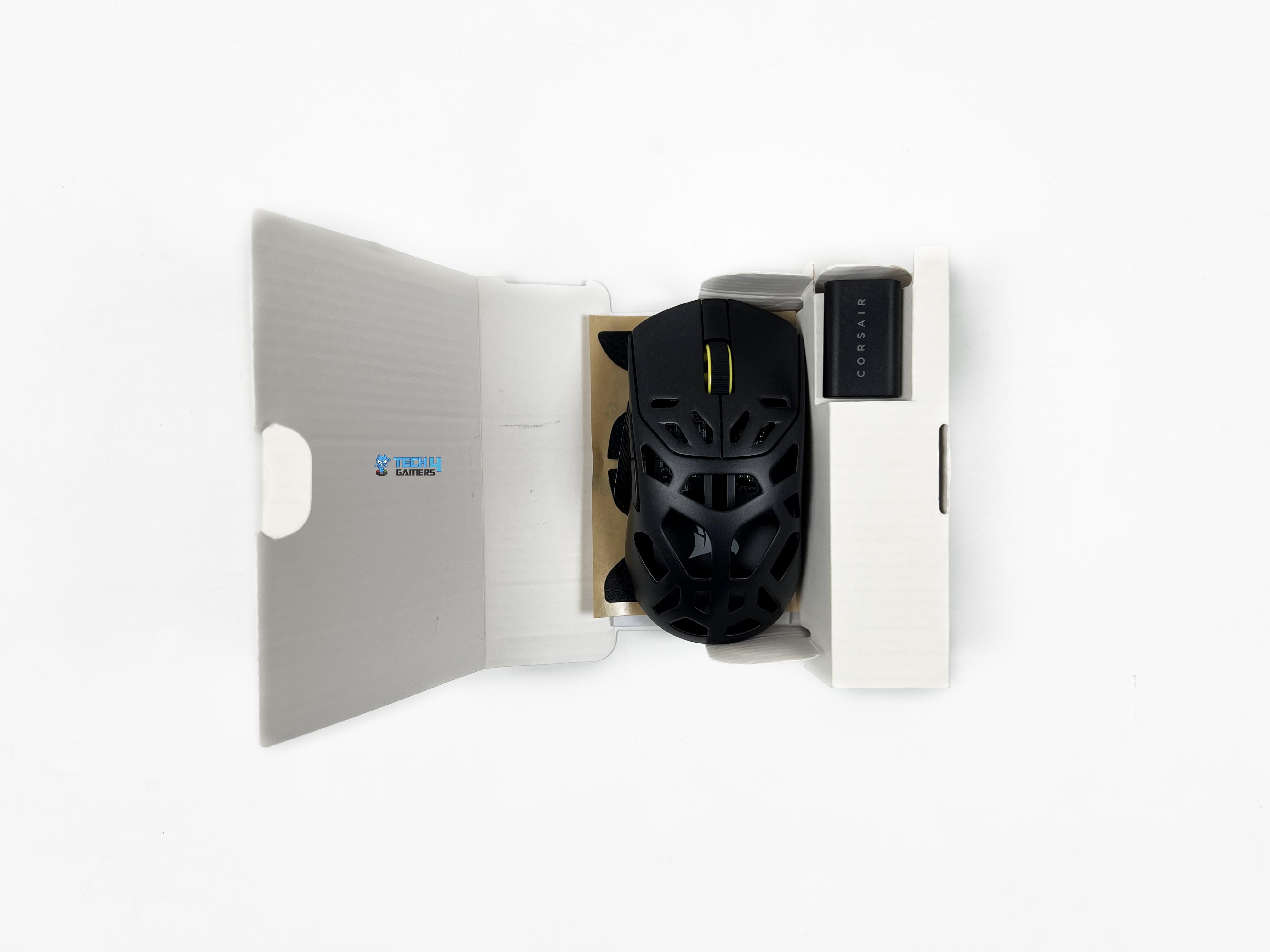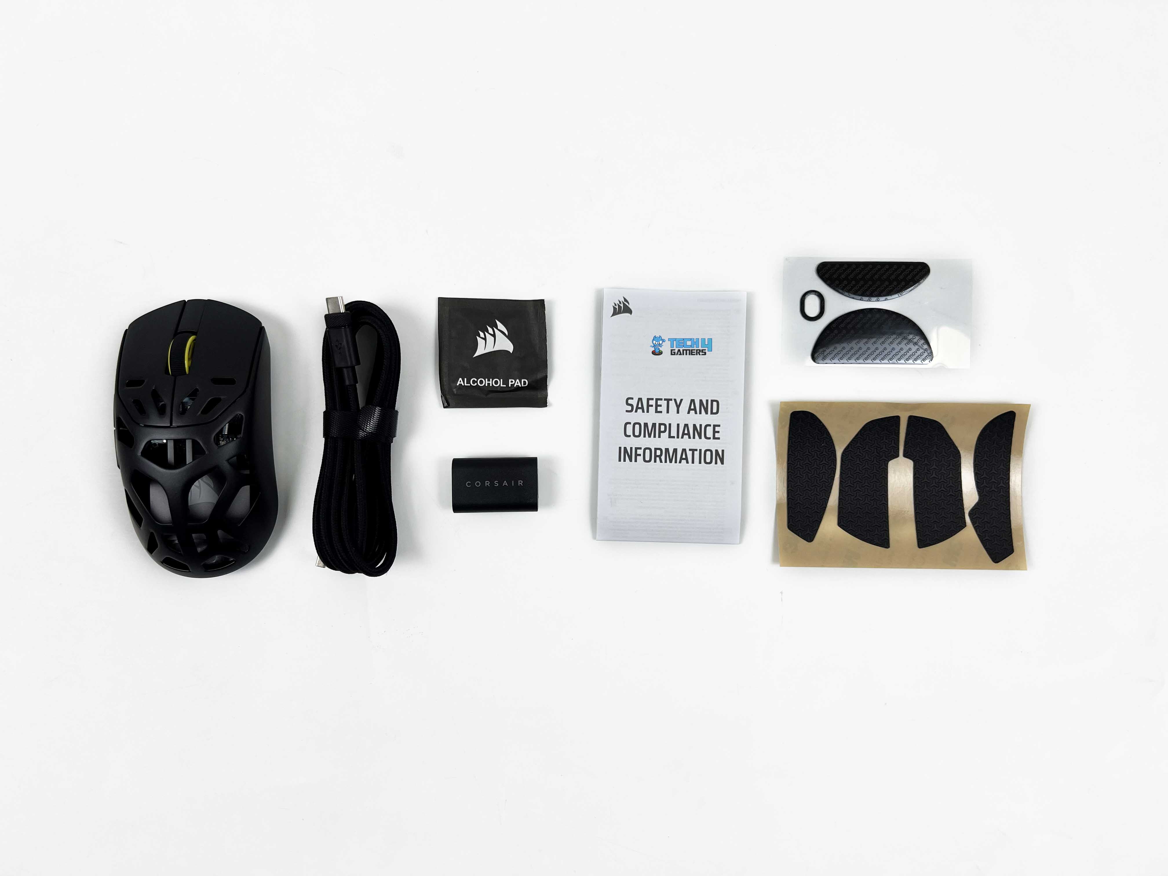 Opening the box, you’ll see a white cardboard inner tray that holds everything in place. The first things you see are the wireless USB receiver and the mouse itself. Once those are out of the way, the rest of the accessories come into view. There’s an alcohol pad, extra mouse skates, and a set of grip tapes. You also get a USB Type-C to Type-A cable tucked alongside a small safety leaflet.