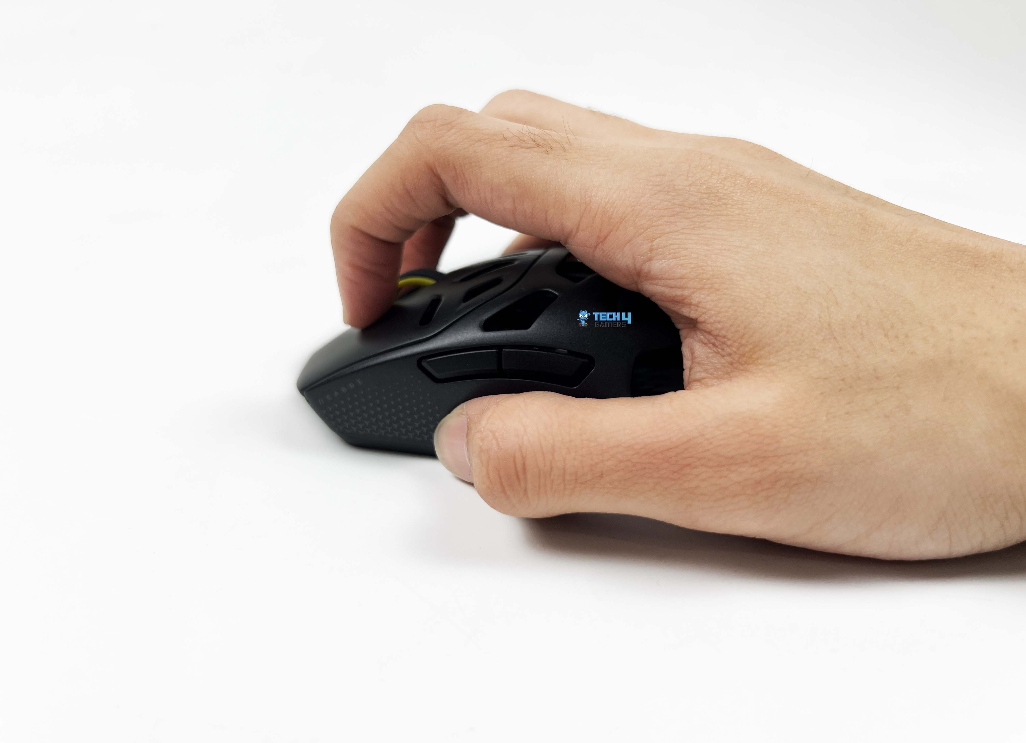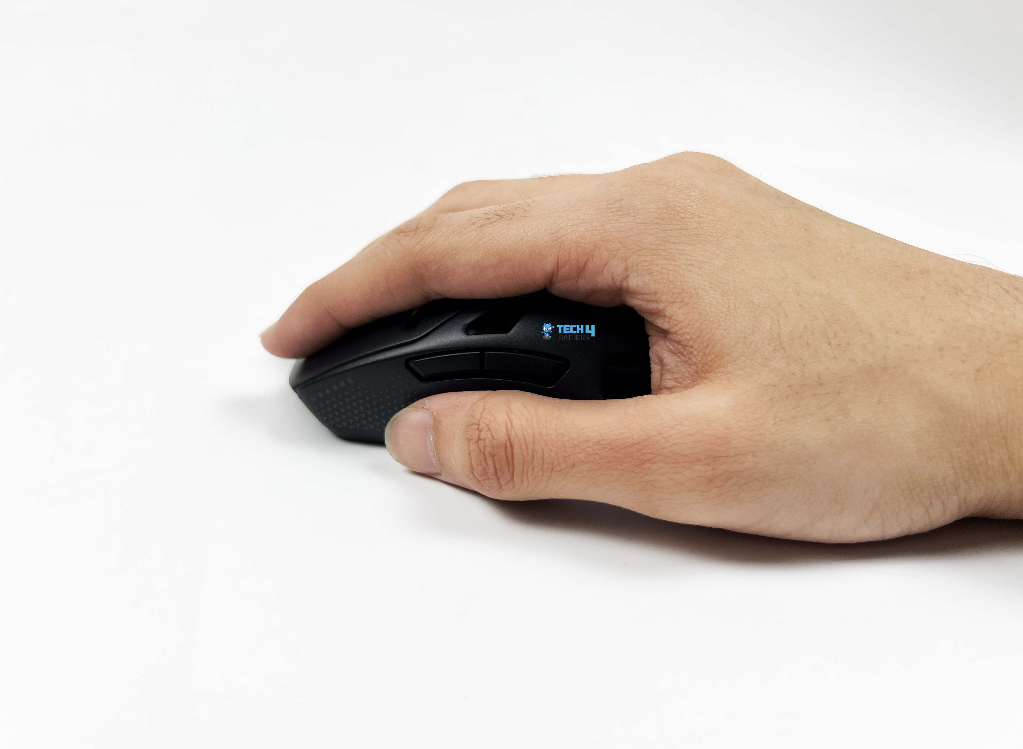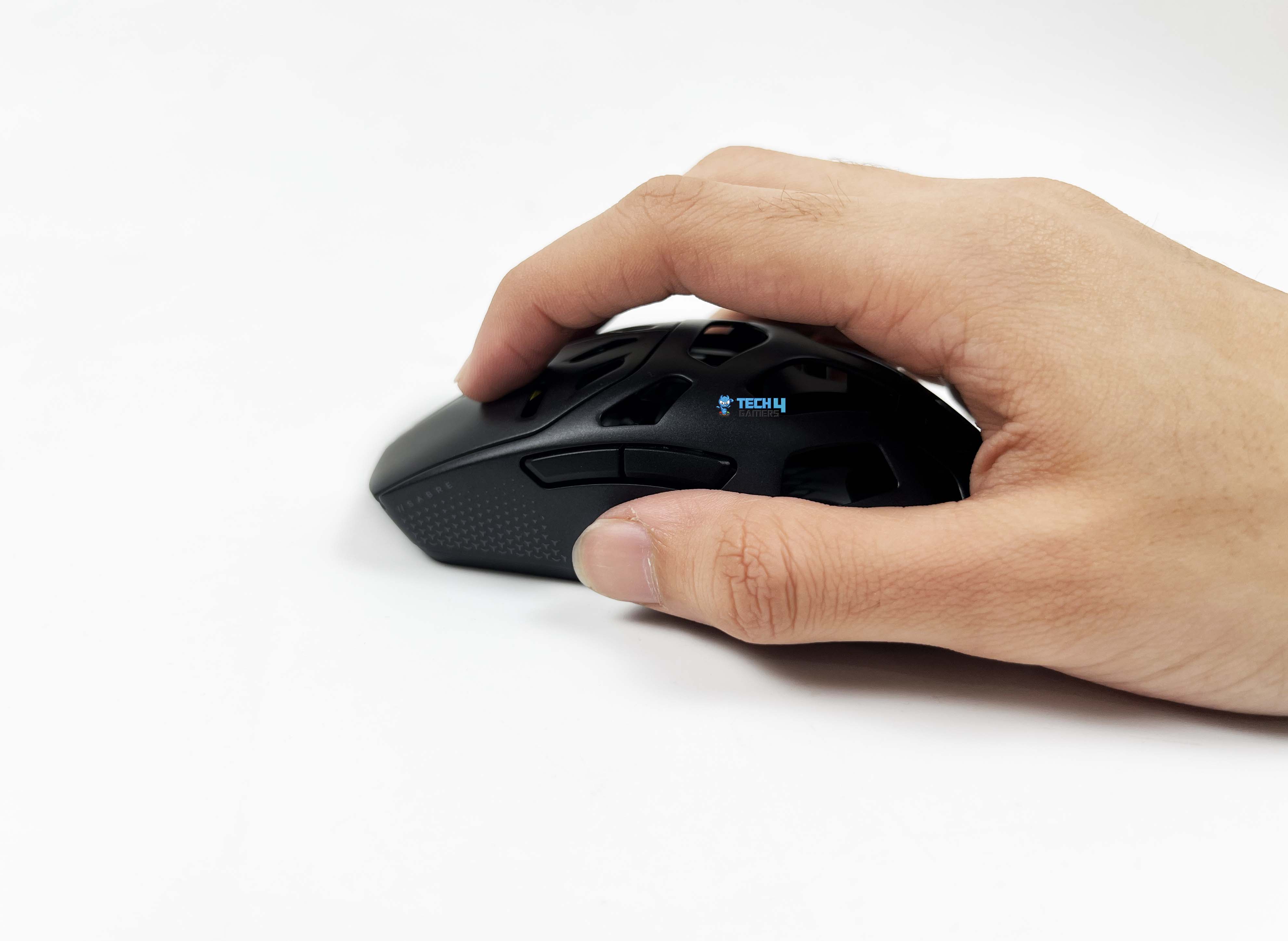 The Corsair Sabre v2 Pro Magnesium Alloy doesn’t force you into a single posture. With a palm-style grip, the contact points feel familiar. The rear fills the base of the hand enough to feel anchored. After a while, you stop adjusting your grip because there’s nothing obvious asking to be corrected. Claw grip feels more intentional here. The slope from the buttons into the shell gives your fingers something to pull against. Quick taps and micro-flicks feel controlled.