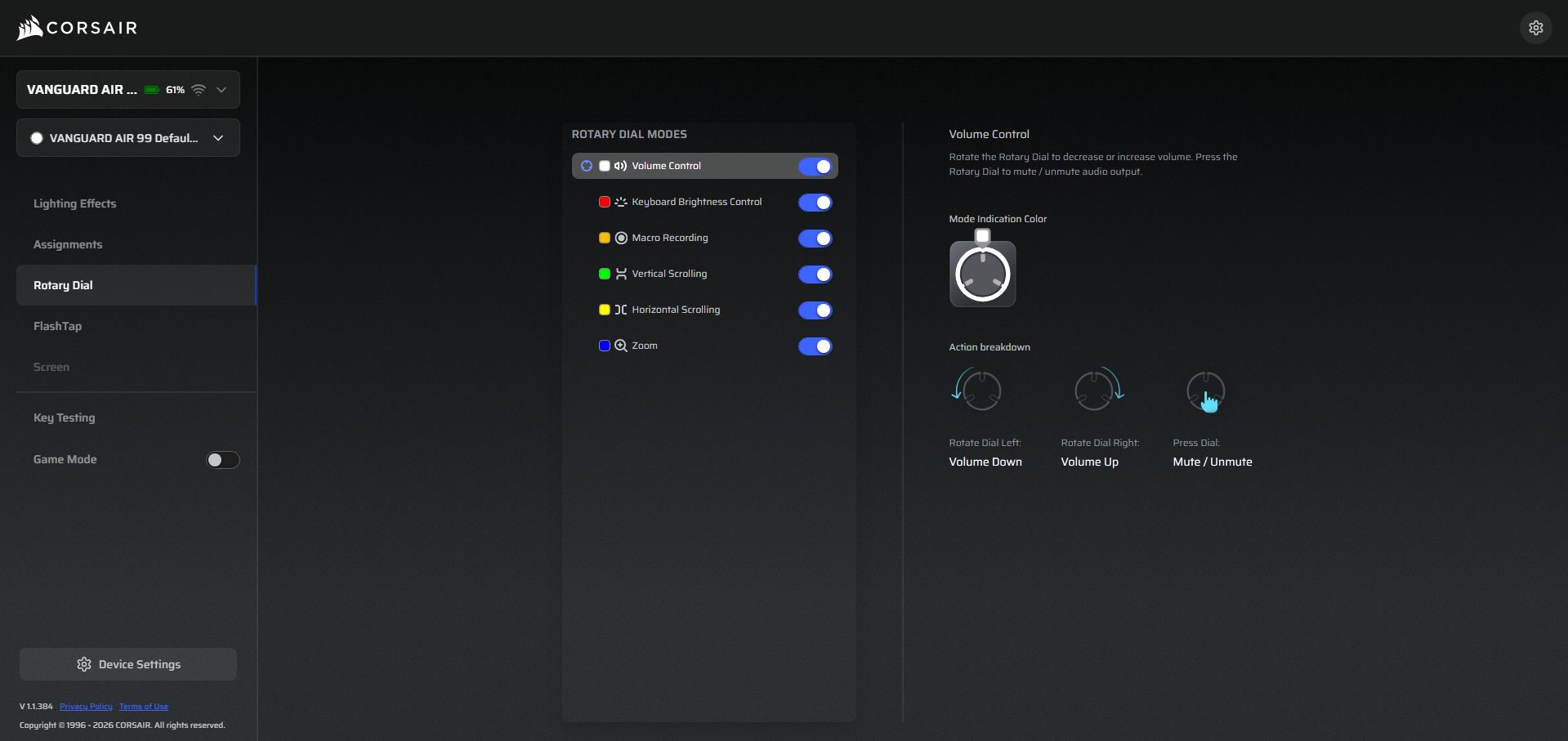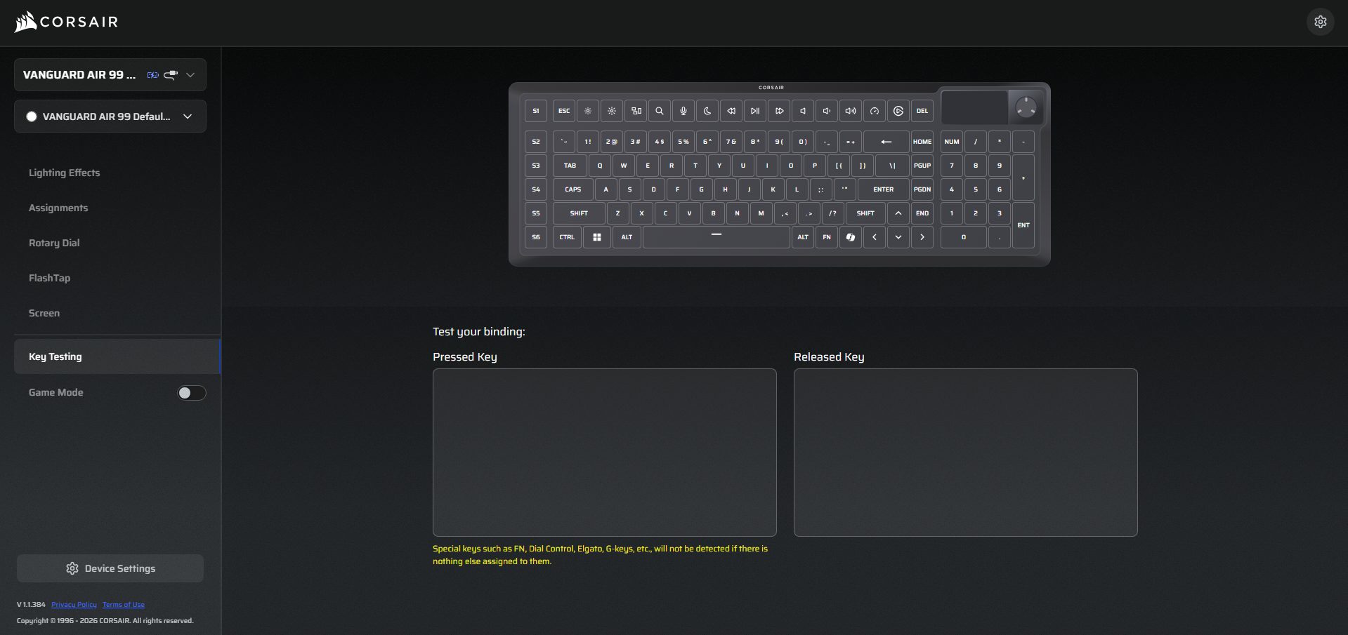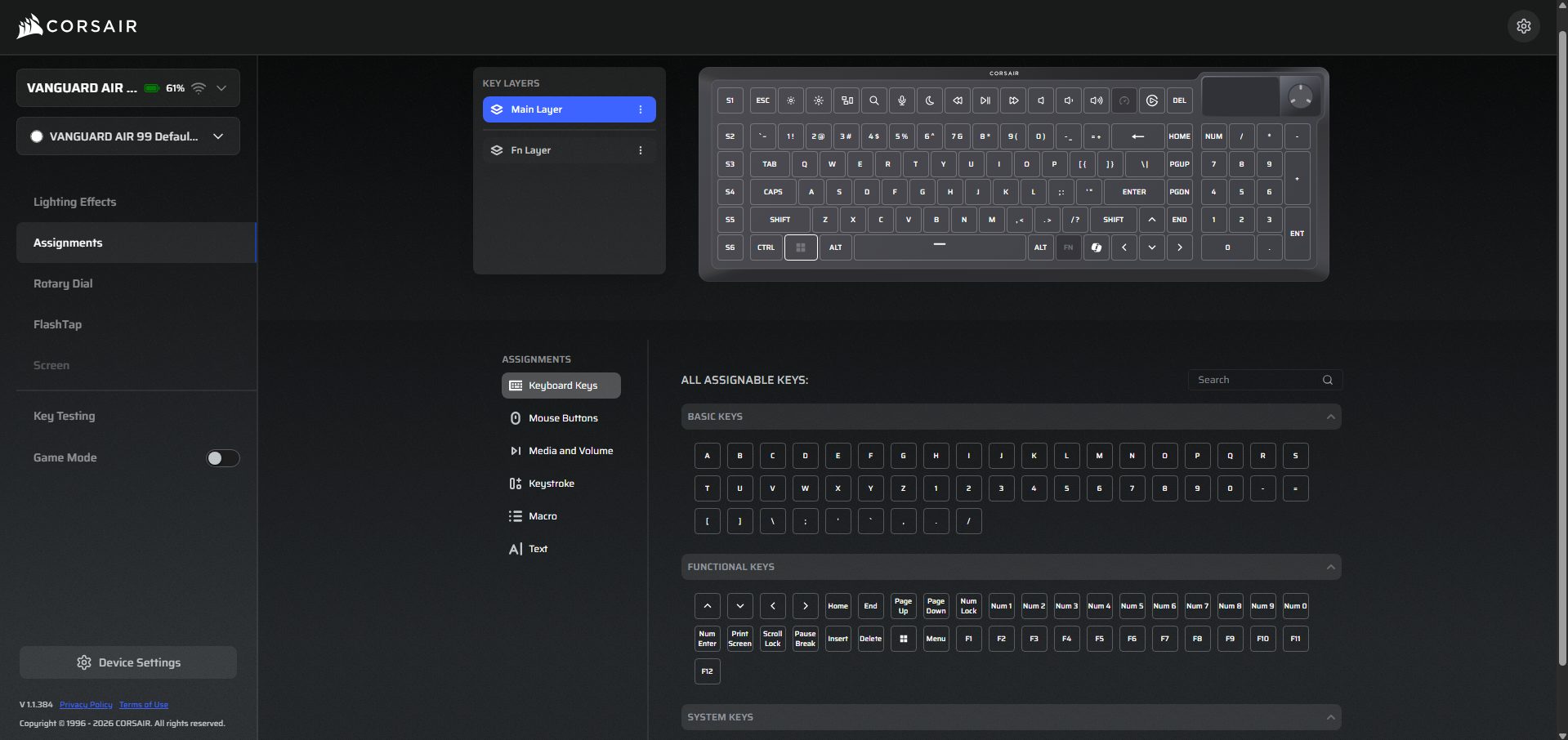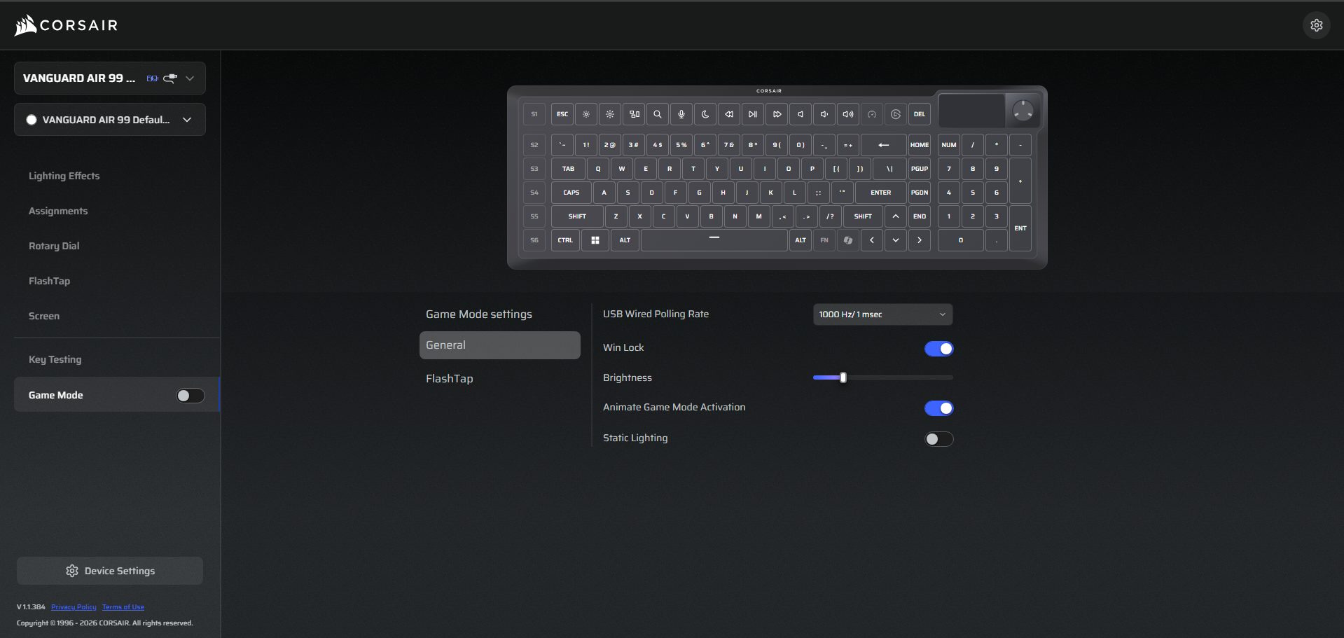 Instead of relying solely on a traditional desktop app, Corsair Vanguard Air 99 primarily uses a browser-based software for most controls. You open it in your browser, connect the keyboard, and that’s where everything shows up. Once you’re inside, the layout is fairly straightforward. There are separate sections for lighting, key assignments, the rotary dial, FlashTap, the screen, and game mode.