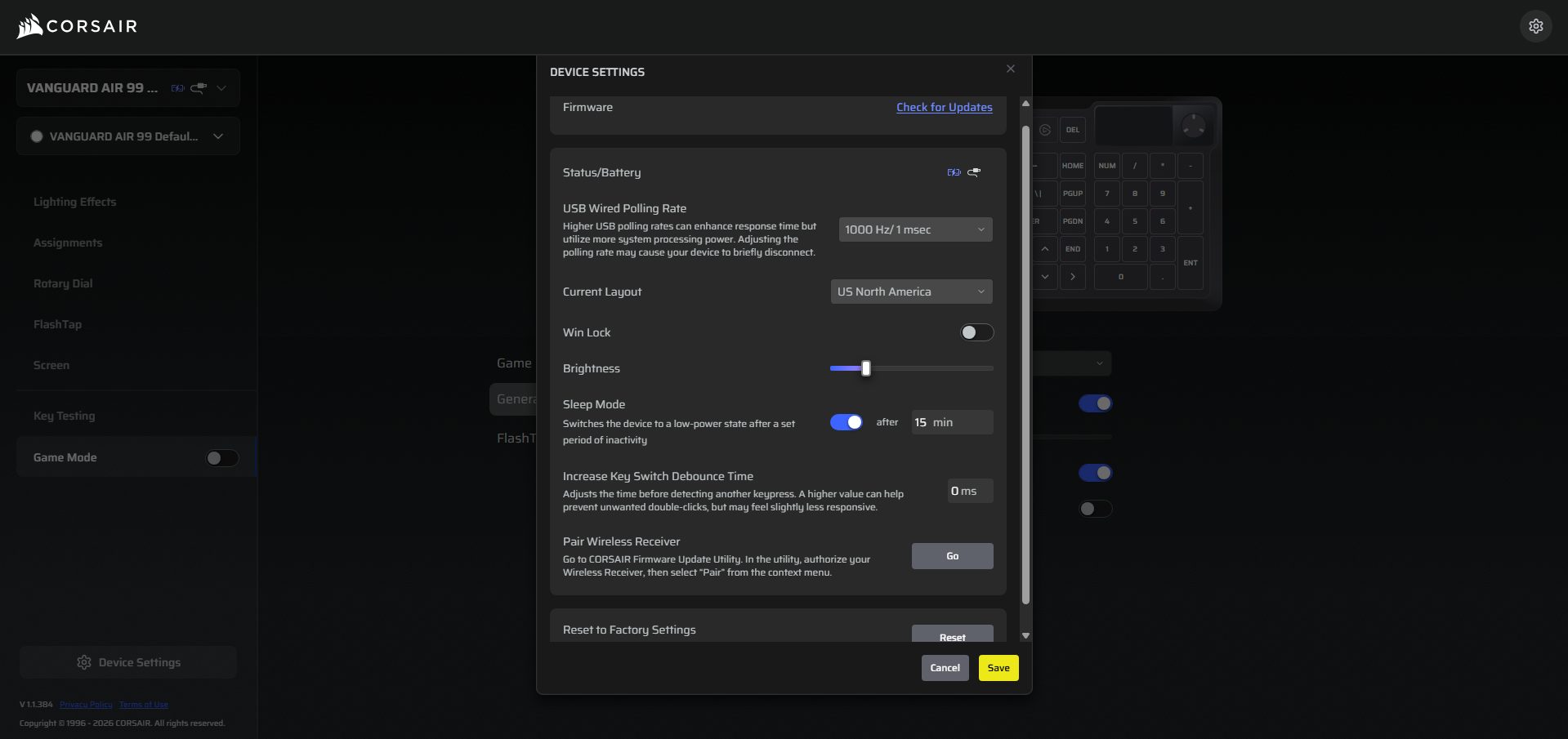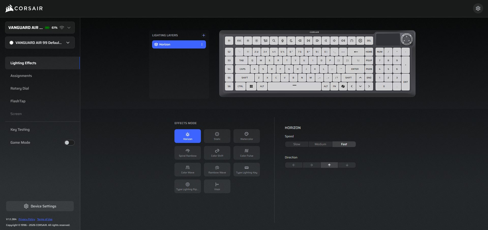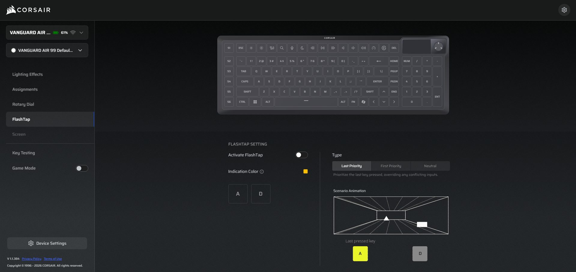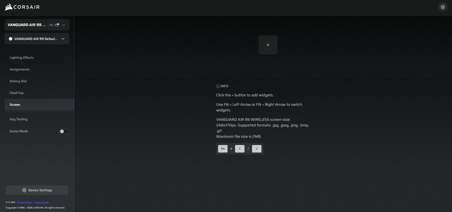 Instead of relying solely on a traditional desktop app, Corsair Vanguard Air 99 primarily uses a browser-based software for most controls. You open it in your browser, connect the keyboard, and that’s where everything shows up. Once you’re inside, the layout is fairly straightforward. There are separate sections for lighting, key assignments, the rotary dial, FlashTap, the screen, and game mode.