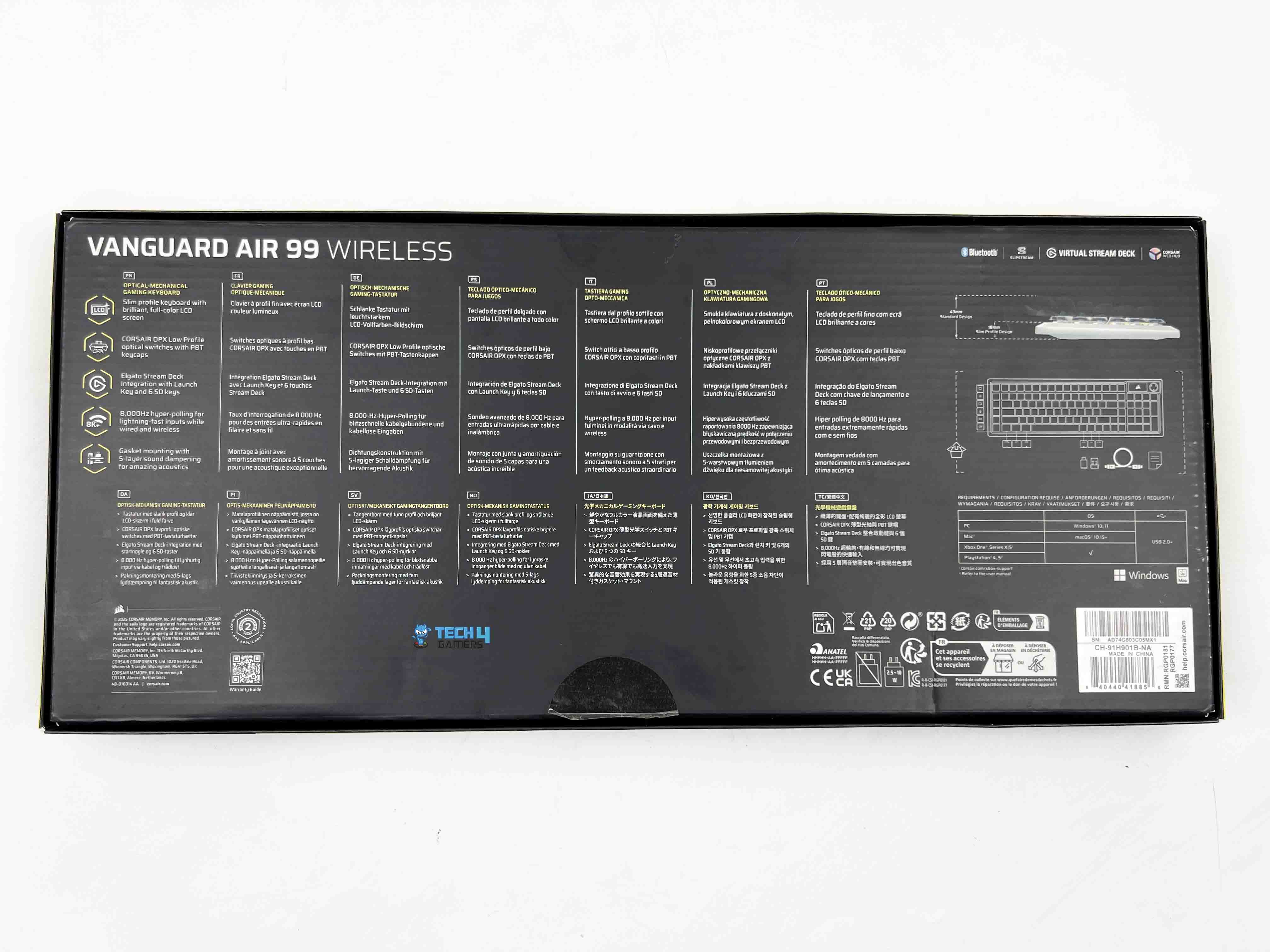 The Corsair Vanguard Air 99 packaging sticks to Corsair’s usual style. You get the black-and-yellow box, with a large image of the keyboard on the front. The model name sits up top alongside the Corsair logo. A breakdown of the features is printed in multiple languages on the back of the box. It’s all pretty familiar if you’ve purchased Corsair’s other products.