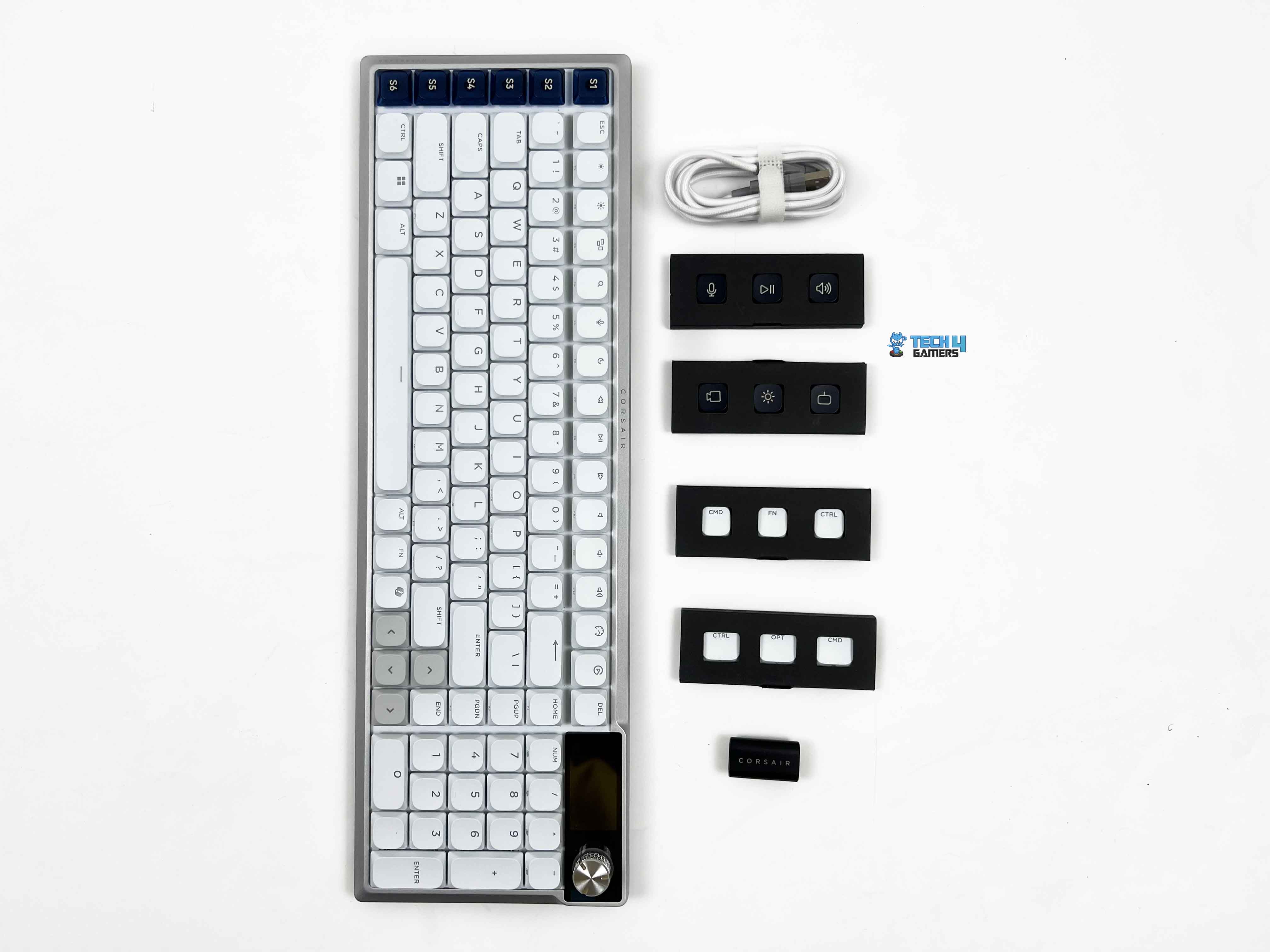 The legends are clean and well-defined. Since they’re double-shot, they won’t fade or wear off with use. Corsair also includes extra keycap sets in the box. There’s a set of six icon-based keycaps designed for the Stream Deck-style keys on the left. These give you a more visual way to identify shortcuts if you’re using those keys often. There’s also a separate set of Mac-specific keycaps. If you switch to macOS, you can swap those in.