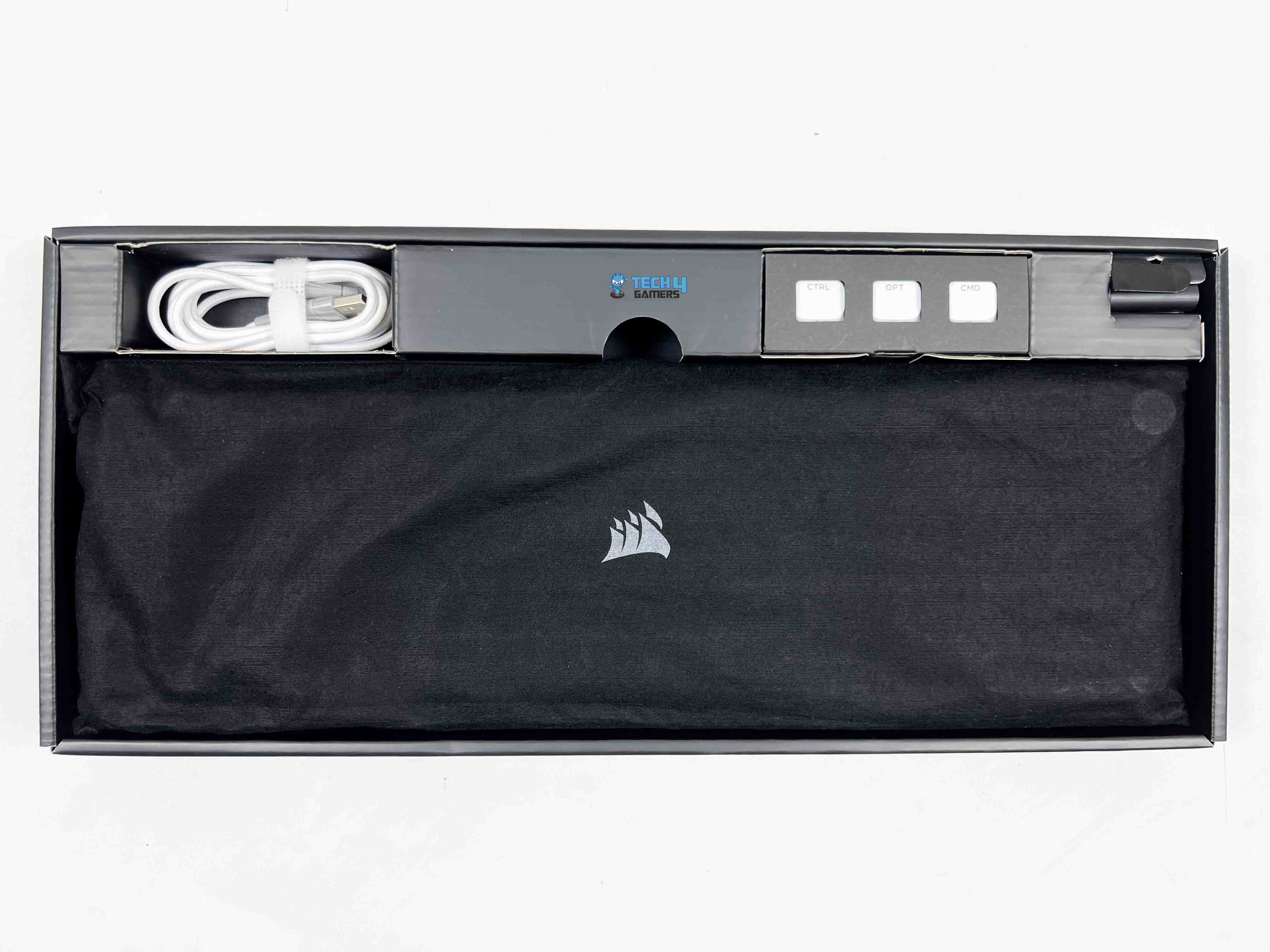 When you open the box, the Corsair Vanguard Air 99 is wrapped in a black cloth sleeve. Above the keyboard, Corsair has arranged the accessories into separate compartments. The extra keycaps come in their own small box, which is tucked into one section. The same goes for the USB Type-C to Type-A cable and the Type-C to Type-A adapter.
