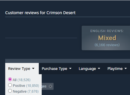 • Crimson Desert has fewer positive reviews on Steam compared to Dragon Age Veilguard.