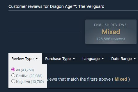 Currently, Crimson Desert has 18,526 ratings on Steam, of which 10,850 are positive, accounting for 58.57% of the total. Whereas Dragon Age Veilguard is rated by 43,741 people, out of which 29,998 reviews are positive, which makes up for nearly 69% of the total.