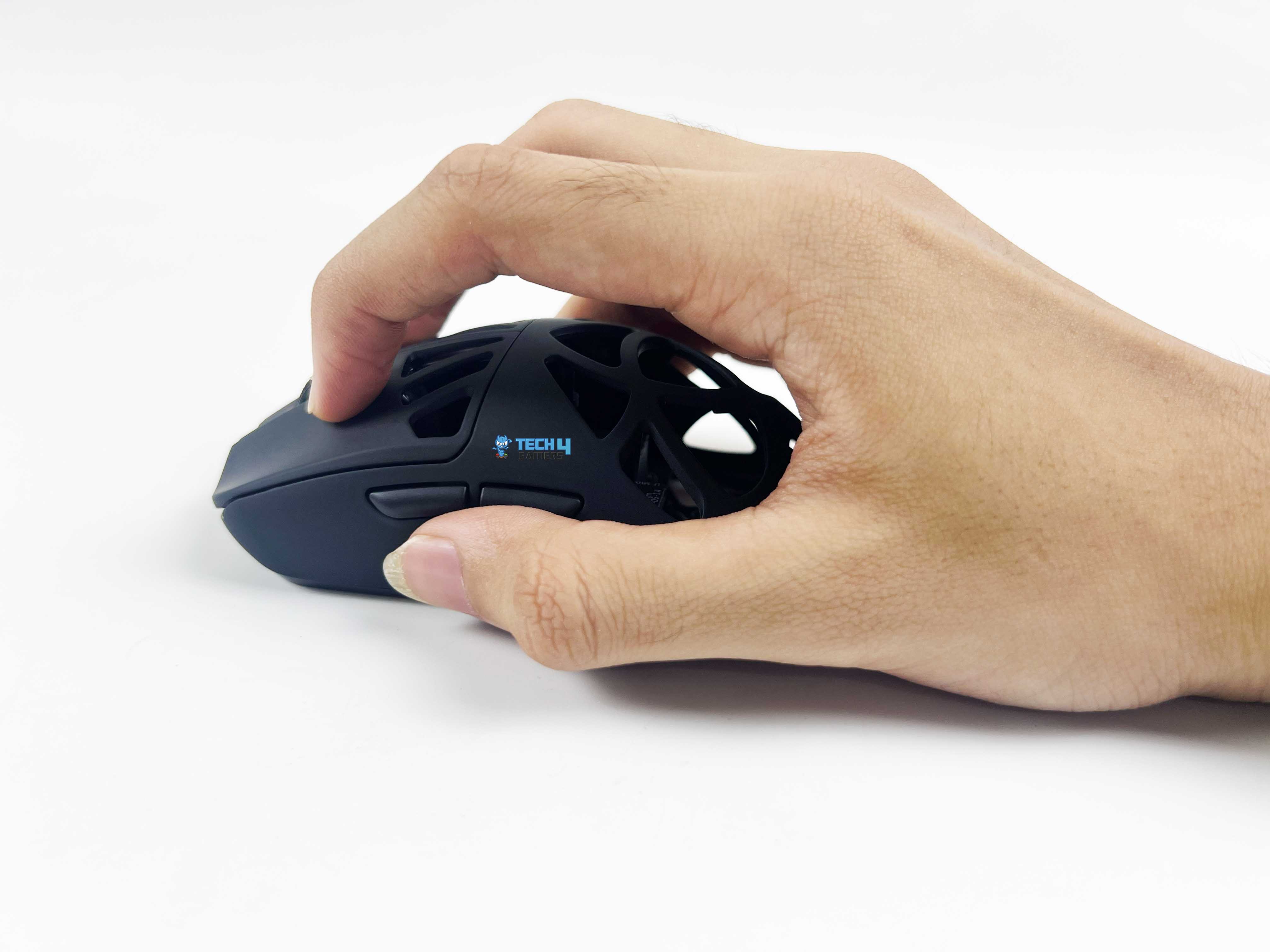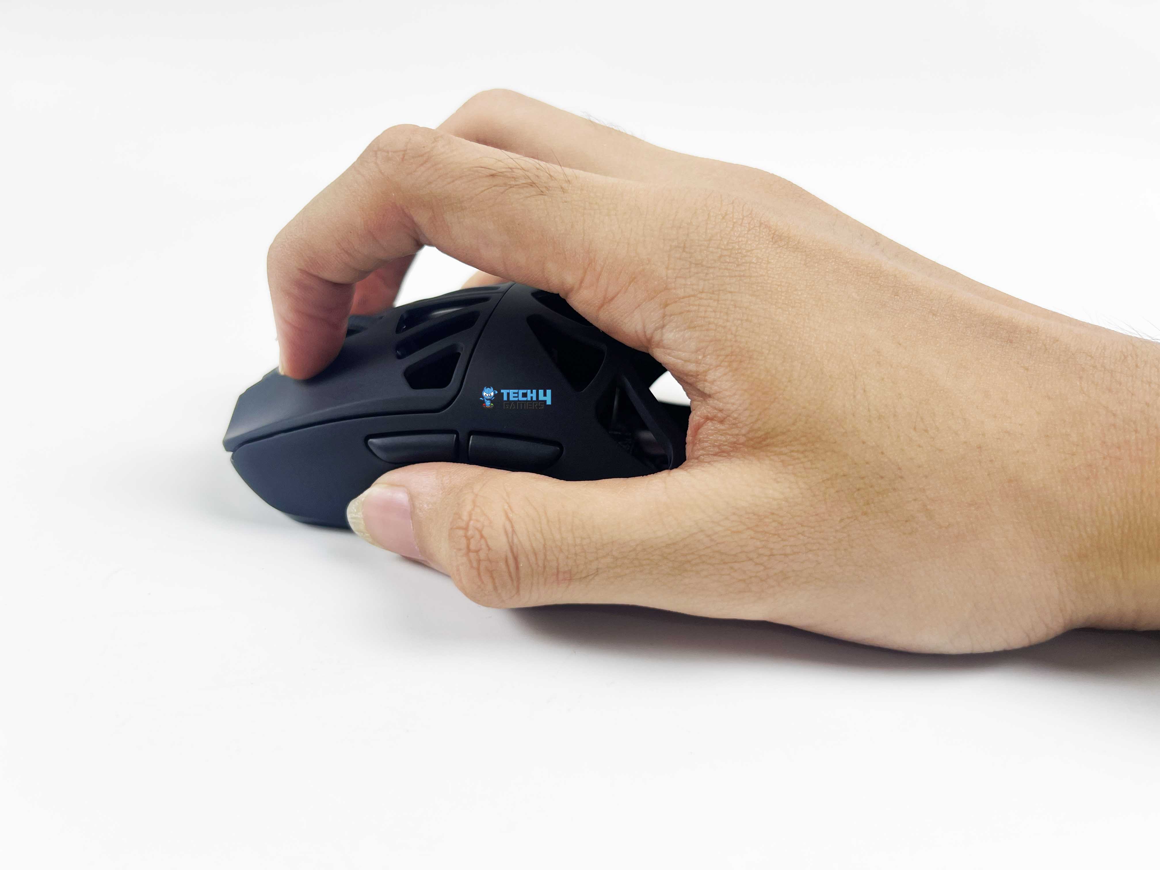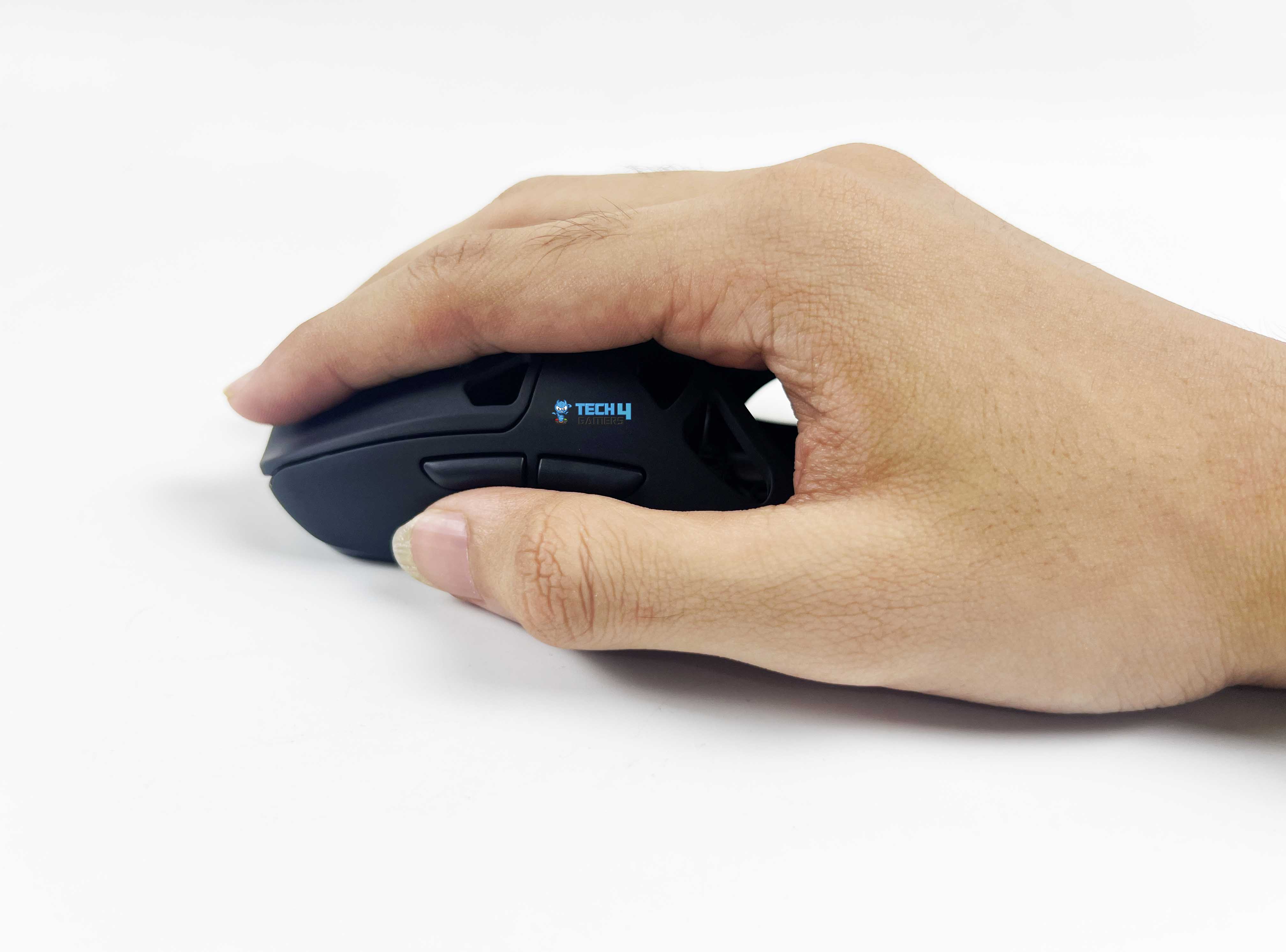 The Epomaker CarbonX marks a noticeable departure from the company’s earlier, more conventional designs. In comparison, Epomaker calls it a symmetrical esports mouse. However, once you hold it, it’s clear that it’s meant for right-handed users, as the side buttons are placed on the left side. The shape features a smooth, natural curve that feels comfortable in the hand.
