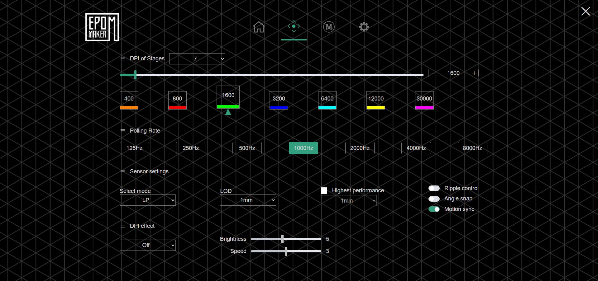 DPI | 7 stages adjustable at 400, 800, 1600, 2400, 3200, 5000, and 30000 |