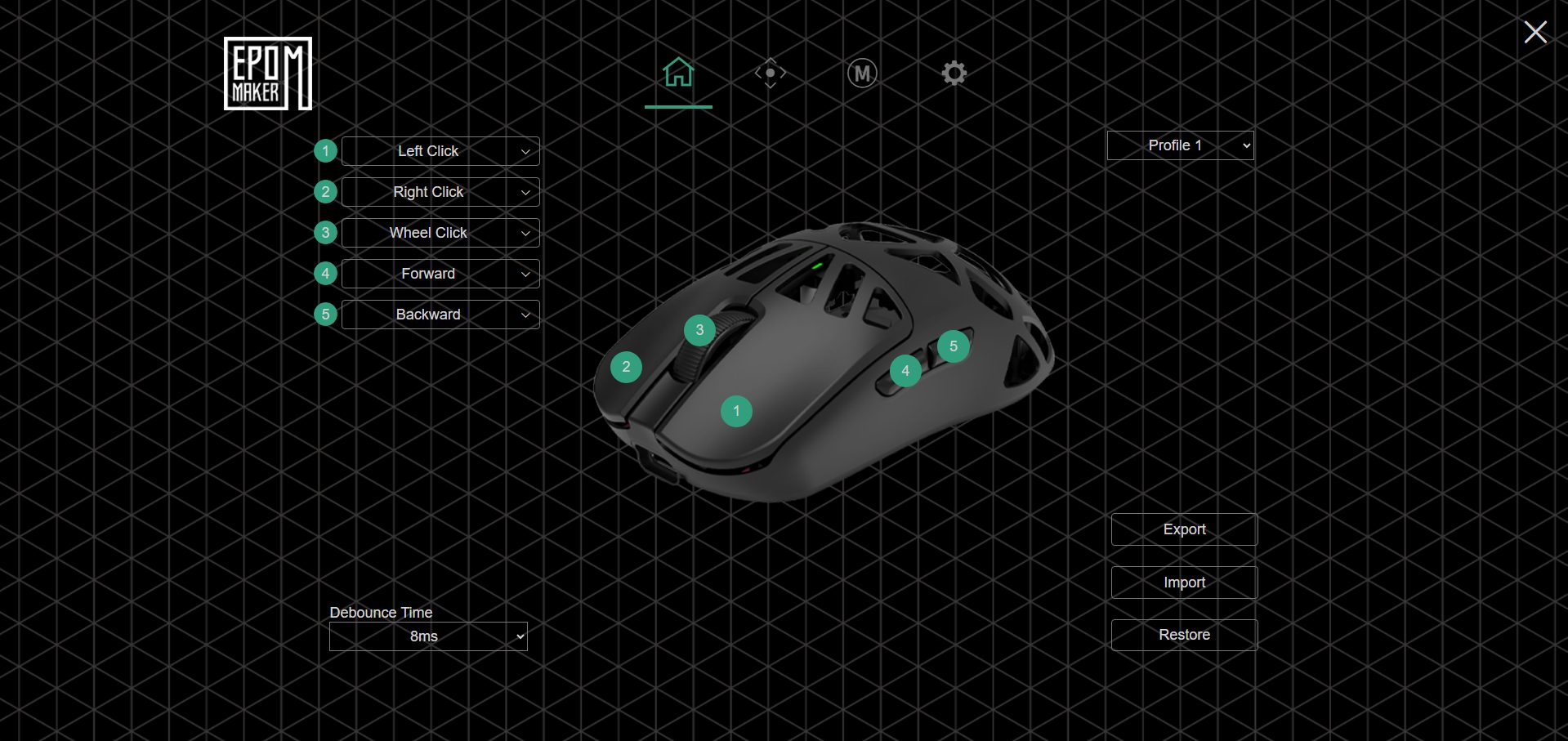 Once you open the online software, you get access to everything you’d expect, including button remapping, macro recording, debounce time adjustment, DPI stage customization (up to 7 levels), polling rate control (125Hz to 8000Hz), motion sync, lift-off distance settings, and even firmware updates. All five buttons are programmable, except for the main left-click button, and you can also create up to four different profiles.
