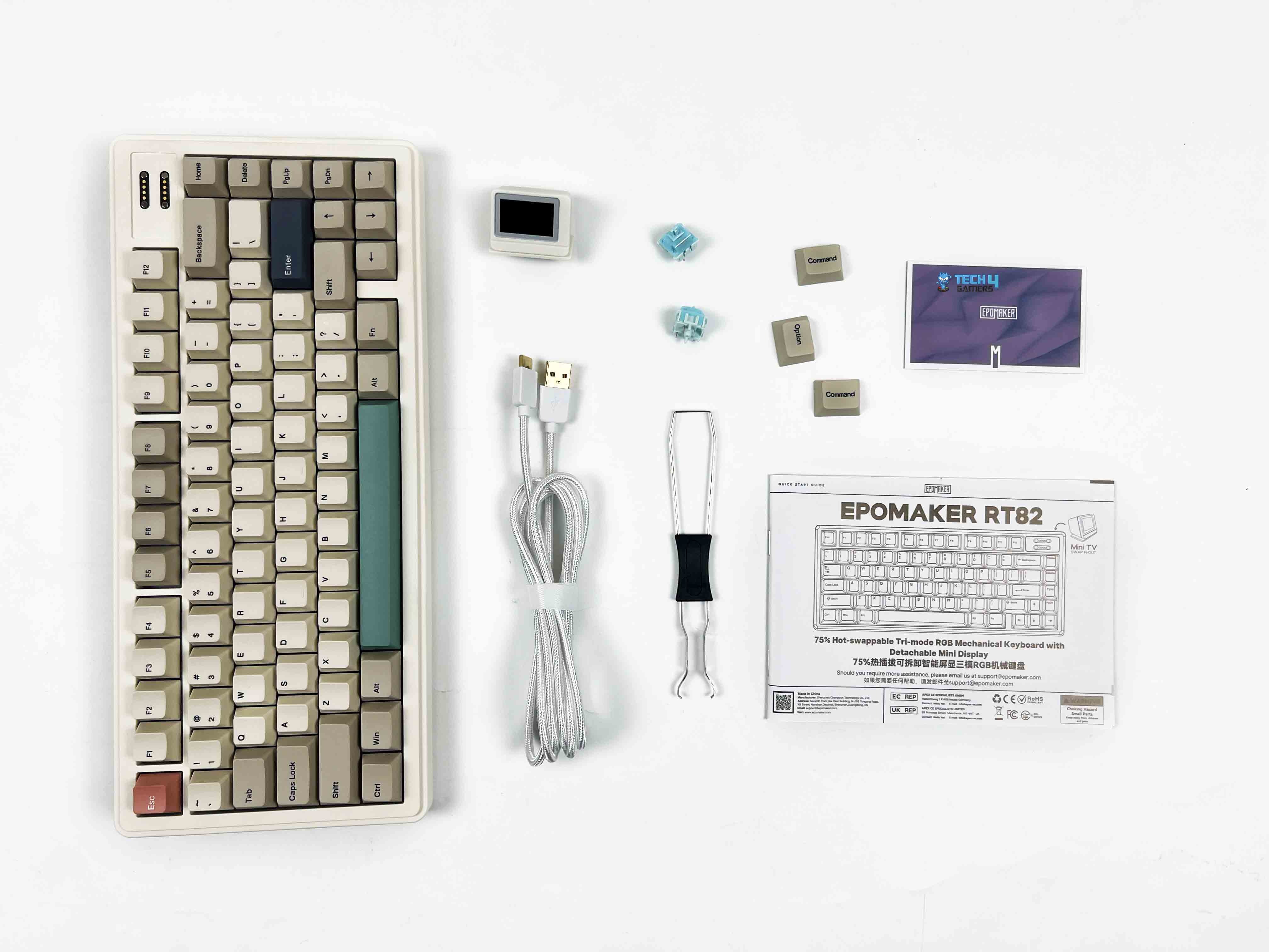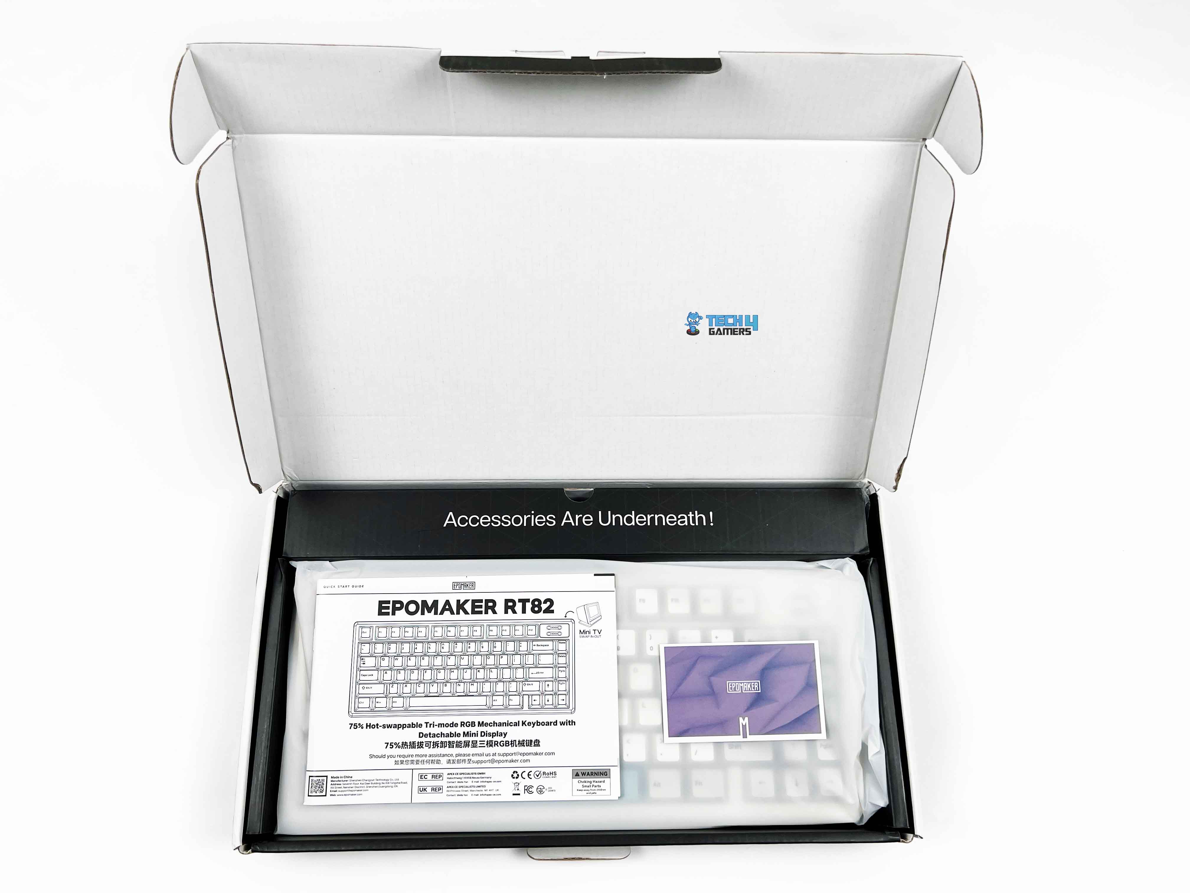 The Epomaker RT82 packaging is reasonably compact. You get an image of the keyboard on the front, along with branding and feature callouts. When you open the box, the keyboard is right there, wrapped in a thin protective sleeve. Above the keyboard, you’ll find the accessories tucked into their own compartments. Here is the list of everything that you’ll find inside the keyboard: