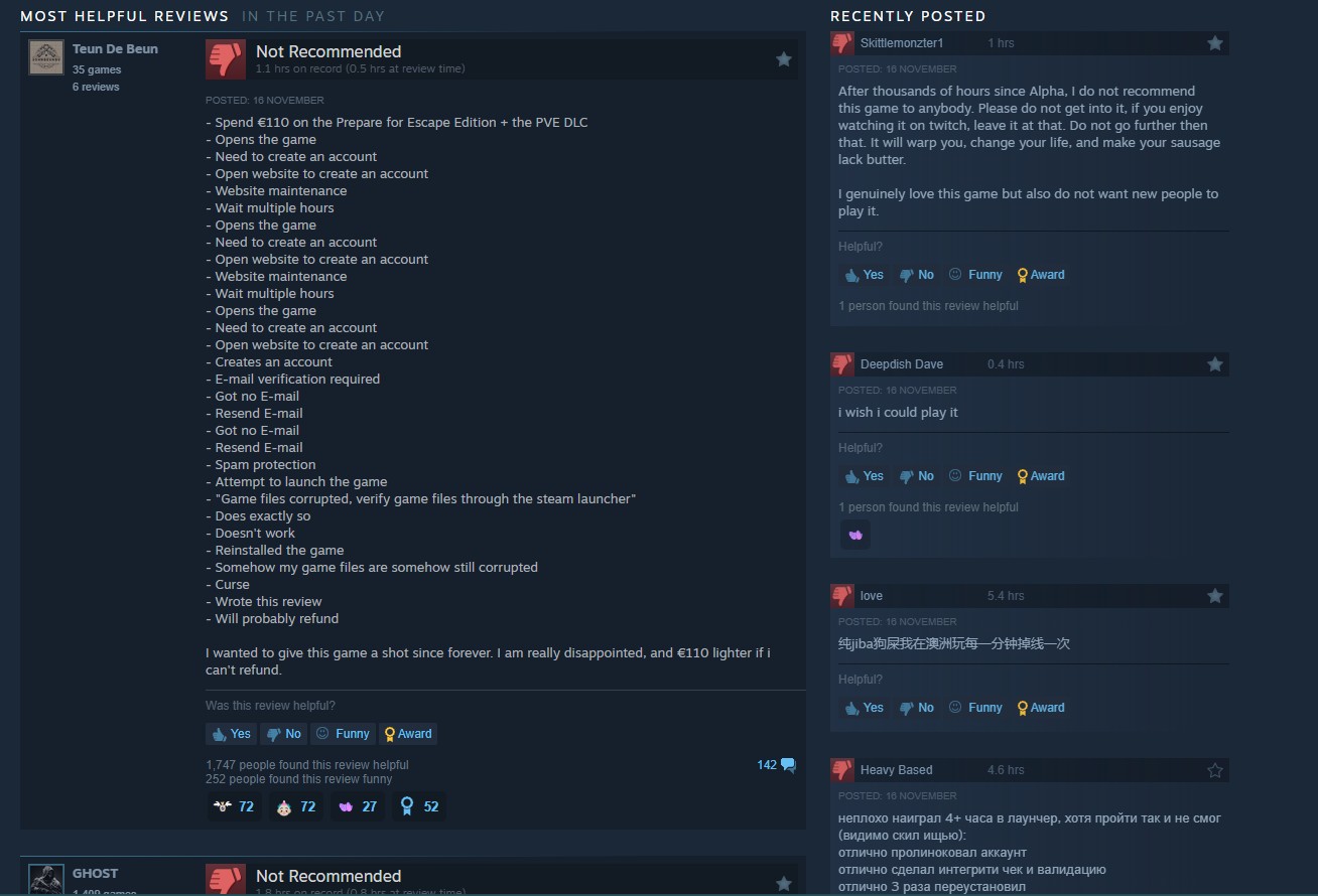 Battlestate servers overloading also made the game pretty much unplayable, even nearly a day after launch. This has caused players to review bomb the Escape From Tarkov Steam page.