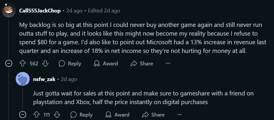 Damn, those are brutal. Game prices increasing so soon after they went up to $70 is not going to go over well. $70 already significantly cut down on how many new games I buy per year. I can’t imagine spending $80 on anything on release other than maybe GTA VI.