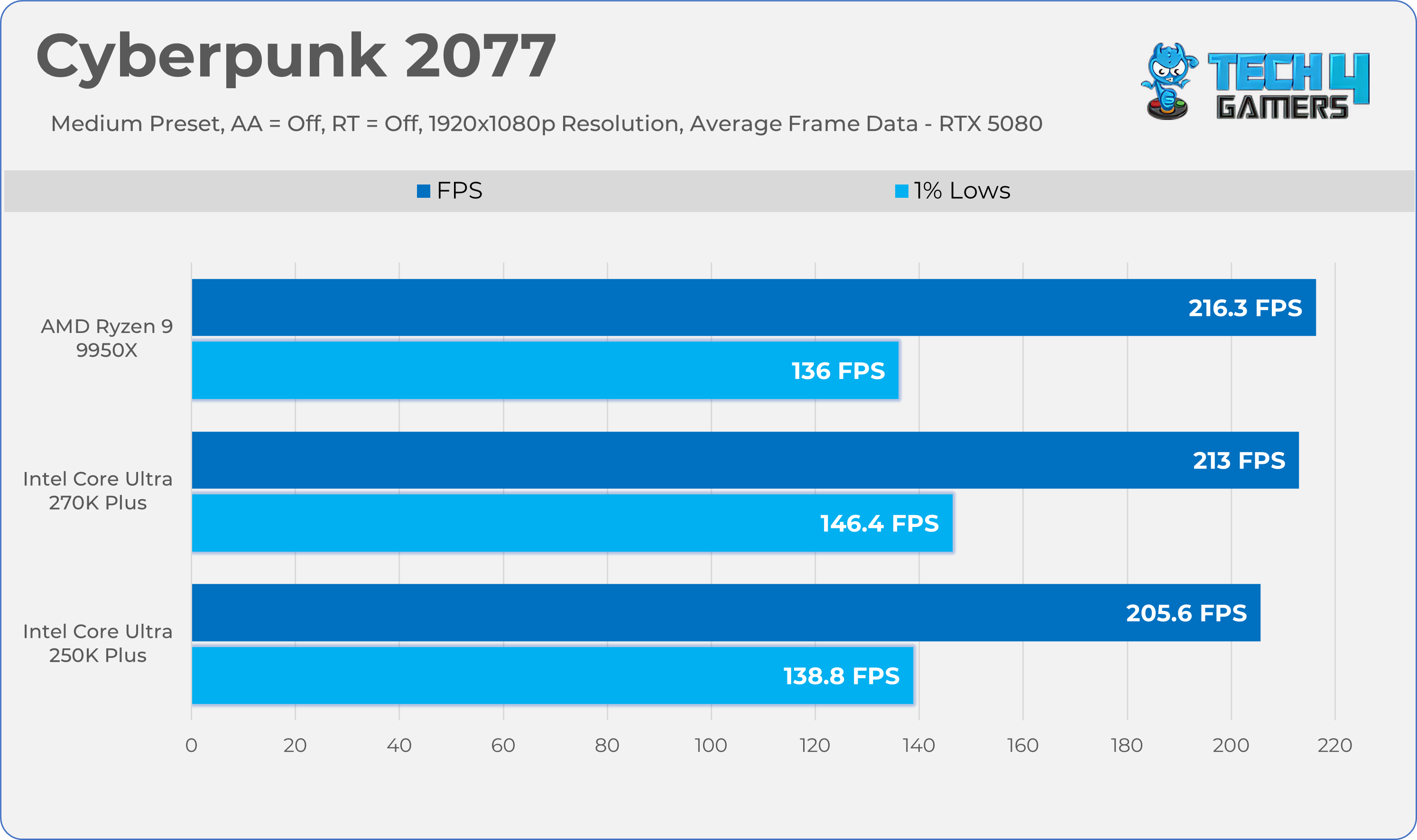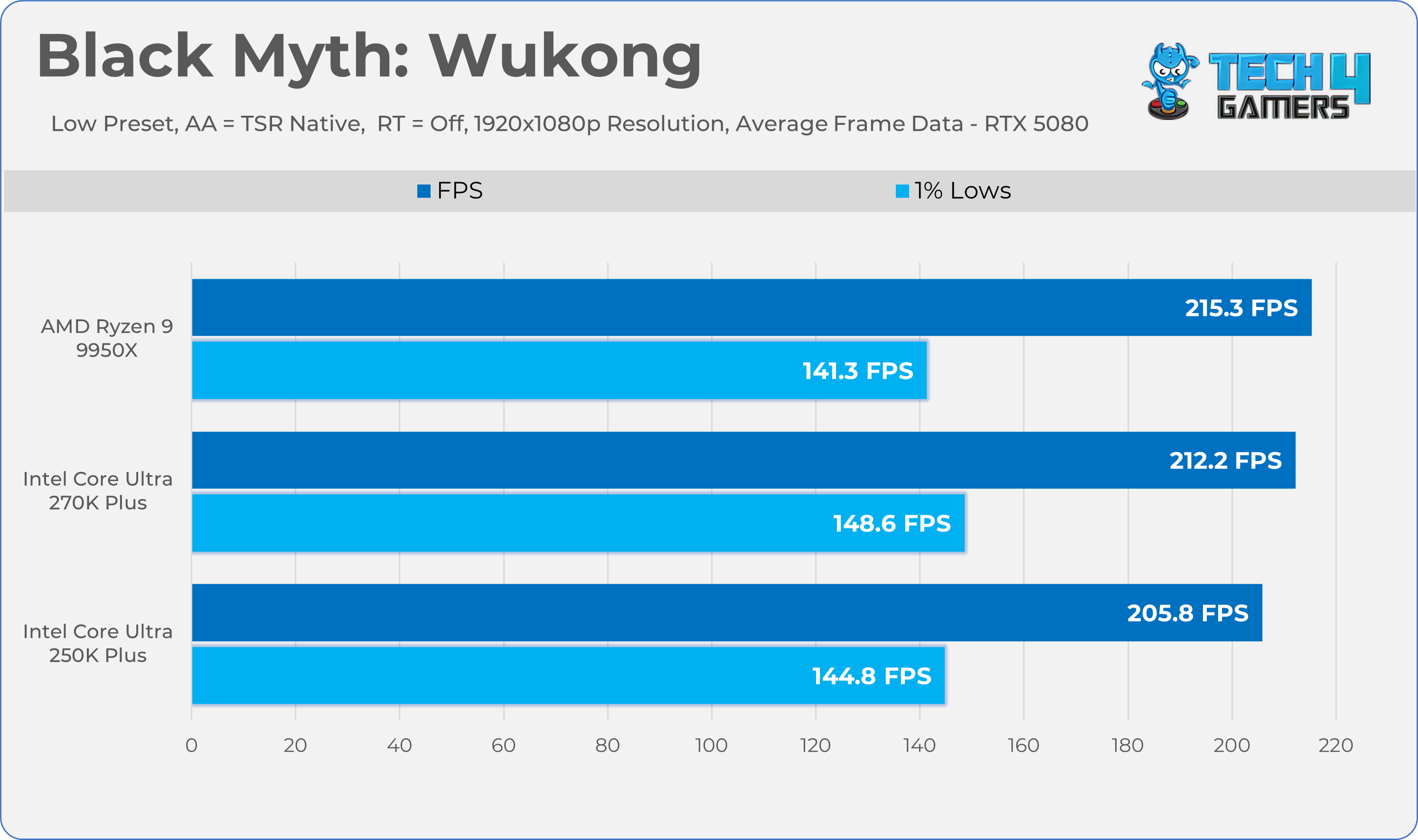 In games, the Intel Core Ultra 270K Plus is less impressive, though. Core Ultra 250K Plus offers greater value and runs more efficiently for gaming. The 270K Plus is still a highly capable processor, but it still cannot outperform the AMD Ryzen 9 9950X in the majority of games, though the difference is not very huge. In many games, the 270K Plus provides basically zero advantage over the $199 Core Ultra 250K Plus in a few games. However, with more cores and threads, the 270K Plus provides smoother pacing, especially in Black Myth Wukong and Cyberpunk 2077. If high-refresh-rate competitive gaming is the goal, AMD still remains the undisputed king. Still, The 270K Plus seems to be a difficult CPU for gaming, offering flagship-level performance and exceptional frame pacing, but its inconsistency is still glaring, suggesting potential thread-scheduling or cross-die latency issues that can be easily addressed by the Intel platform drivers.