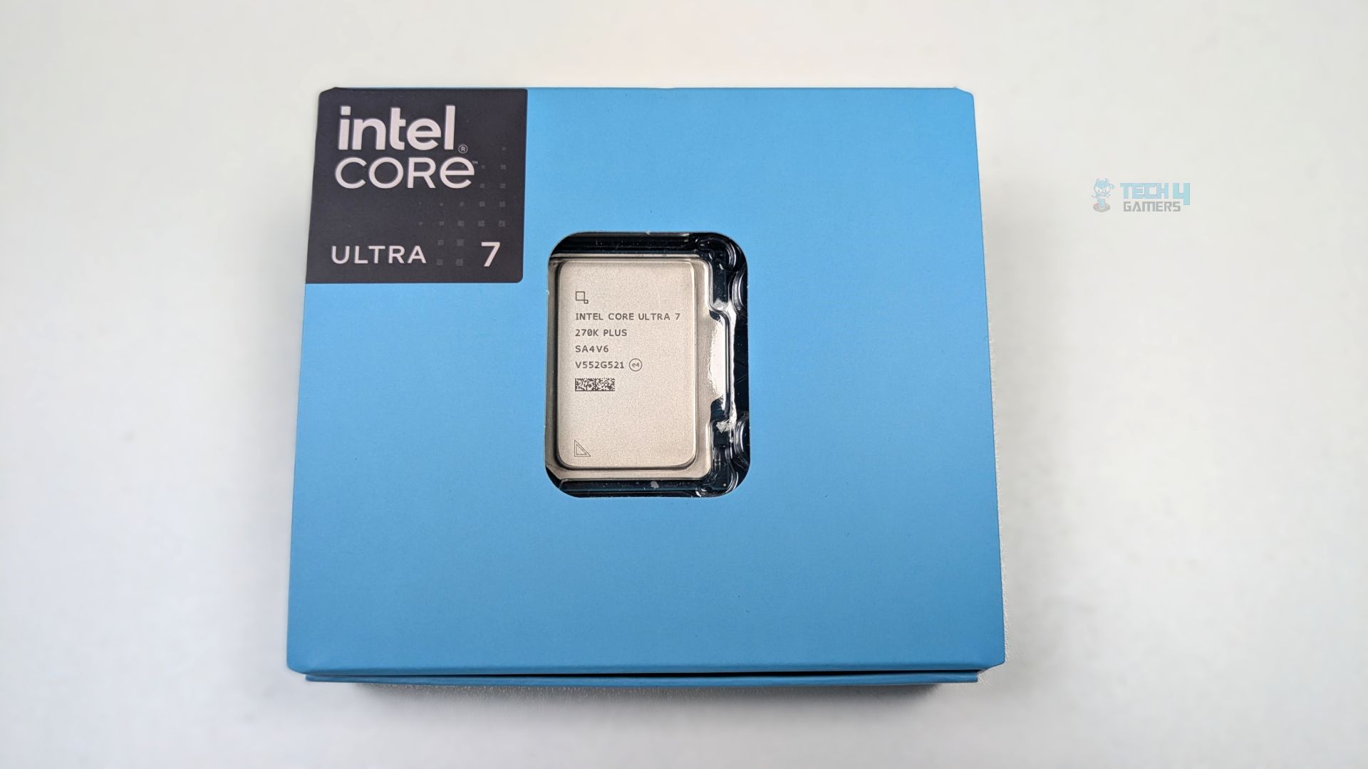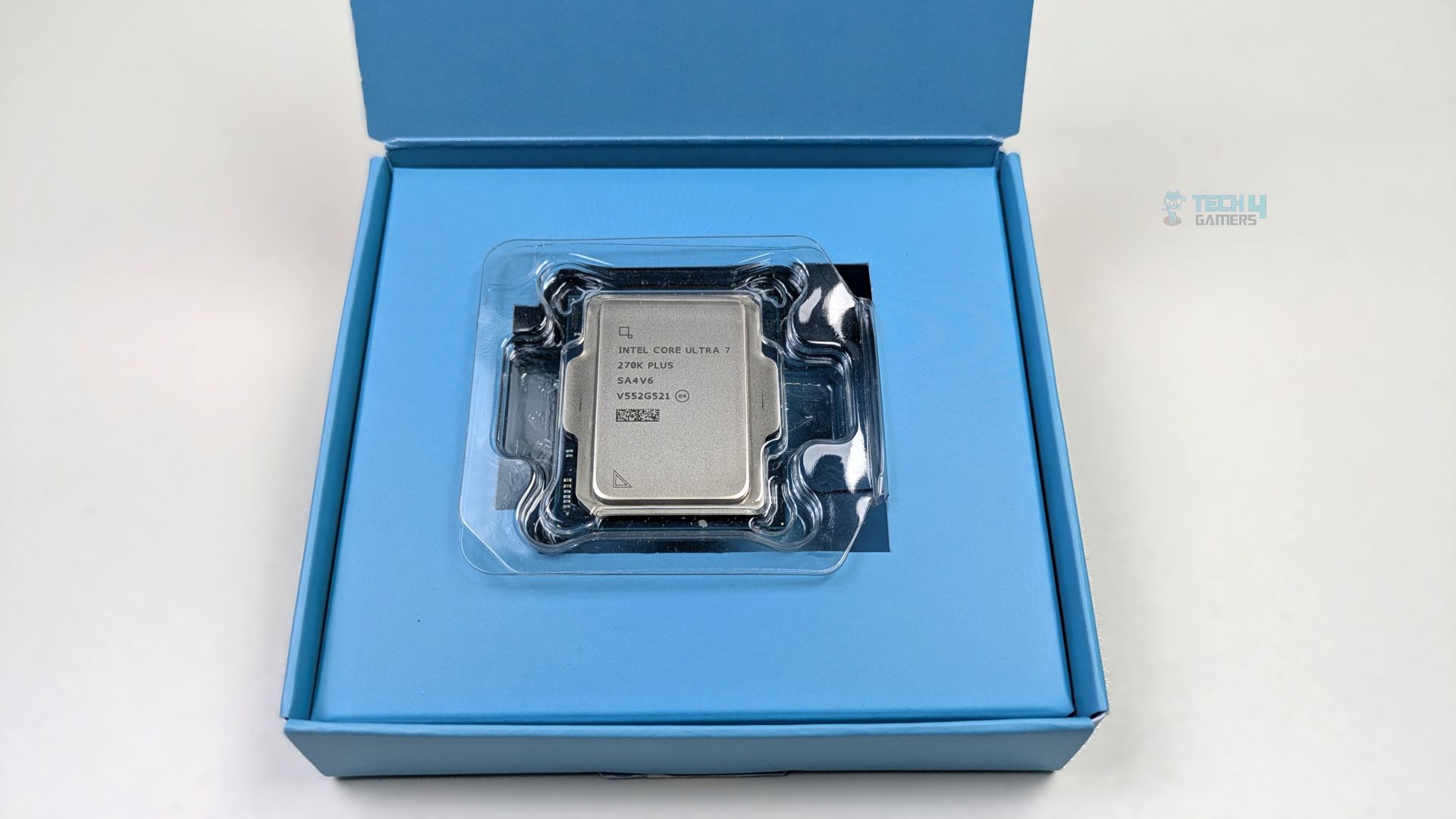 The Intel Core Ultra 270K Plus comes in simple blue cardboard packaging, secured in a plastic tray.