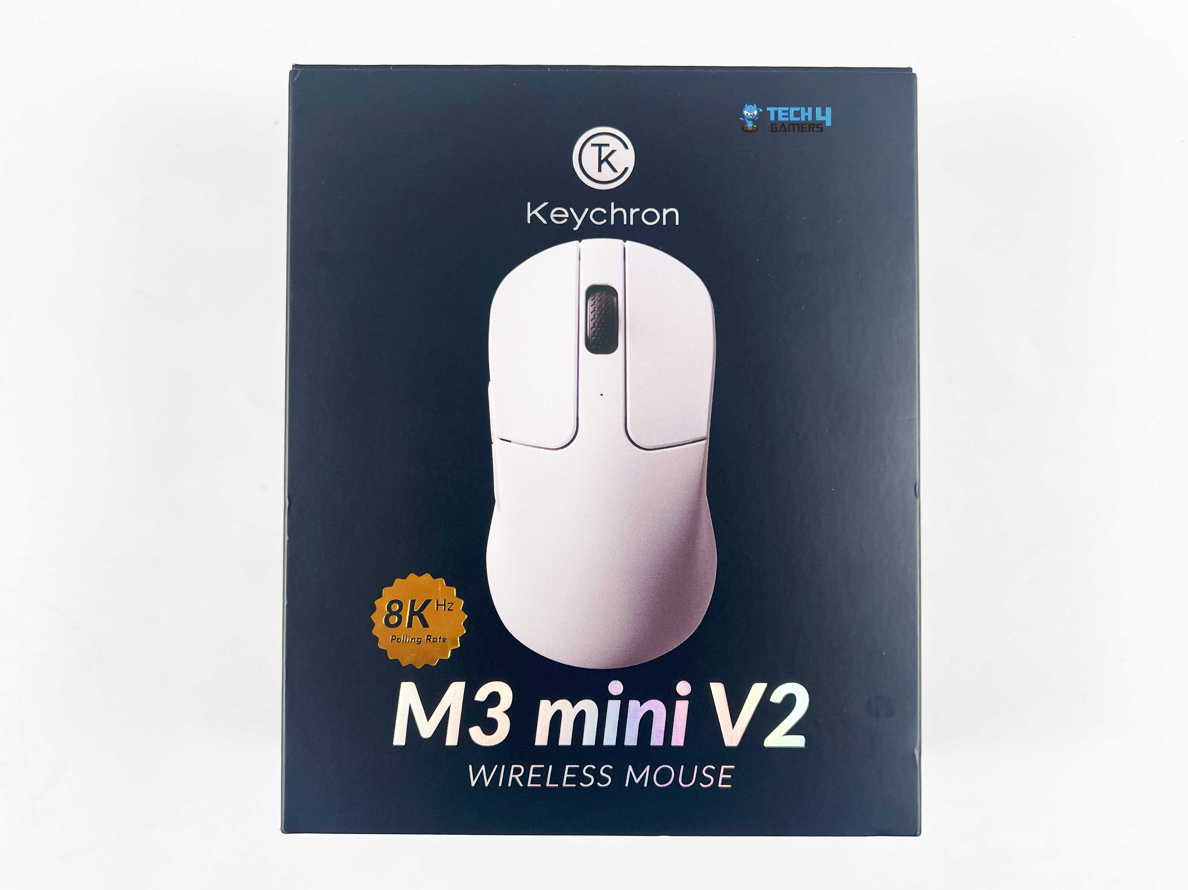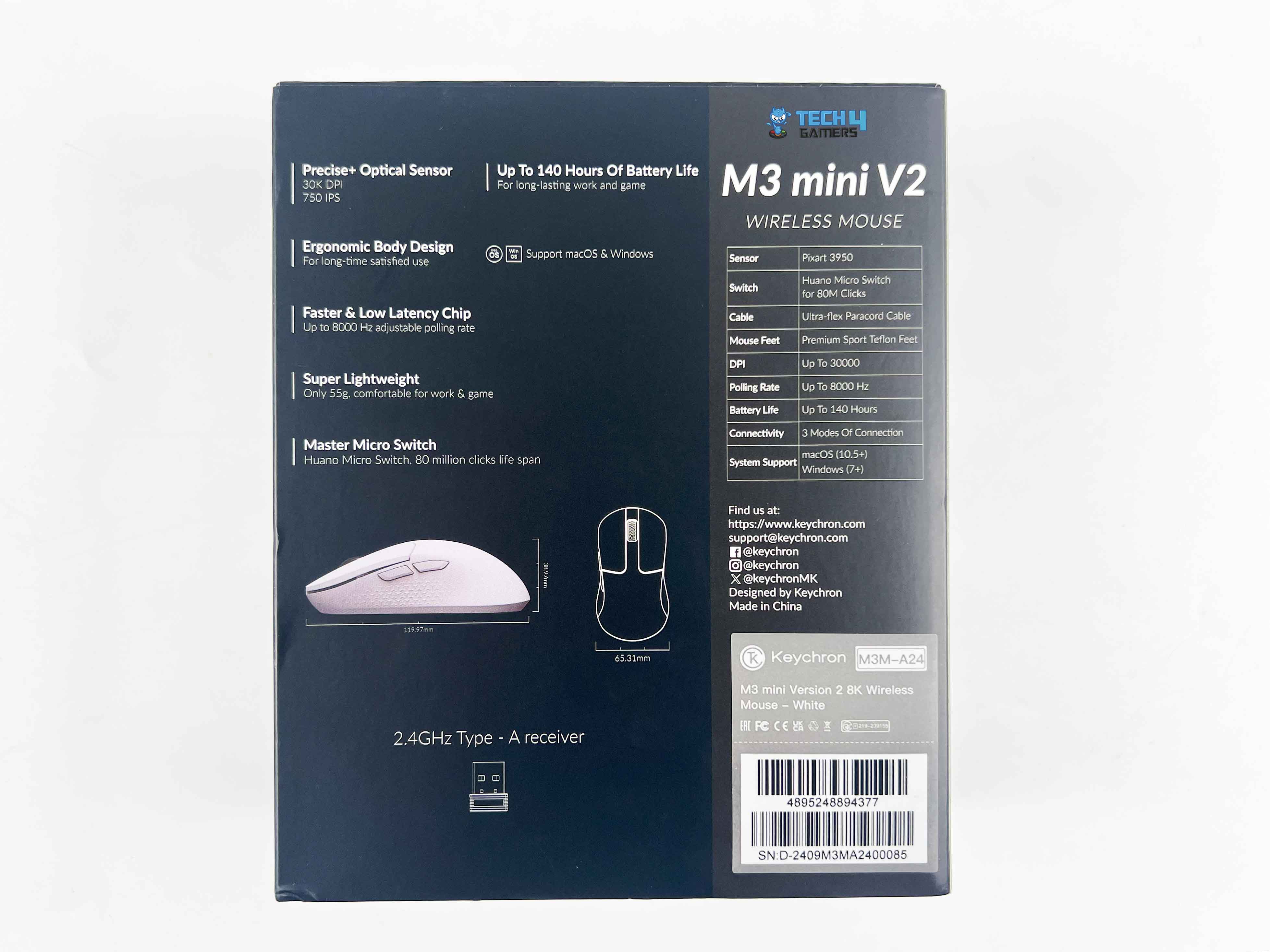 The M3 Mini V2 arrives in an all-black box and slipcover. On the front, you’ll find an image of the mouse, along with the Keychron branding, and a gold badge that highlights the 8KHz polling rate. Additionally, key features are written with small icons along the sides. On the back, you’ll find the technical specifications, along with the mouse’s dimensions, and some of the features from the sides are repeated here.