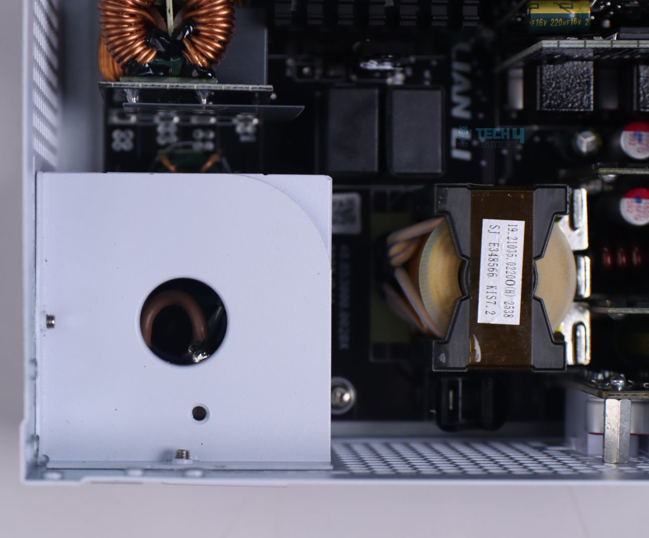 For an 80 Plus Gold rated PSU with 1200W of specs, Lian Li RS1200G seems to be lacking decent chunks of Aluminium heatsinks. This is most likely due to space limitations which for a full form factor 1200W ATX power brick, seems a bit odd but then when you see a huge square plastic block has taken up much of the internal space (the rotatable AC inlet thingy) then it all started to make sense. Due to the densely populated PCB and not much of an empty space for the air to freely roam and cool down the components, Lian Li may either have put an aggressive fan profile or might have just increased RS1200G’S efficiency levels, we will see it in our test.
