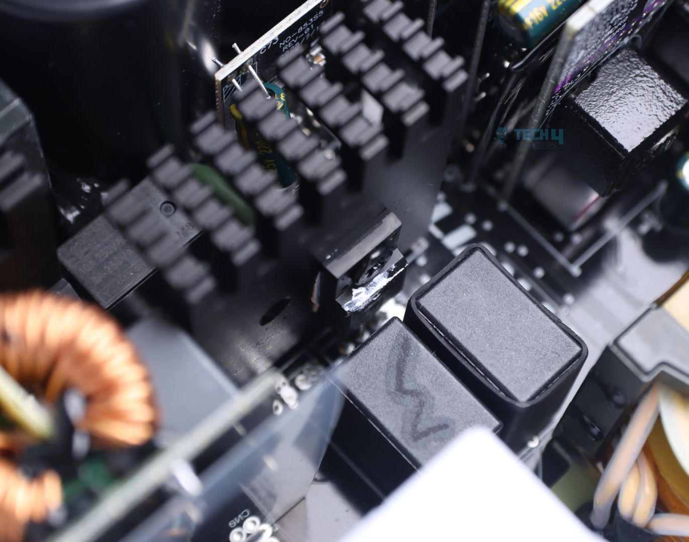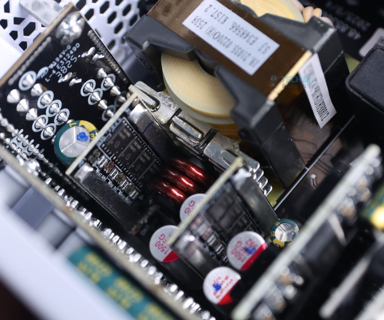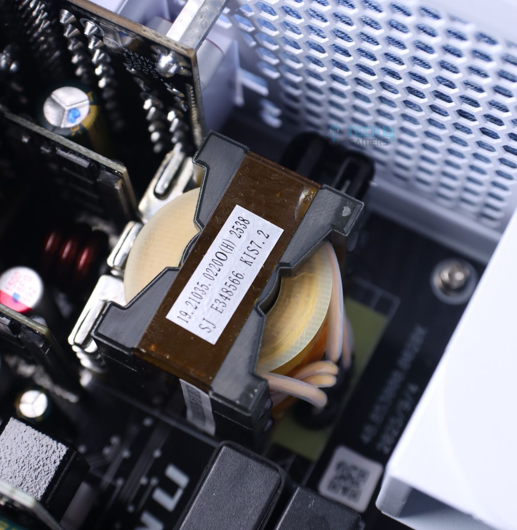 The main 12V rail Transformer design is very similar to what many new OEMs have been implementing lately and we have also seen the similar looking ones previously in the PSUs we have tested before. This unique design uses flat copper coil/wire with more increased surface area than traditional copper wire. This allows the transformer to be switched at a much higher frequency and, as a result, increases its power handling capability as well.