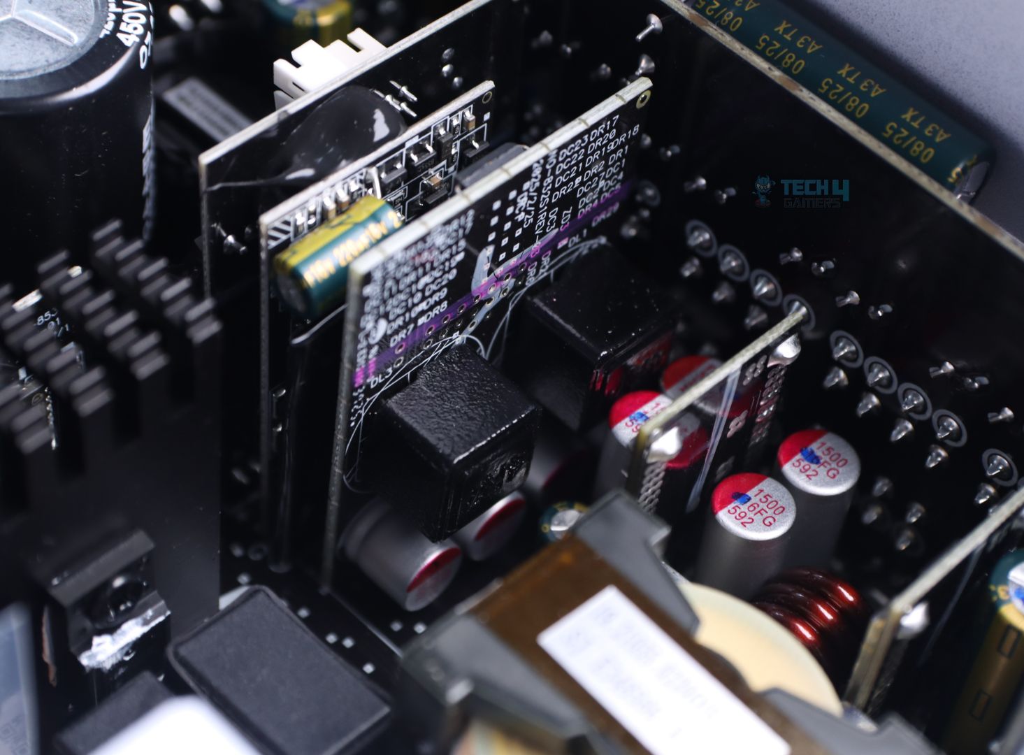 Two vertically mounted PCBs are placed directly near the transformer where 12V rail SMD MOSFETs are soldered.
