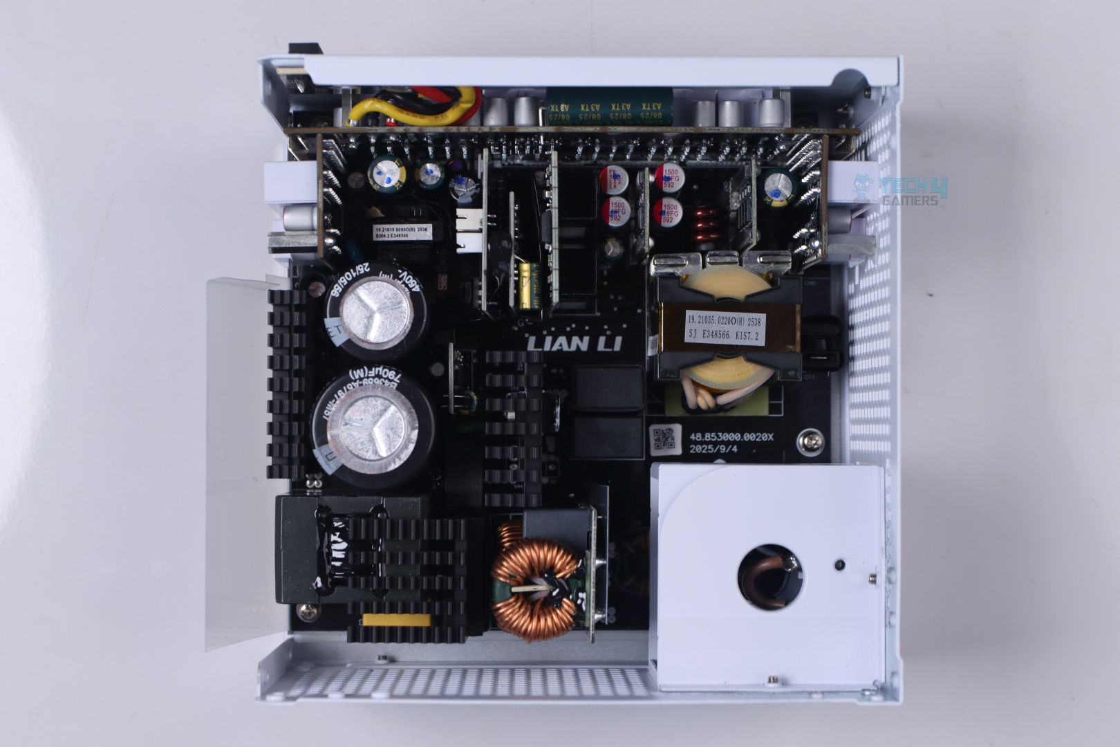 For the secondary rail generation, Half-Bridge LLC topology is used via two MOSFETs. The PCB design allows mounting/soldering of two additional MOSFETs for a Full-Bridge LLC topology, but Lian Li kept it to only two for keeping the cost down.