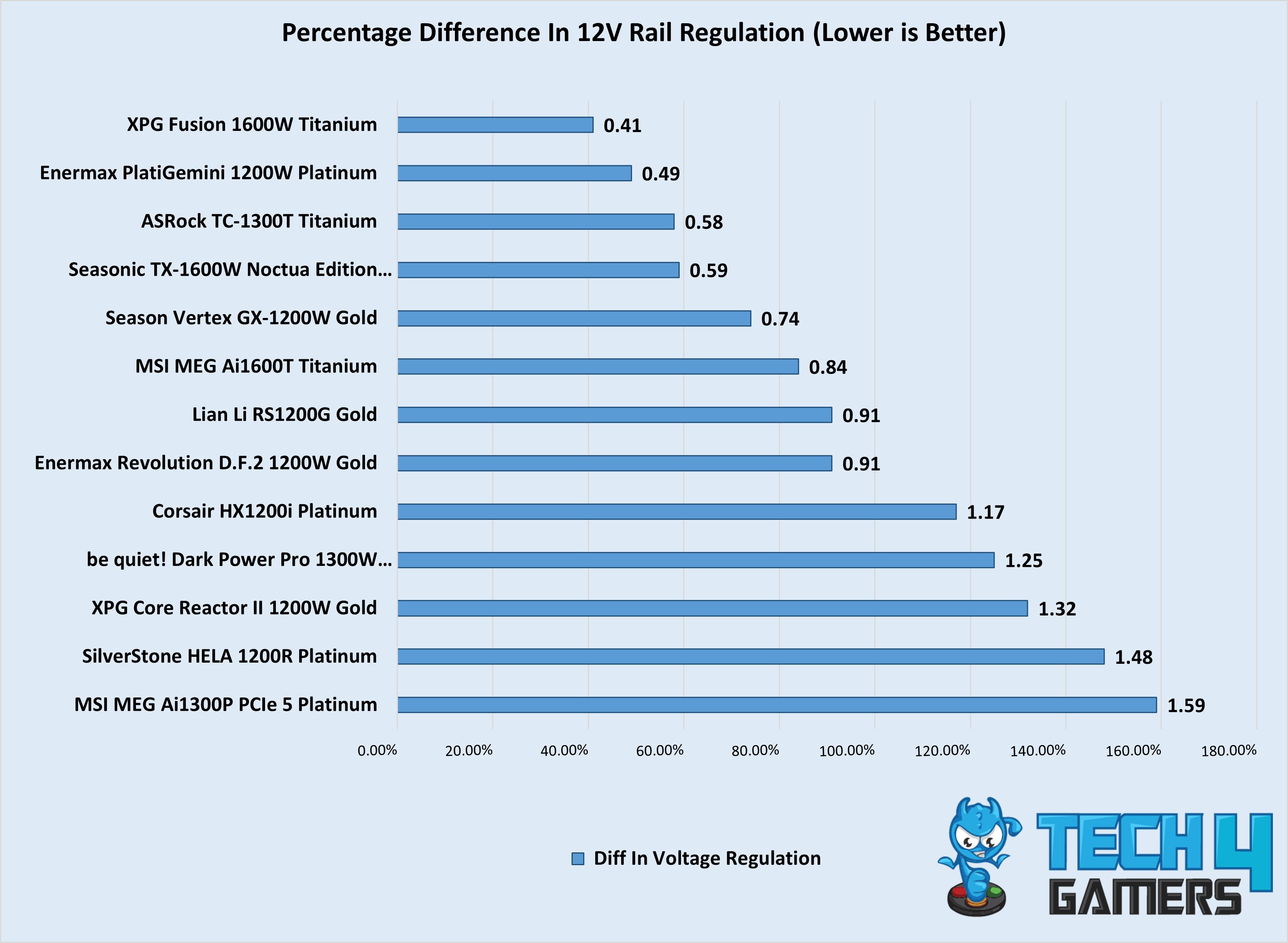 Lian Li RS1200G has excellent voltage regulation for 12V rail throughout different load variations.