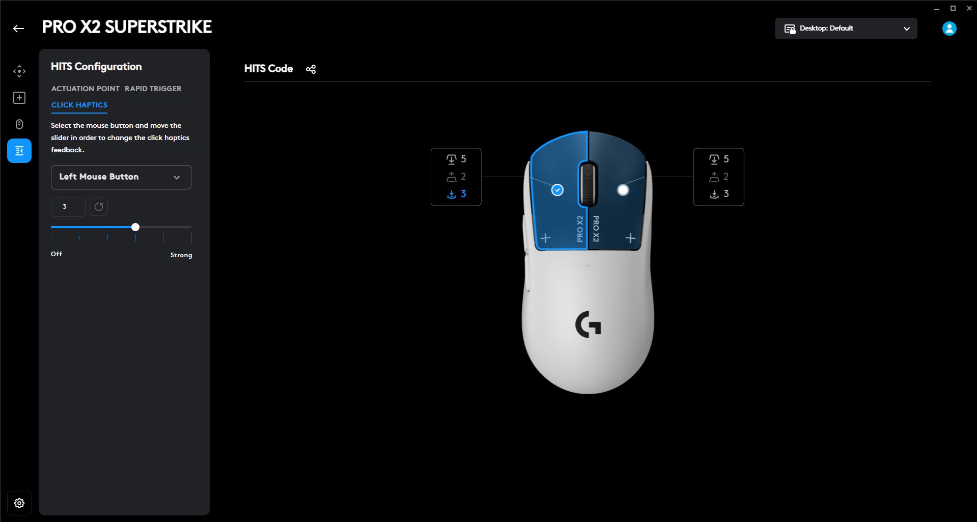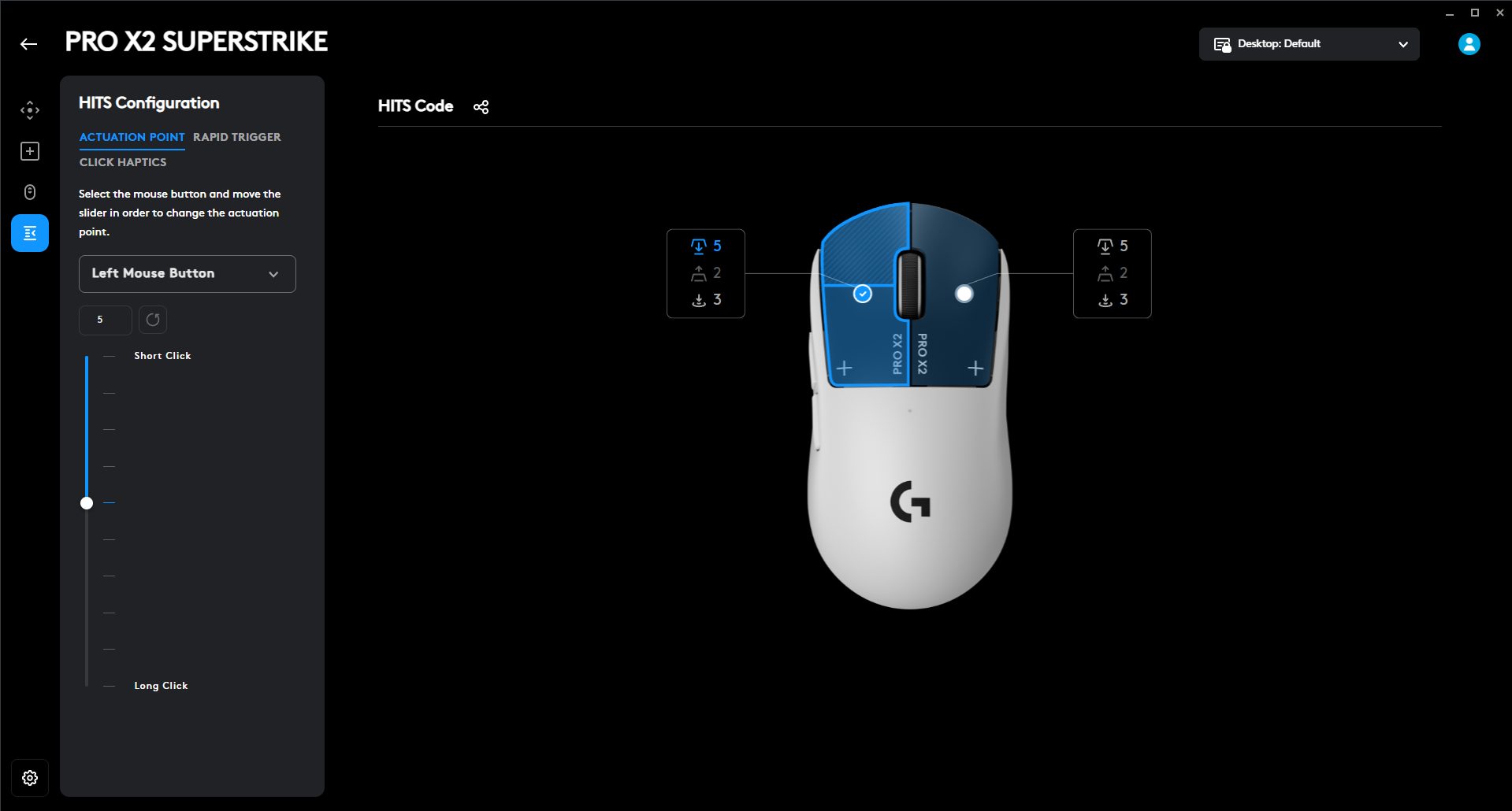 The Logitech Pro X2 Superstrike is deeply customizable with G Hub. You can tweak almost everything about how the mouse clicks, from how far you have to press to register to how quickly it resets. There are ten actuation steps, so you can dial in super-sensitive clicks or whatever suits your playstyle. You can pick which button you’re adjusting either from a dropdown menu or by clicking the mouse graphic directly in the software. The Rapid Trigger feature is adjustable with five levels, so you can experiment and find the sweet spot for yourself.
