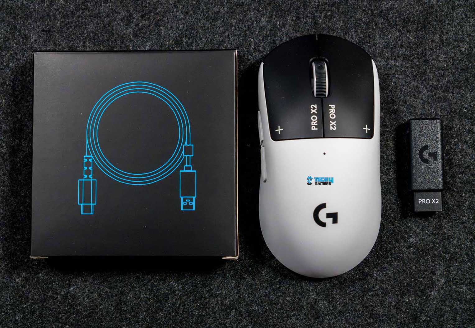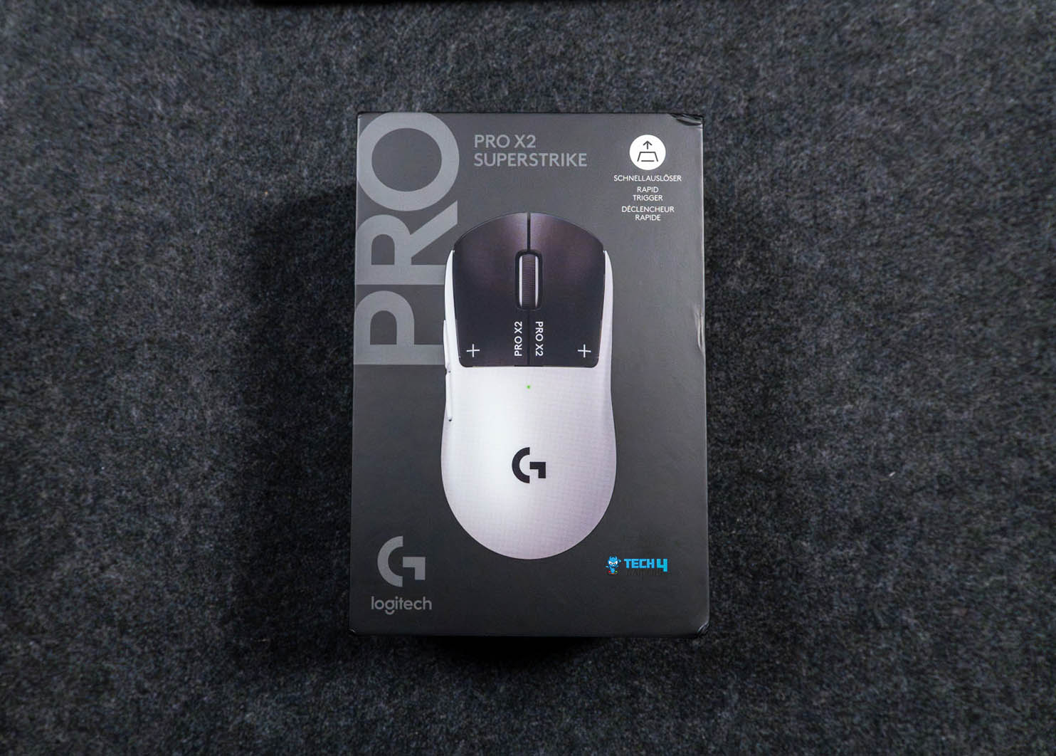 The box for the Logitech Pro X2 Superstrike is black, with a large image of the mouse on the front. Right next to it, you get the “Pro” branding and the model name. One side of the box lists the technical specs. On the other hand, you’ll spot logos of esports organizations. Flip the box around, and you’ll find a short list of notable features at the back. Now, when you open the box, the mouse is the first thing you see. It sits right on top in an insert.
