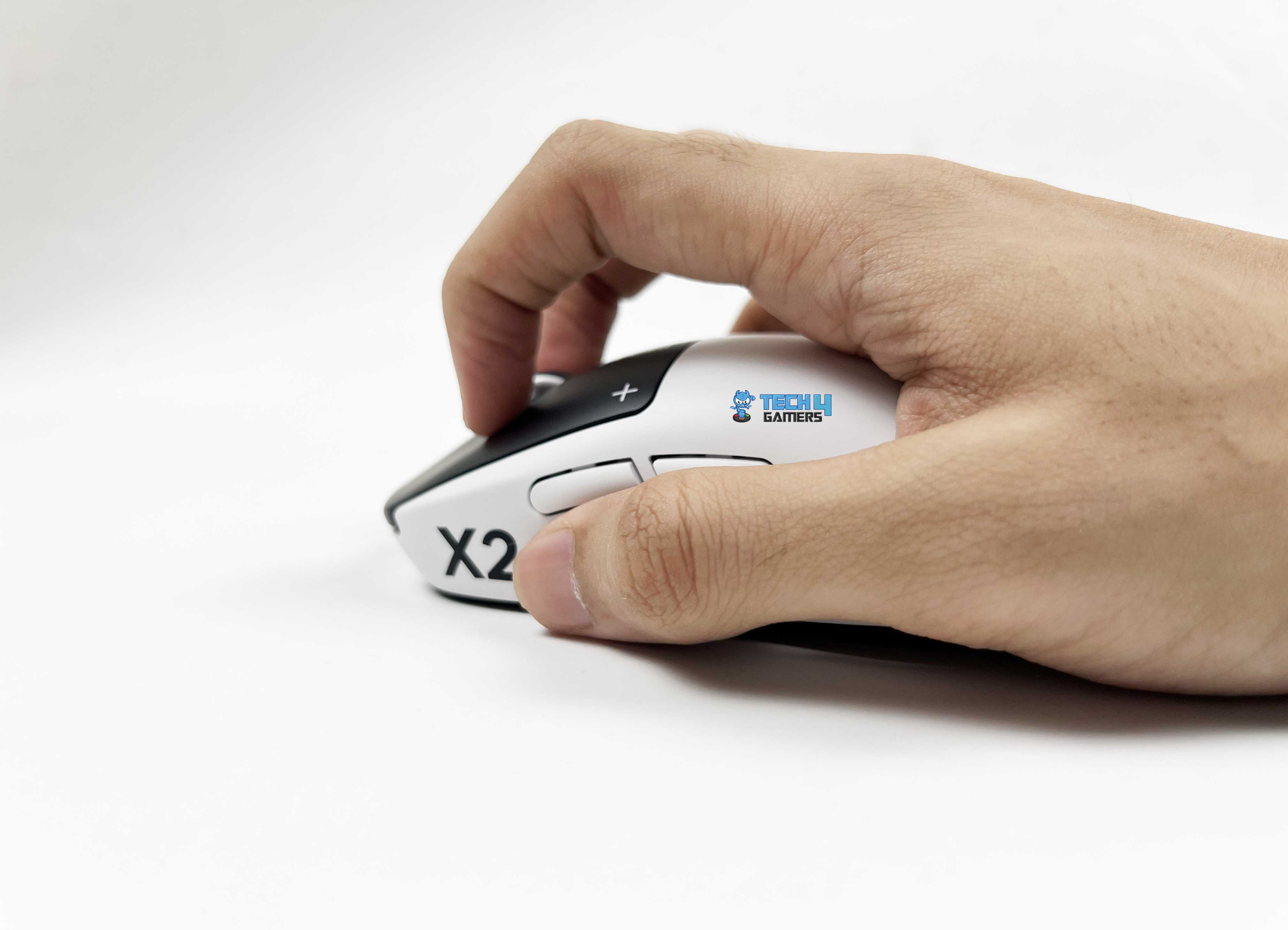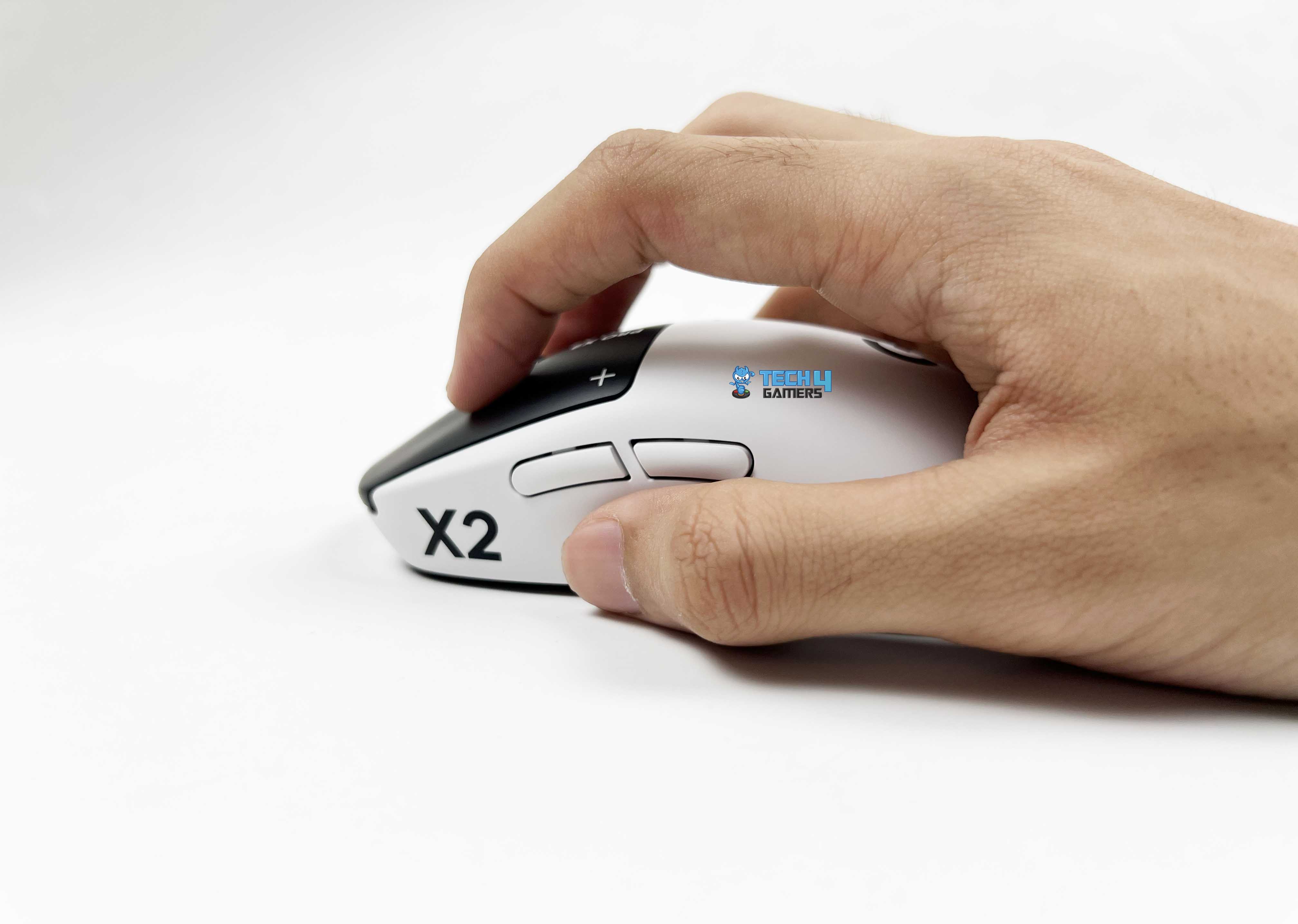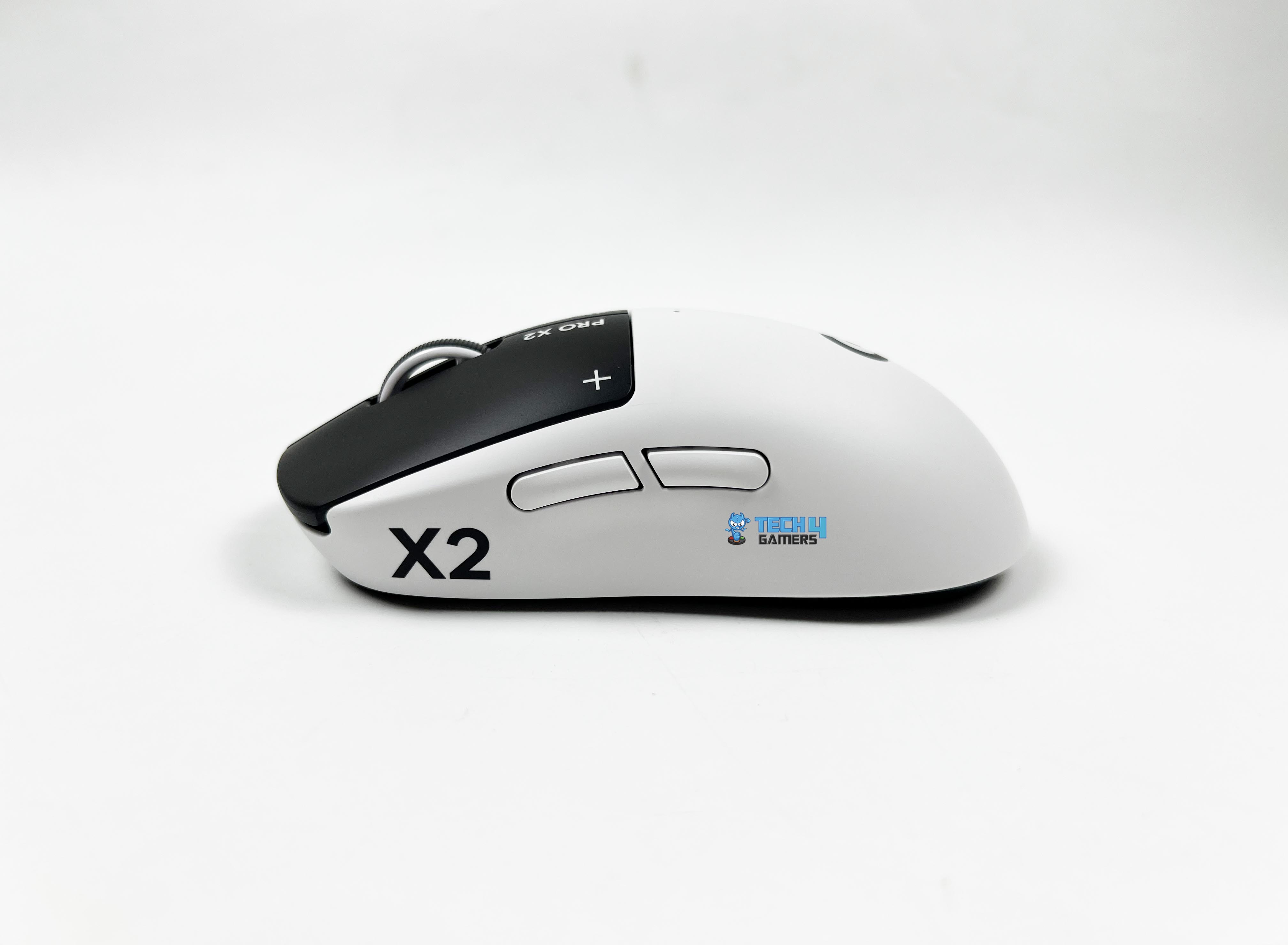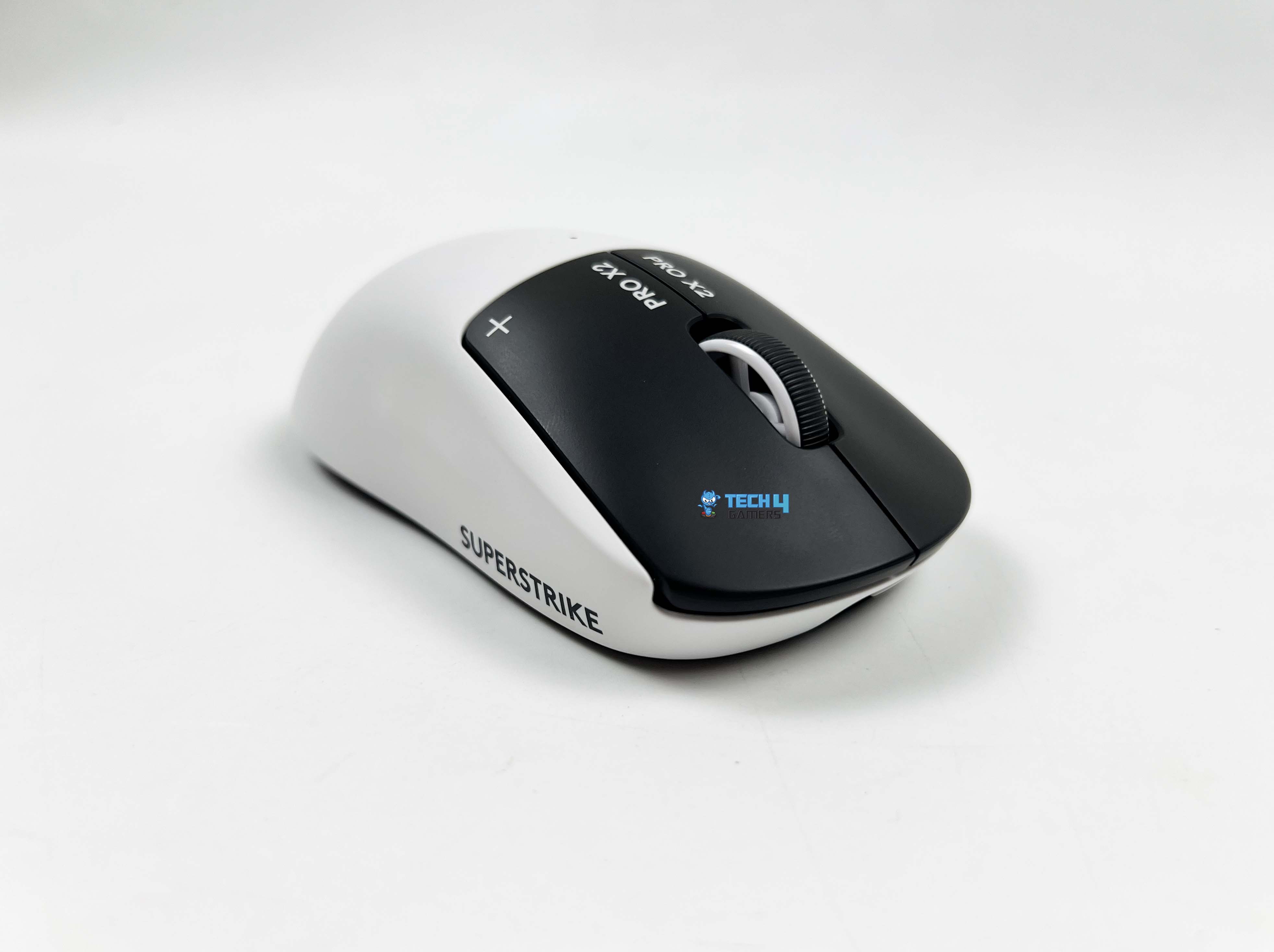 The Logitech Pro X2 Superstrike comes in the Lunar Eclipse colorway. In simple terms, it’s a mix of black and white. The shell and the sides are white. Then the primary buttons switch things up with a black finish. That contrast stands out right away. It’s not extravagant, but it’s noticeable. The black buttons frame the top of the mouse. It gives the design a bit of character. On the primary buttons, you’ll see “PRO X2” printed near the front. Next to it, there’s a small symbol. You could perceive it as a plus sign or maybe a crosshair.